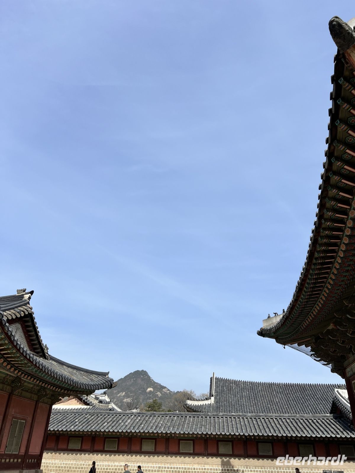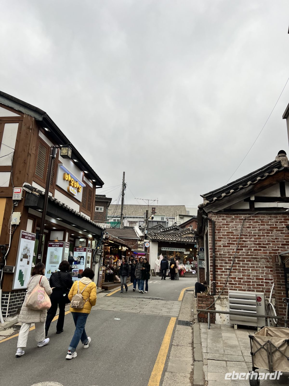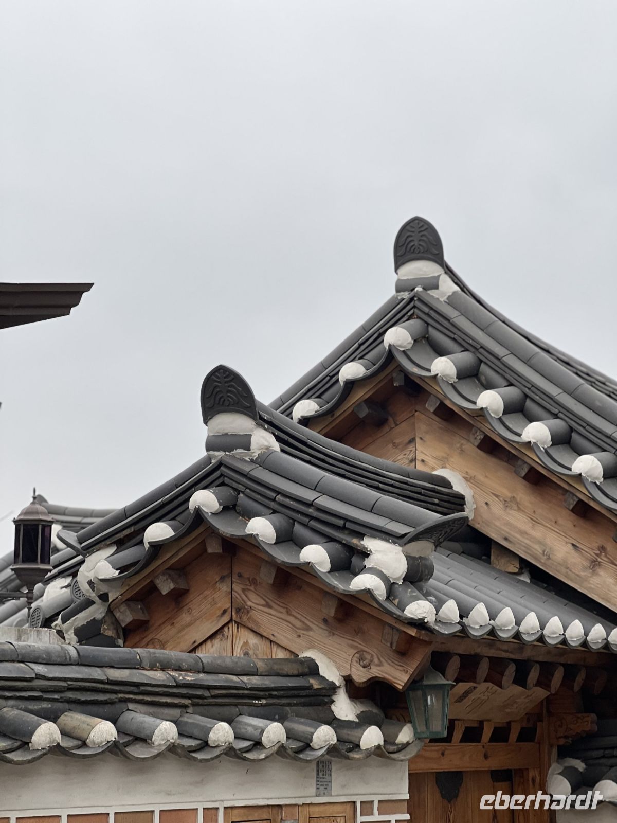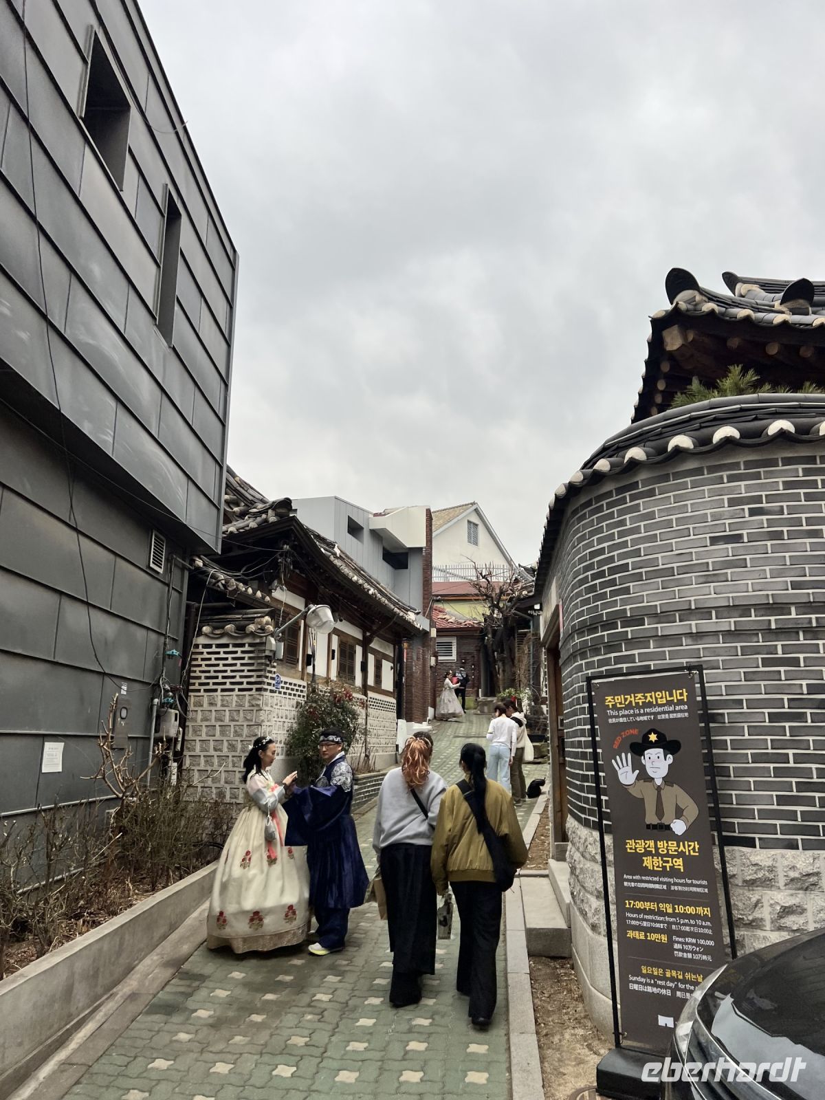 Unsere letzte Station vor dem Abendessen ist das Dorf Bukchon Hanok. Dieses Dorf liegt eingebettet zwischen den Palästen Gyeongbokgung und Changdeokgung. Diese Häuser blicken auf eine rund 600-jährige Geschichte der kaiserlichen Dynastie zurück und rund 900 traditionelle Hanok-Häuser, werden hier von Touristen aus aller Welt besichtigt. Die meisten Häuser sind noch bewohnt, weshalb wir besonders leise sein mussten, um die Bewohner nicht zu stören.