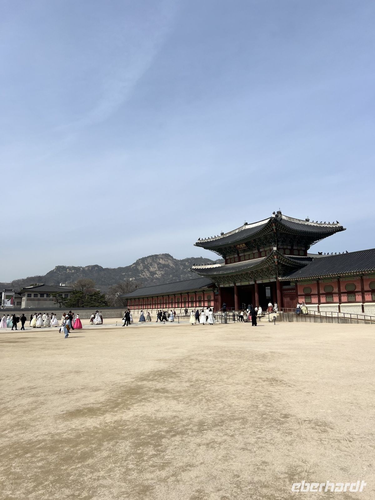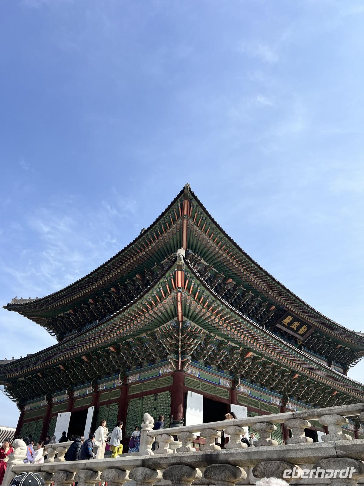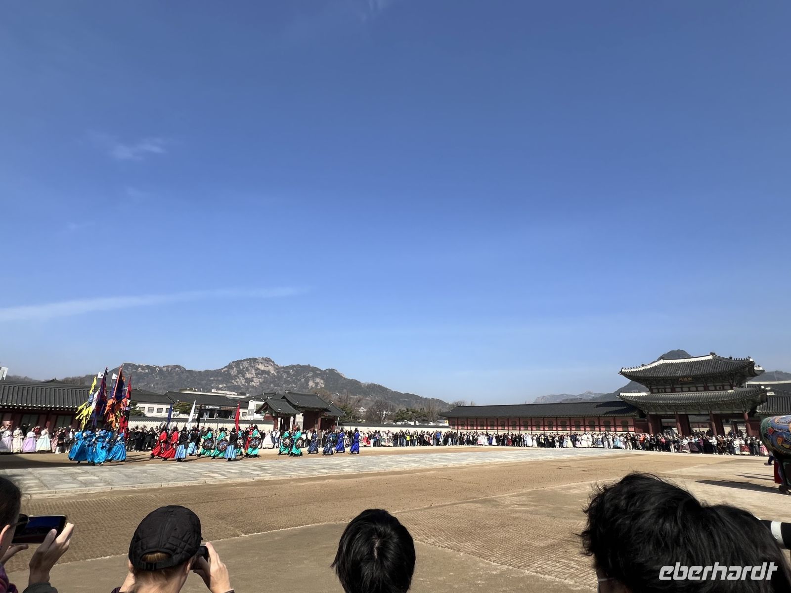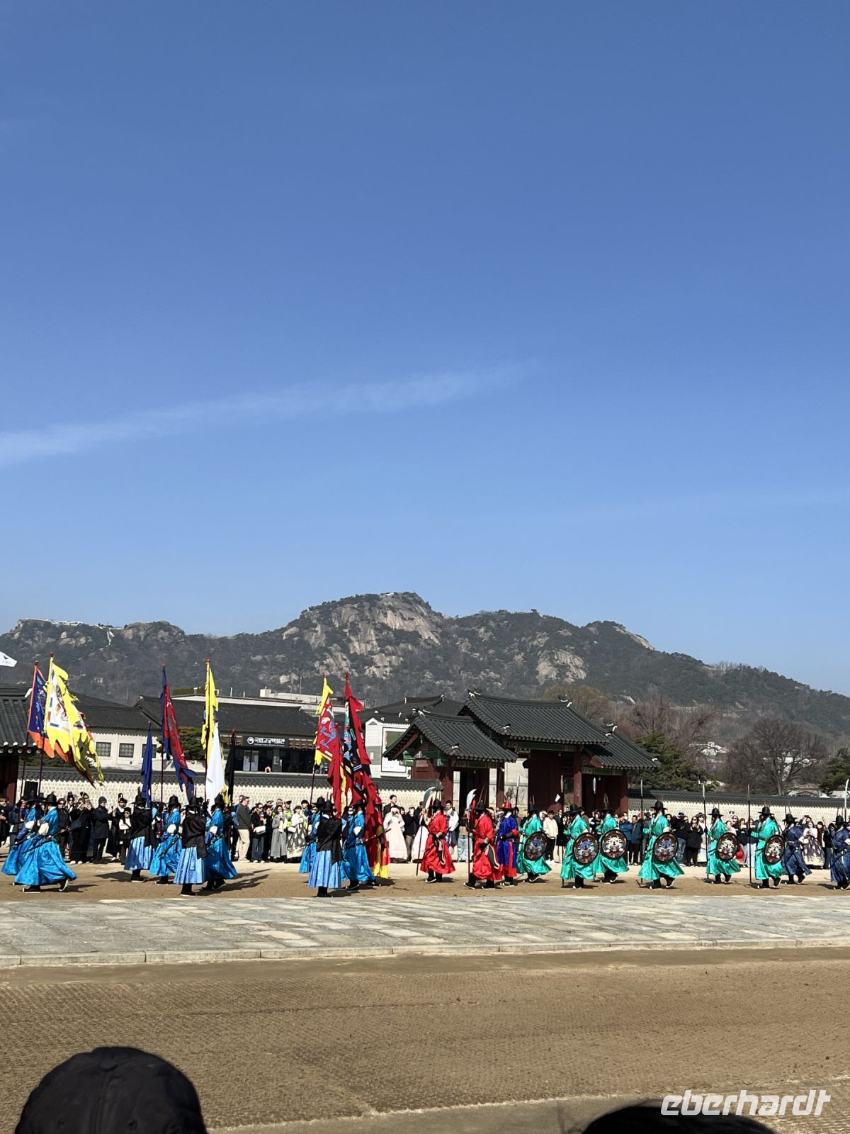 Heute begann unser Tag nach dem Frühstück im Hotel. Wir besichtigten zunächst den Bach Cheonggyecheon - dieser liegt 5 Meter unter dem Straßenniveau und fließt von Ost nach West. Die Länge des Baches beträgt 5,8 km und führt an mehreren Kunstinstallationen / Springbrunnen und 22 Brücken vorbei. Danach spazierten wir in den Kaiserpalast Gyeongbokgung - dieser ist der größte und älteste der fünf erhaltenen Königspaläste der Joseon-Dynastie. Wir erlebten einen offizielle Wachablösung und tauchten in die Geschichte der Dynastie ein. Zur Mittagszeit fuhren wir nach Insadong, um ein schmackhaftes Mittagessen einzunehmen. Unter anderem aßen wir Ramen und gefüllte Teigtaschen.