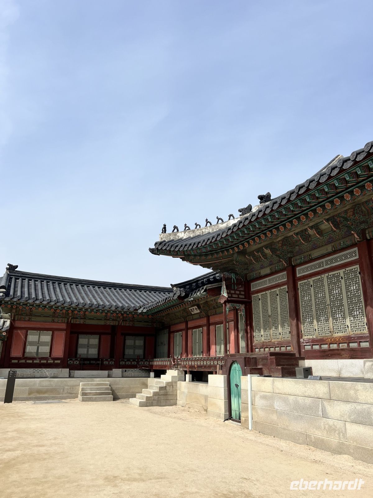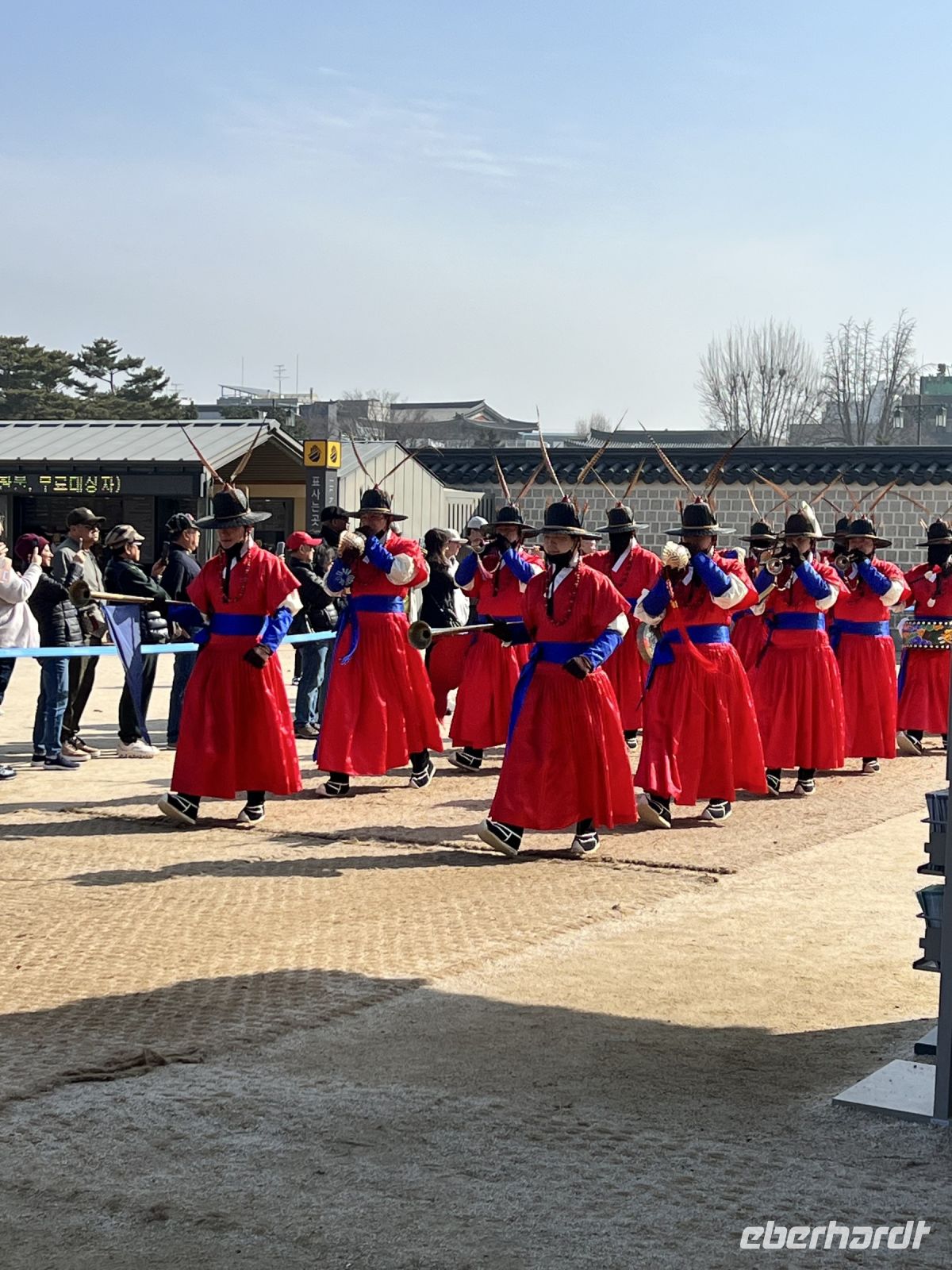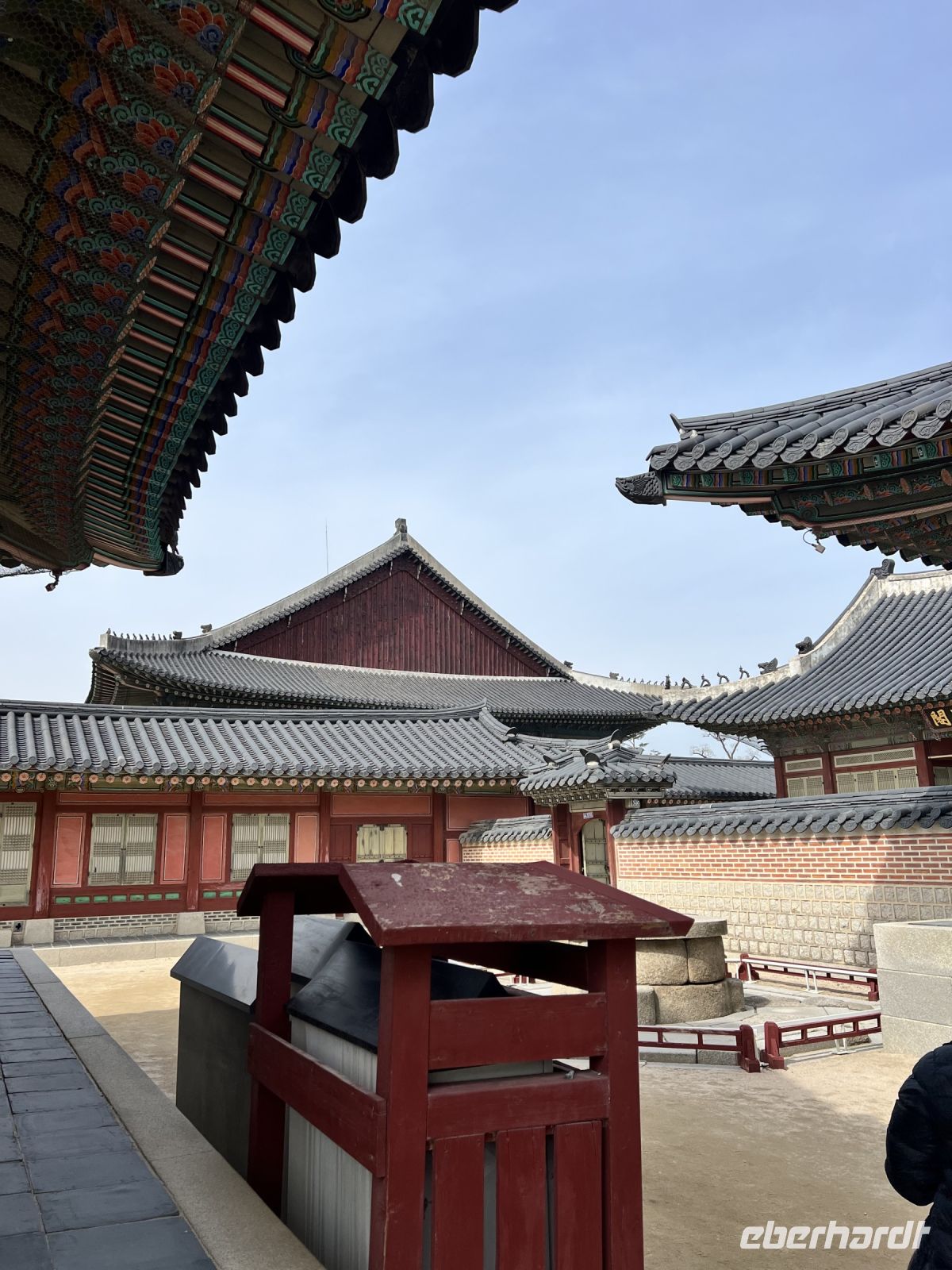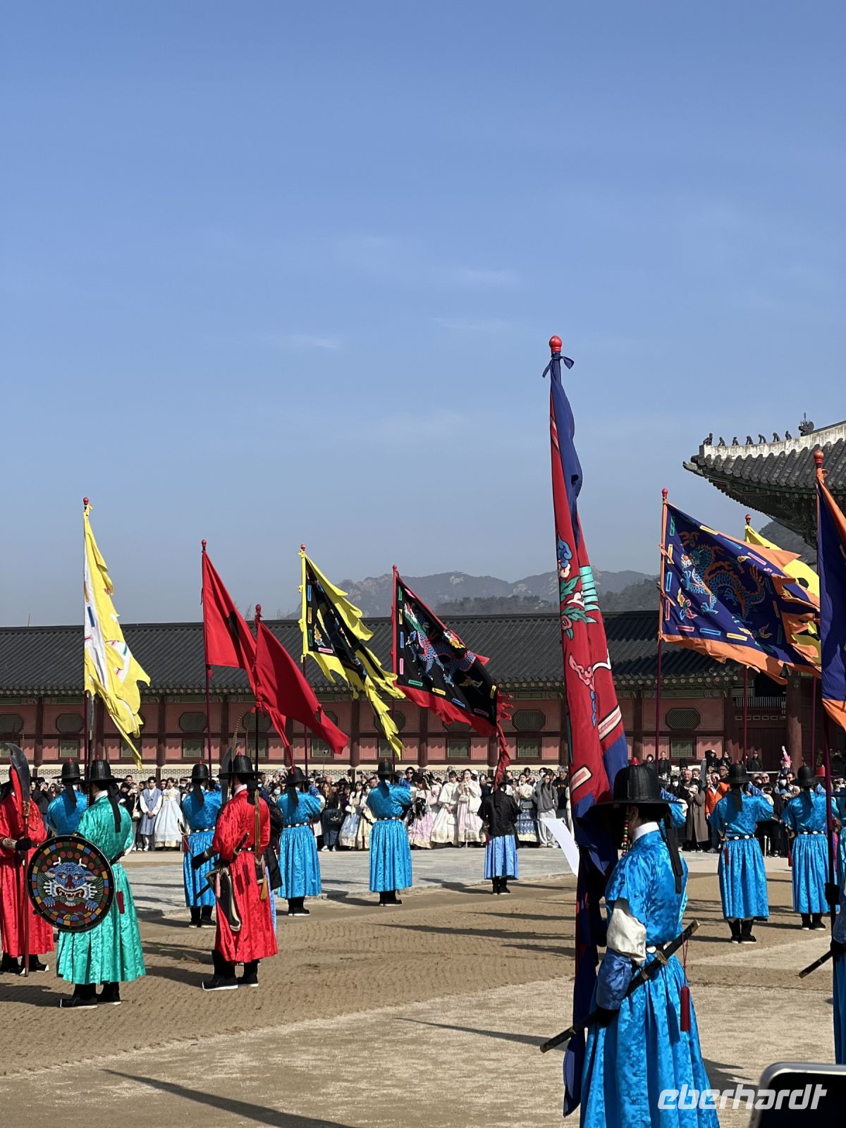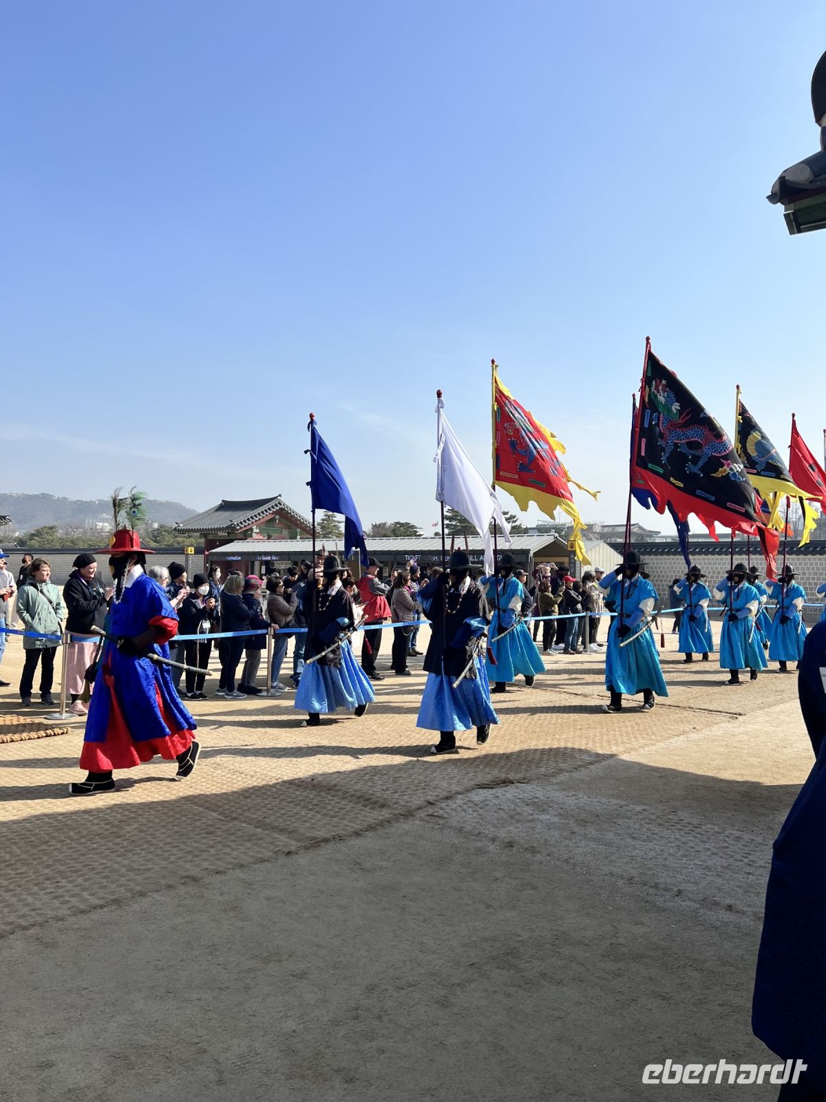 Heute begann unser Tag nach dem Frühstück im Hotel. Wir besichtigten zunächst den Bach Cheonggyecheon - dieser liegt 5 Meter unter dem Straßenniveau und fließt von Ost nach West. Die Länge des Baches beträgt 5,8 km und führt an mehreren Kunstinstallationen / Springbrunnen und 22 Brücken vorbei. Danach spazierten wir in den Kaiserpalast Gyeongbokgung - dieser ist der größte und älteste der fünf erhaltenen Königspaläste der Joseon-Dynastie. Wir erlebten einen offizielle Wachablösung und tauchten in die Geschichte der Dynastie ein. Zur Mittagszeit fuhren wir nach Insadong, um ein schmackhaftes Mittagessen einzunehmen. Unter anderem aßen wir Ramen und gefüllte Teigtaschen.