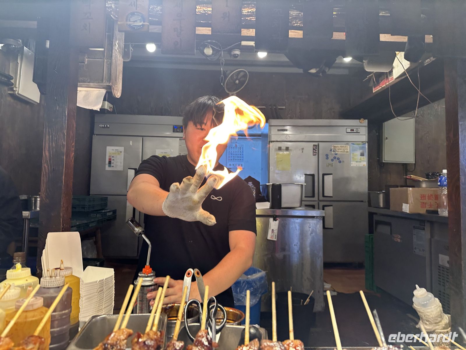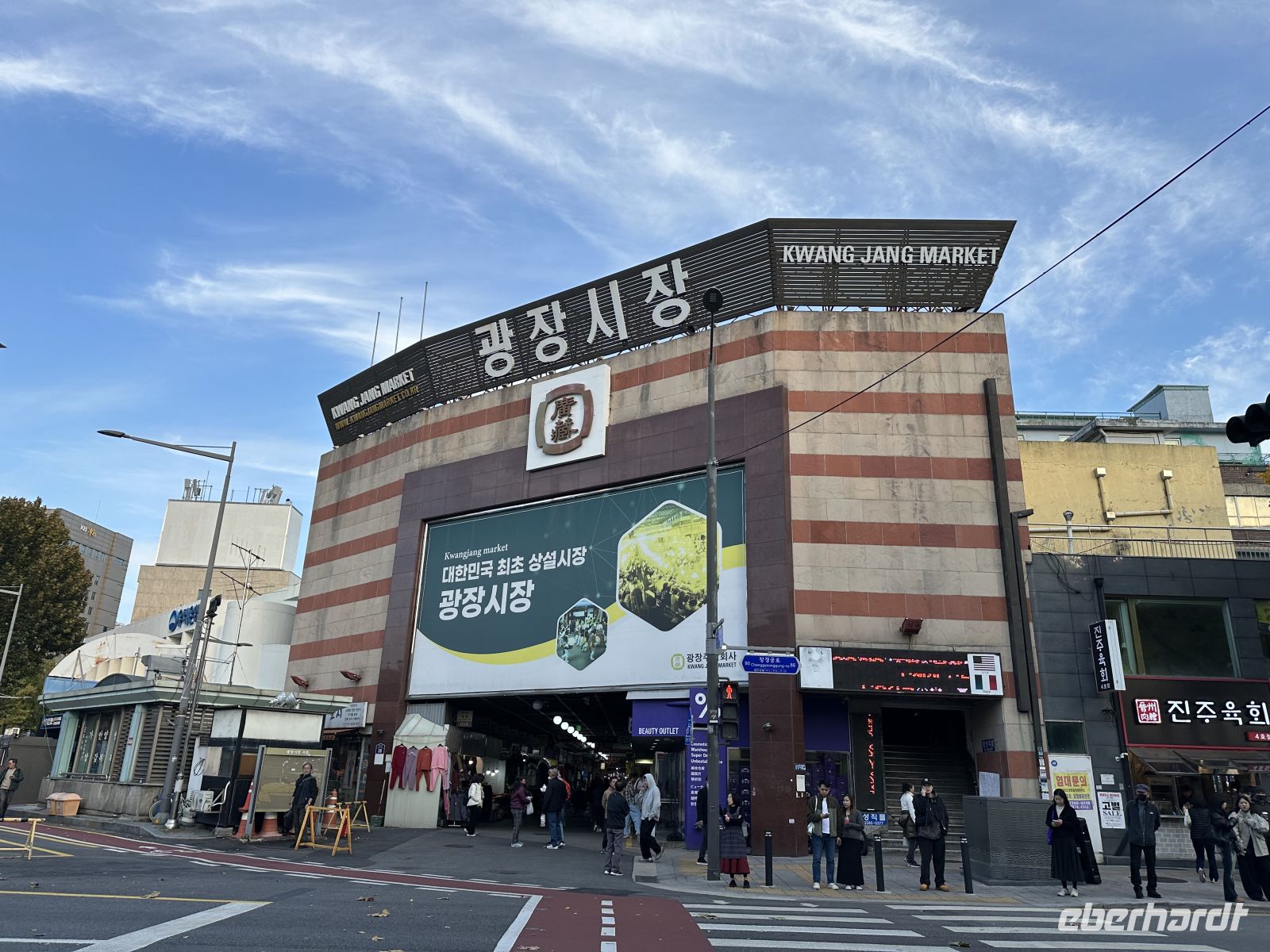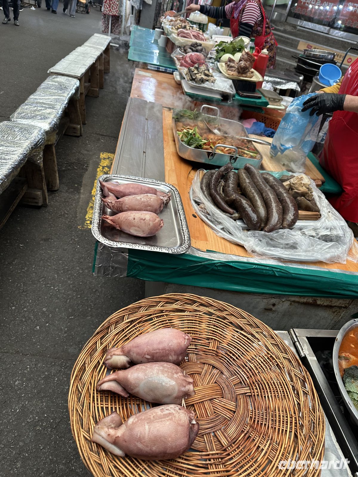 In den knapp neunzig Minuten, die wir vom Flughafen bis Seoul Stadtzentrum benötigen, stellt uns Kaya ihr Land und ihre Stadt vor. Unser erstes Ziel ist der N-Tower. Der N Seoul Tower (auch Namsan Tower genannt) ist das Wahrzeichen von Seoul und dient als Aussichts- und Fernsehturm. Er thront auf dem Berg Namsan mitten im Stadtzentrum, wodurch er von fast überall zu sehen ist. Heutzutage ist es verboten, dass touristische Reisebusse bis zum N-Tower fahren. Deshalb steigen wir um auf einen öffentlichen Bus. Im Fahrstuhl, der uns auf die Aussichtsplattform bringt, bekommen wir einen ersten Eindruck der südkoreanischen digitalen Technik, denn auf allen vier Wänden läuft ein 3-D-Film, der mit einem fulminanten Feuerwerk endet. Oben angekommen haben wir einen fantastischen Ausblick auf Seoul. Nimmt man anschließend die Treppe abwärts, so kommt man an einigen Cafés vorbei und Zeit für ein Käffchen wäre auch. Mit dem öffentlichen Bus fahren wir wieder eine Station zurück und steigen in unseren sehr komfortablen Reisebus um. Wir fahren zum Cheonggyecheon-Fluss (ausgesprochen: Tschong-gye-tschon), der eher an einen Kanal erinnert. Es ist aber kein natürlicher Kanal im herkömmlichen Sinne, sondern ein historischer Bach, der nach dem Koreakrieg überbaut und unter einer Stadtautobahn versteckt wurde. Anfang der 2000er-Jahre wurde er in einem städtebaulichen Projekt wieder freigelegt und wird heute als Ort der Kunst genutzt. Nach unserem Spaziergang fahren wir weiter zum Gwangjang Markt, einem der ältesten und bekanntesten traditionellen Märkte Seouls und ein Hotspot für kulinarische Erlebnisse.