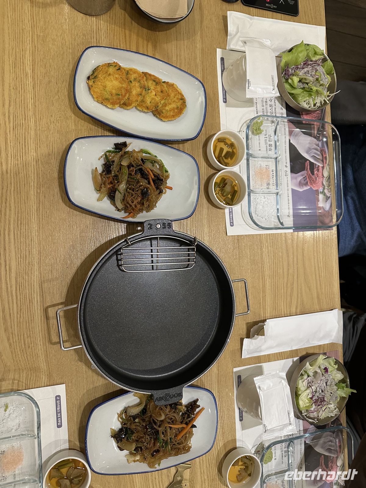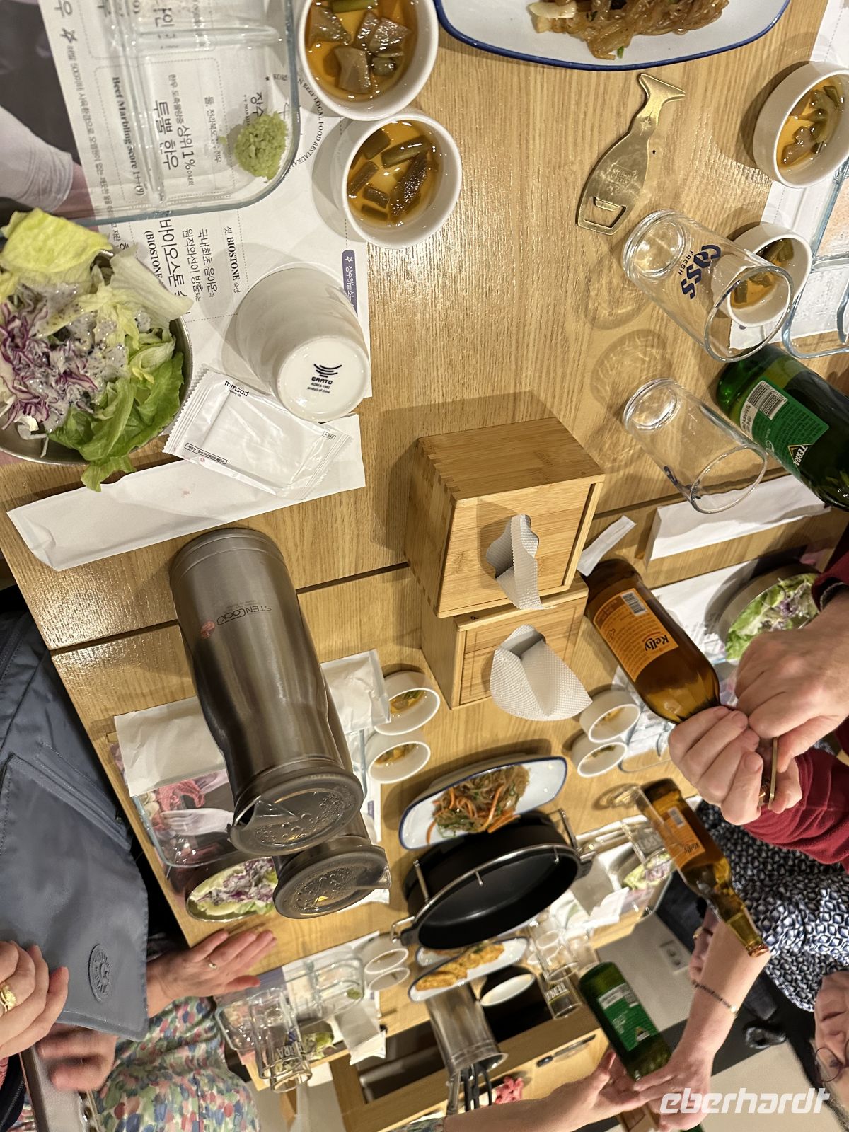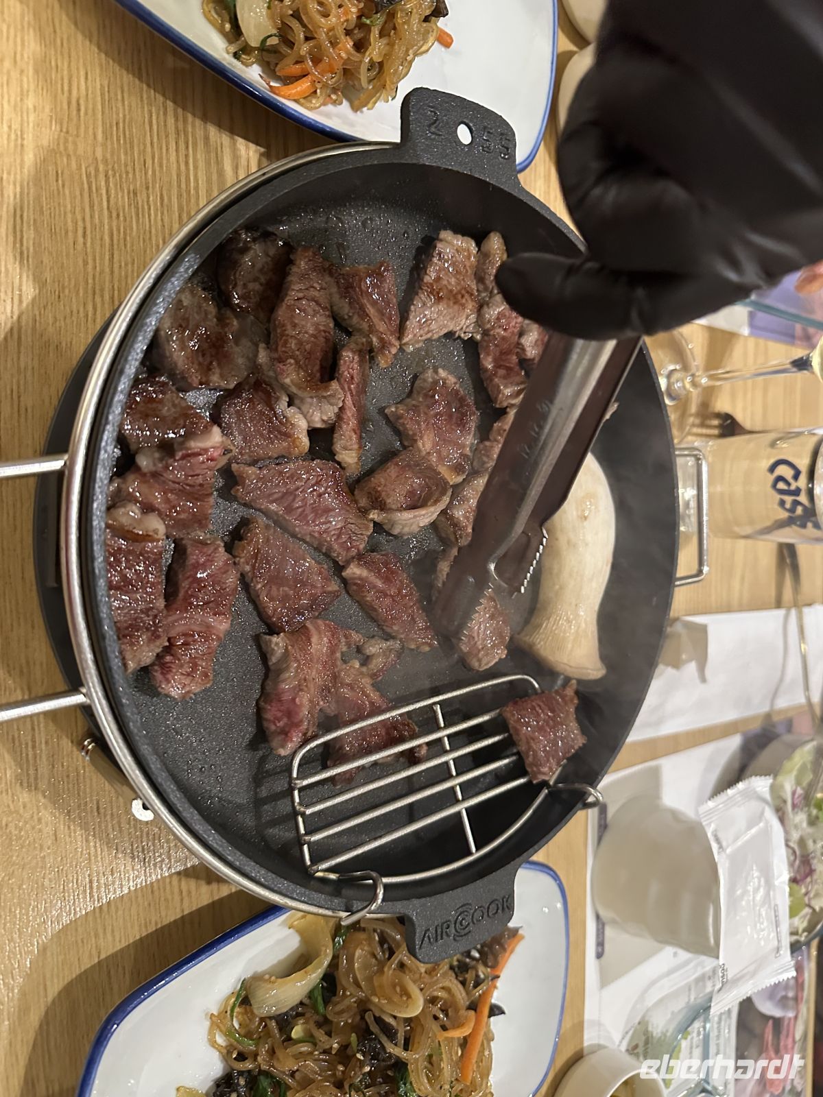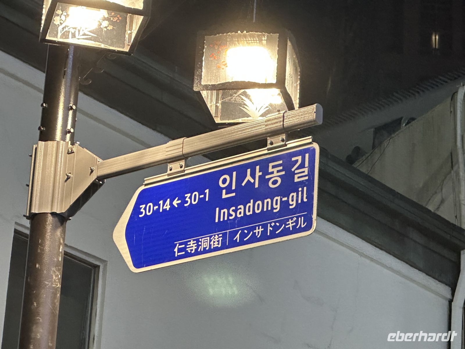 Mit dem Bus fahren wir zur berühmten Insadong-Straße. Kaya führt uns durch schmale Gässchen, kreuz und quer, bis wir unser Restaurant erreichen. Hier sind bereits die Tische für uns eingedeckt. Auf kleinen Tellern und Schüsseln sind die Beilagen vorbereitet und auf jedem Tisch steht eine Grillpfanne. Das Fleisch wird vom Personal ruckzuck mit einer Schere zerkleinert und vor unseren Augen zubereitet. Weitere Schüsseln werden gebracht, bis gar nichts mehr auf dem Tisch Platz hat. So sitzen wir gemütlich beisammen und lernen uns bei angenehmen Gesprächen kennen. Nachdem alle in kürzester Zeit gesättigt sind, unternehmen wir einen abendlichen Spaziergang auf der Insadong-Straße. Allerdings ist es recht ruhig hier, fast alle Geschäfte sind geschlossen und die Leute nach Hause gegangen. So machen wir das auch. Unser freundlicher Busfahrer sammelt uns ein und bringt uns zurück zum Hotel. Gute Nacht alle zusammen, schlaft recht schön.