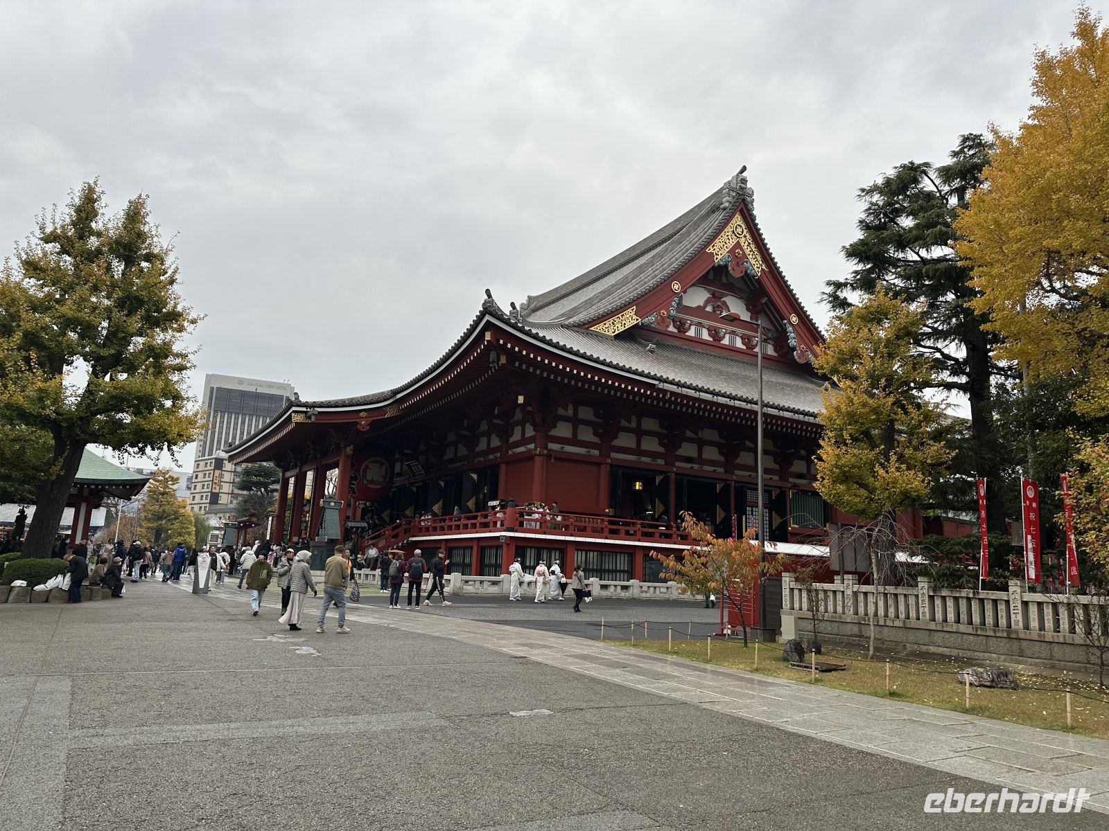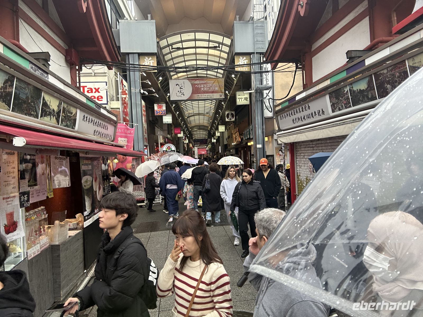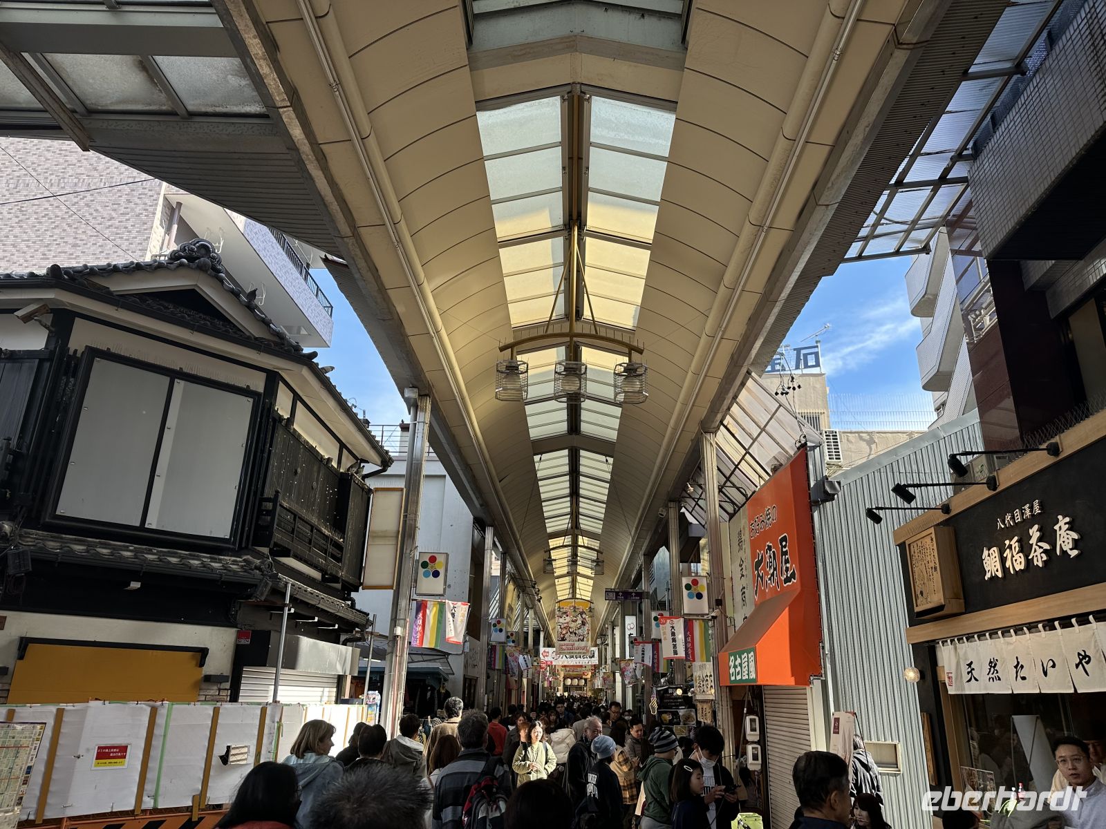 Unser Besuch beginnt aber erstmal mit dem Kaminarimon, dem imposanten Eingangstor mit seiner riesigen, roten Laterne, das als Wahrzeichen von Asakusa und ganz Tokio gilt. Hinter dem Tor erstreckt sich die Nakamise-dori, eine belebte, traditionelle Einkaufsstraße, die zum Haupttempel führt. Hier werden seit Jahrhunderten Souvenirs, Kunsthandwerk und lokales Street Food verkauft. Und wir haben wunderbarer Weise sogar Zeit für Einkäufe und Sushi-Essen.