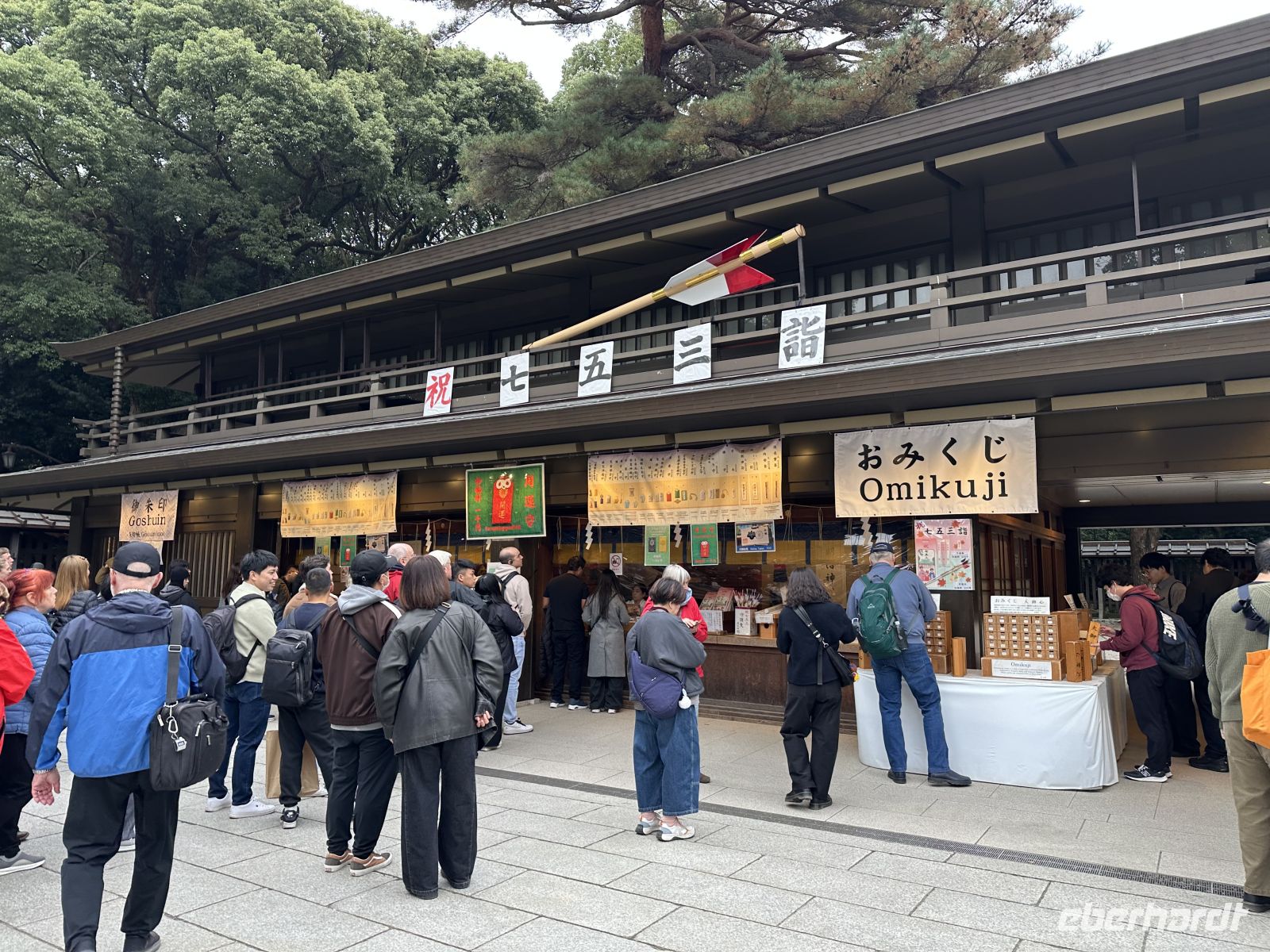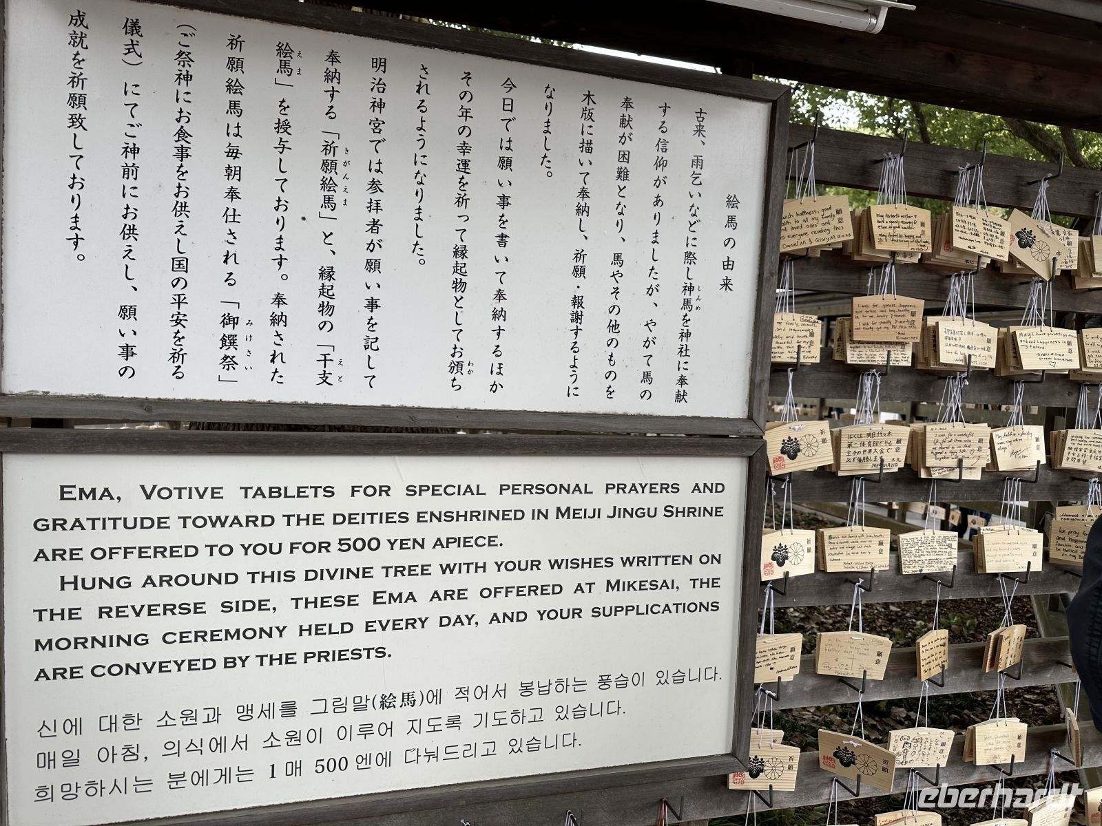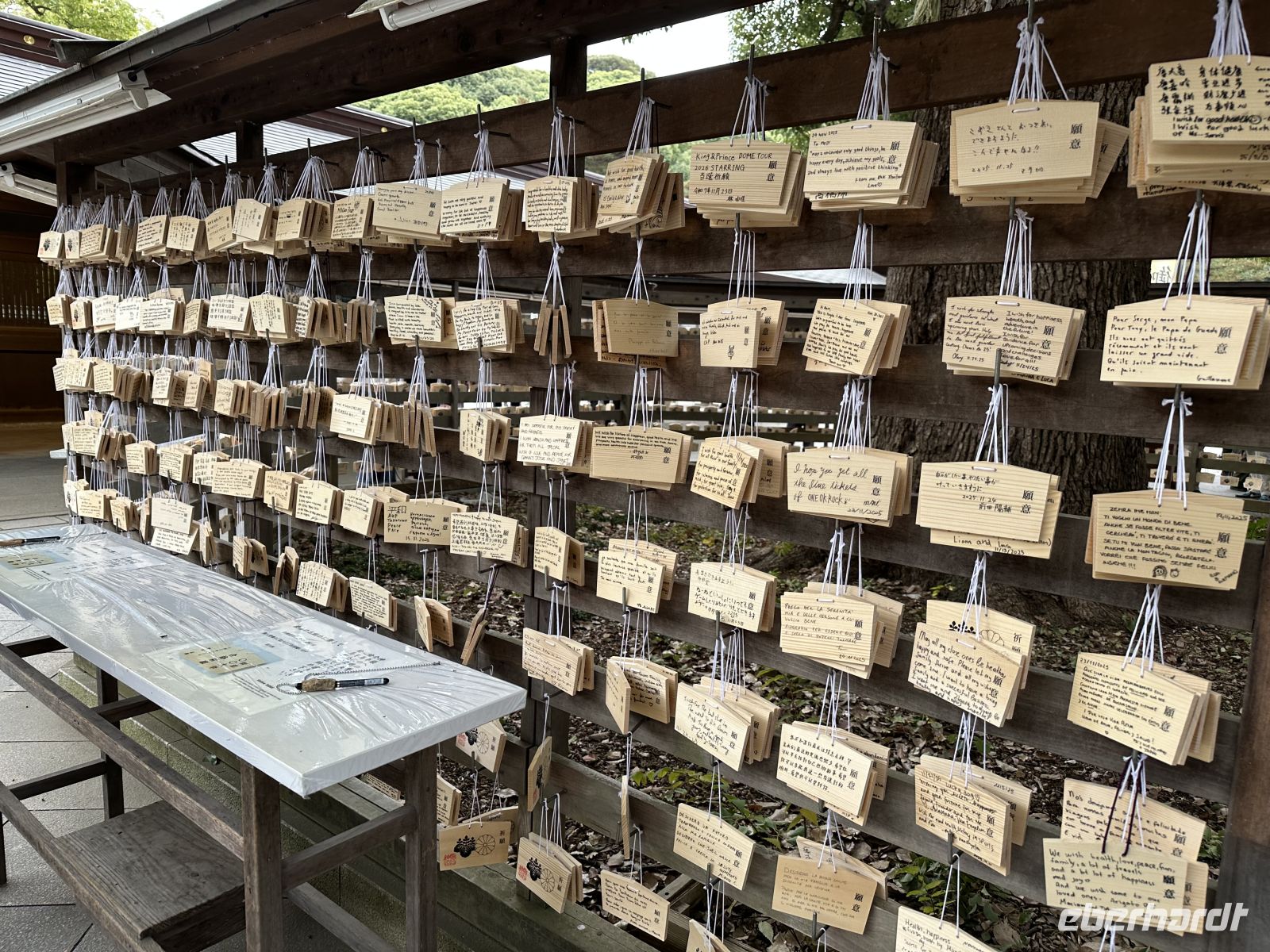In der Nähe des Hauptschreins befinden sich Bereiche, in denen wir Ema (kleine Holztafeln für Wünsche) aufhängen oder Omikuji (Glückszettel) ziehen können. Selbstverständlich lassen wir uns das nicht entgehen.
