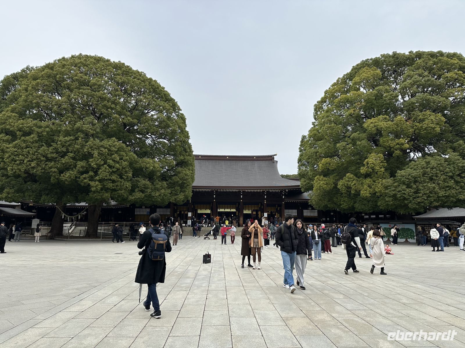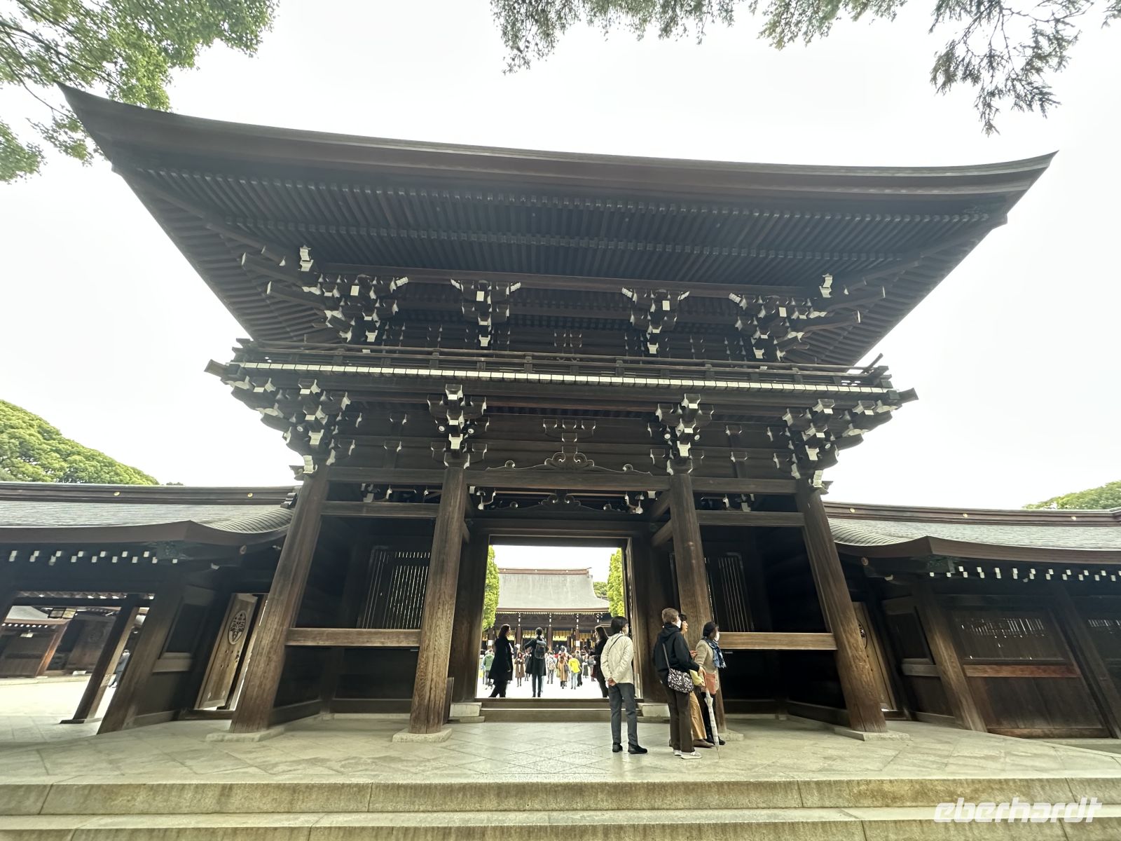 Unser Besuch beginnt mit dem Durchqueren des äußere Torii, eines der größten Holz-Torii Japans. Die massiven Holzbalken markieren den Übergang vom weltlichen Raum zum heiligen Raum des Schreins. Nach dem Torii gehen wir einen langen, breiten Kiesweg entlang, der von einem dichten, künstlich angelegten Wald aus rund 100.000 Bäumen gesäumt wird. Diese Bäume wurden aus ganz Japan gespendet.