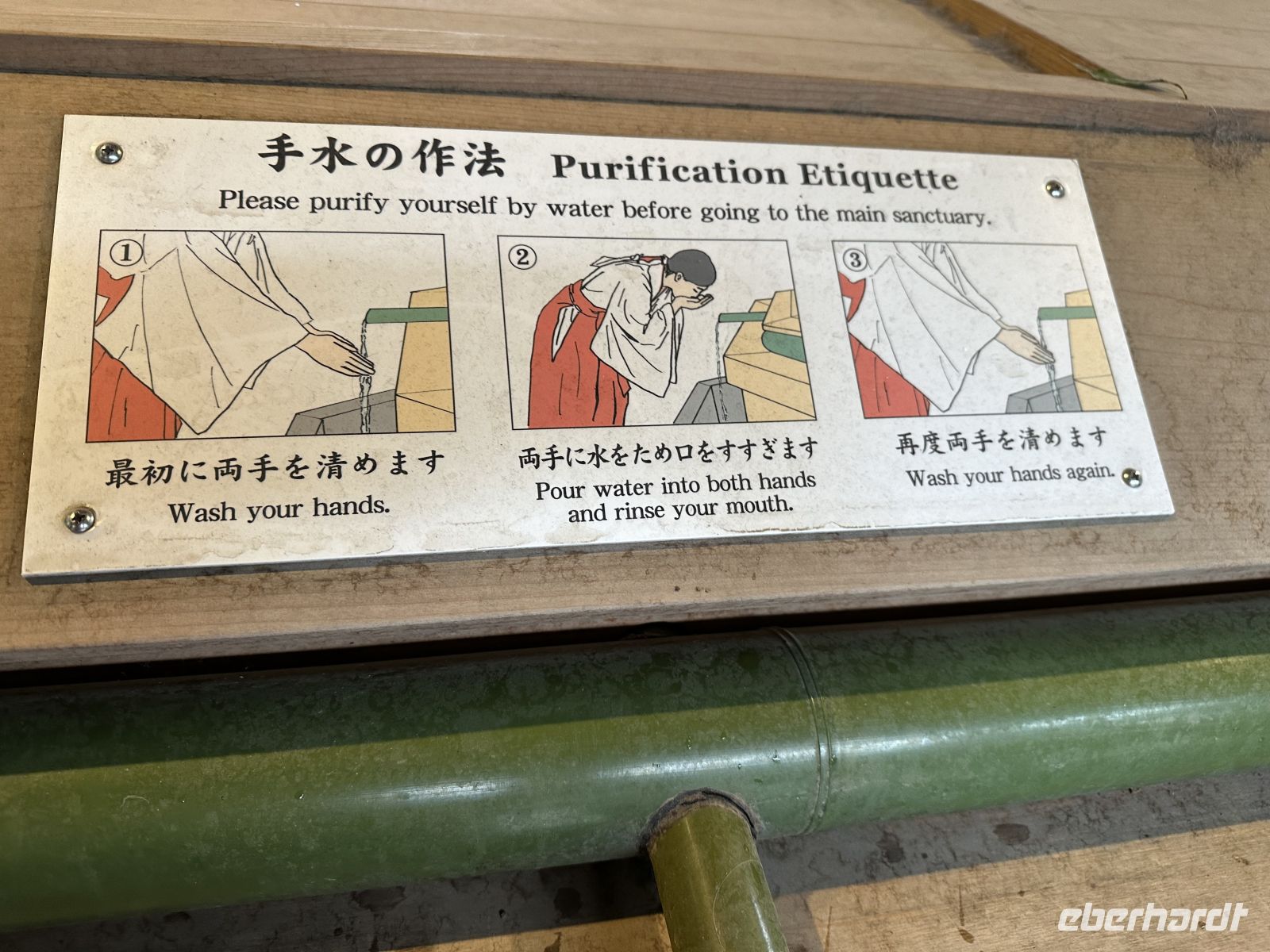 Auf dem Weg passieren wir eine dekorative Ansammlung von Sake-Fässern, die von Sake-Brauern als Opfergaben an die Kami, welche Shinto Gottheiten sind, gespendet wurden. Wir durchqueren ein weiteres, großes Torii, das uns in den inneren Bezirk des Schreins führt. Bevor wir den Hauptbereich betreten, kommen wir an eine Wasserstelle. Thomas zeigt uns das hier übliche Ritual: Hände und Mund werden mit dem fließenden Wasser gereinigt, um Körper und Geist zu säubern. Der Schrein selbst besteht aus schlichten, aber würdevollen Gebäuden im traditionellen Shinto-Stil, oft mit kupfergedeckten Dächern und Verzierungen aus dunklem Holz. Wir betreten den Hauptgebetshof und lernen von Thomas das Gebet nach den üblichen Shinto-Regeln: