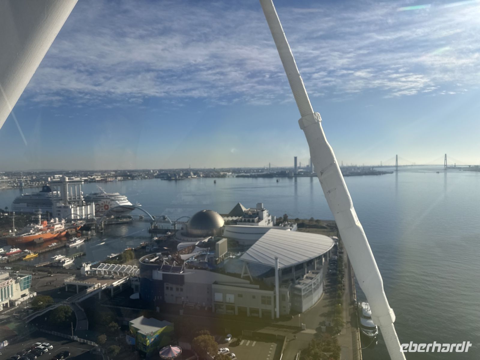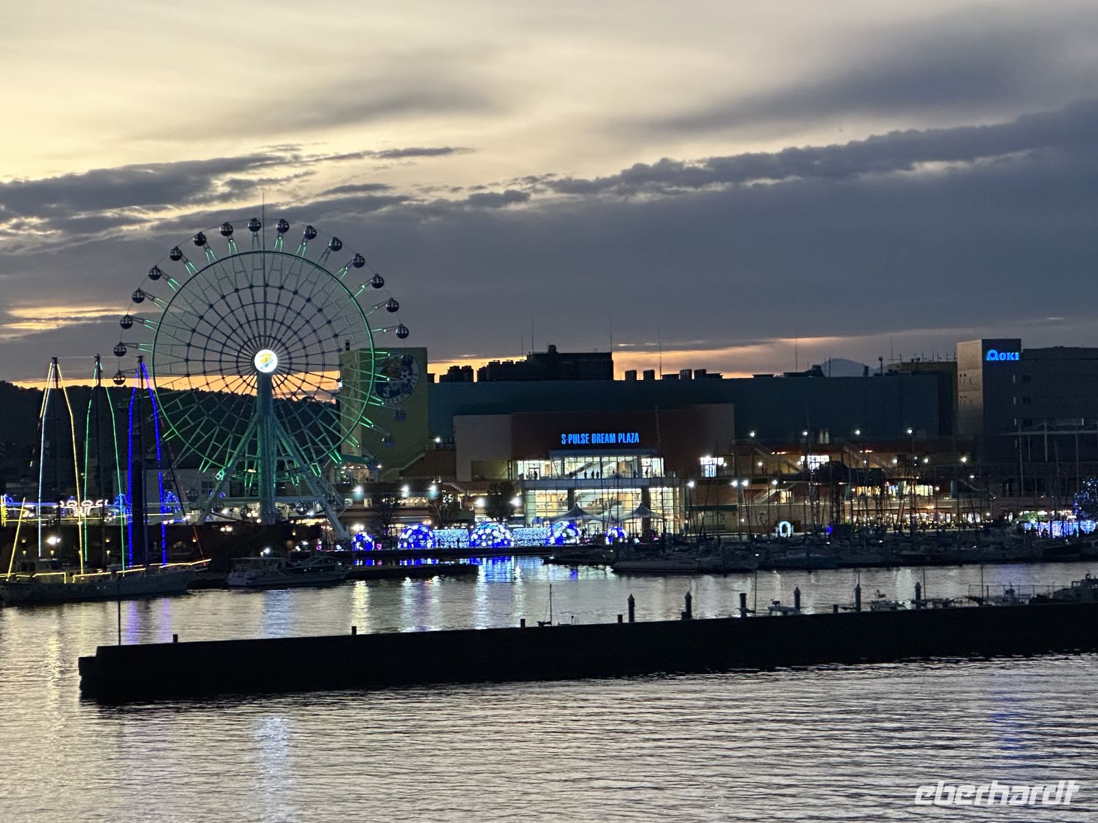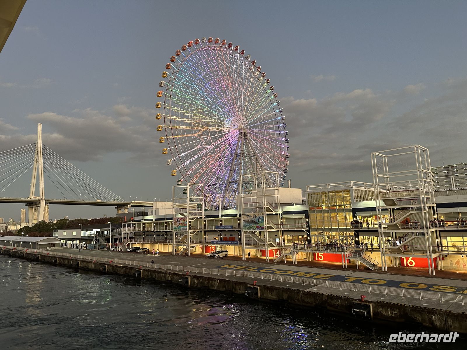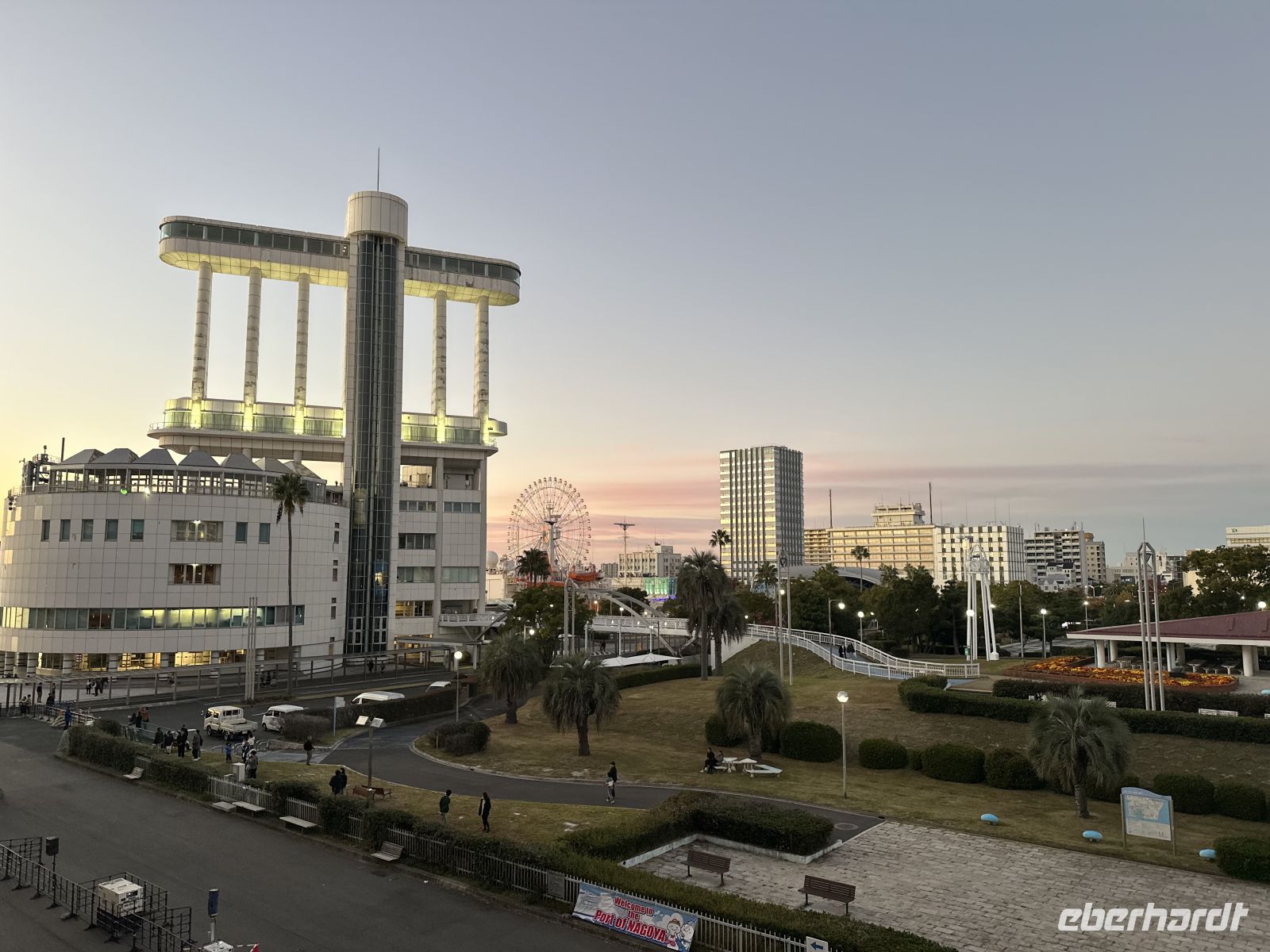Unser nächstes Ziel ist der Besuch des Osu Kannon Tempels, der eine faszinierende Mischung aus Spiritualität, Geschichte und lebendigem urbanem Leben bieten soll. Der Tempel selbst ist ein buddhistischer Tempel der Shingon-Sekte, der mitten im Herzen des lebhaften Ōsu-Viertels liegt. Er dient als eine Oase der Ruhe und Beschaulichkeit inmitten des Trubels der angrenzenden Einkaufsstraßen. Und hier kommt der heutige Konflikt: Kultur oder Kulinarik? Für beides nacheinander reicht die Zeit nicht aus. Der heutige Tempel ist eine Rekonstruktion aus dem 20. Jahrhundert, da der ursprüngliche Bau aus dem Jahr 1333 im Laufe der Geschichte, unter anderem durch Brände und Kriegsschäden, zerstört wurde. Im Zentrum der Verehrung steht eine große, geschnitzte Holzstatue der Kannon, der Göttin der Barmherzigkeit, die der Tempel seinem Namen verdankt. Unterhalb der Haupthalle befindet sich das Shinpukuji-Athenäum oder auch die Tempel-Bücherei. Es beherbergt eine außergewöhnlich wertvolle Sammlung von über 15.000 klassischen chinesischen und japanischen Texten. Darunter befinden sich Kopien des Kojiki, der ältesten überlieferten Chronik der japanischen Frühgeschichte und Mythologie. Der Tempel ist das spirituelle Zentrum des umliegenden Osu-Viertels, einem der bekanntesten Einkaufs- und Kulturviertel Nagoyas. Die angrenzende, überdachte Einkaufspassage ist ein regelrechtes Netz aus Gängen und Gassen, so groß als ob es ein ganzes Stadtviertel ist. Hier kann man japanischen Tee oder Kimonos kaufen oder sich durch die lokale Küche futtern. Auf unserem Wunschzettel steht heute Miso, in der Annahme, dass es sich um eine Suppe handelt. Allerdings, wie ich nun las, ist Miso eigentlich ein Gewürz, kein Wunder, dass die Bedienung der Restaurants uns immer kopfschüttelnd abgewiesen hat, nein Miso hätten sie nicht. In der kleinen Kaschemme, die wir dann ausfindig machen, ist der Wirt klever und erkennt in uns Touristen, denen man alle unterjubeln kann. Ja, Miso hätte er. Er serviert uns eine braune Suppe, die ein bisschen nach Maggi schmeckt, für uns aber als leckere Miso-Suppe durchgeht (Hauptsache lokal). Da die Suppe doch eher übersichtlich ist, was die Sättigung betrifft, bestellen wir noch Sashimi nach und der Wirt zaubert uns eine wundervolle Platte mit exklusiven Köstlichkeiten. Und eine andere Besonderheit erleben wir hier noch. Neben uns hat eine junge Japanerin Platz genommen, die sich Sake bestellt. Dieser wird aus einer riesigen Flasche – vielleicht 1,5 Liter – eingeschenkt. Das Glas steht in einem viereckigen Kästchen und es wird so viel Sake eingegossen, bis auch das Kästchen voll ist. Das wollen wir auch! Zum großen Erstaunen unserer Gastgeber bestellen wir dieses besondere Getränk auch für uns. Nun, geschmacklich ist es eben Sake, aber die Prozedur macht es hier aus. Nach diesem lokalen Erlebnis müssen wir rennen, um pünktlich am Bus zu sein, was wir nicht schaffen, wir sind fünf Minuten zu spät (peinlich). Am Nachmittag haben wir noch Zeit, das Hafengelände auf eigene Faust zu erkunden. Mit dem Riesenrad (das scheint es hier in jedem Hafen zu geben) geht es hoch hinaus und wir haben einen fantastischen Blick auf unser Schiff und die Stadt. Alternativ gibt es direkt im Hafengebäude einen Turm, auf den man gegen eine kleine Gebühr fahren kann.