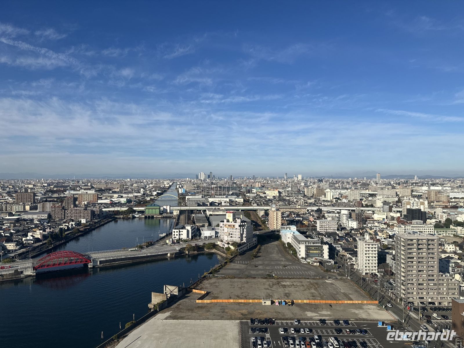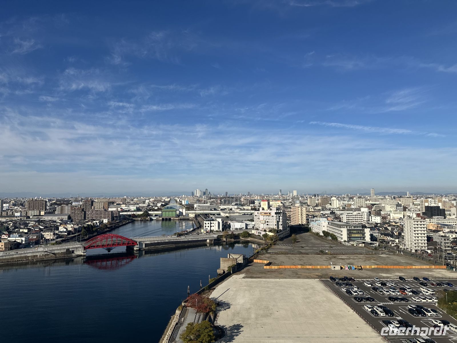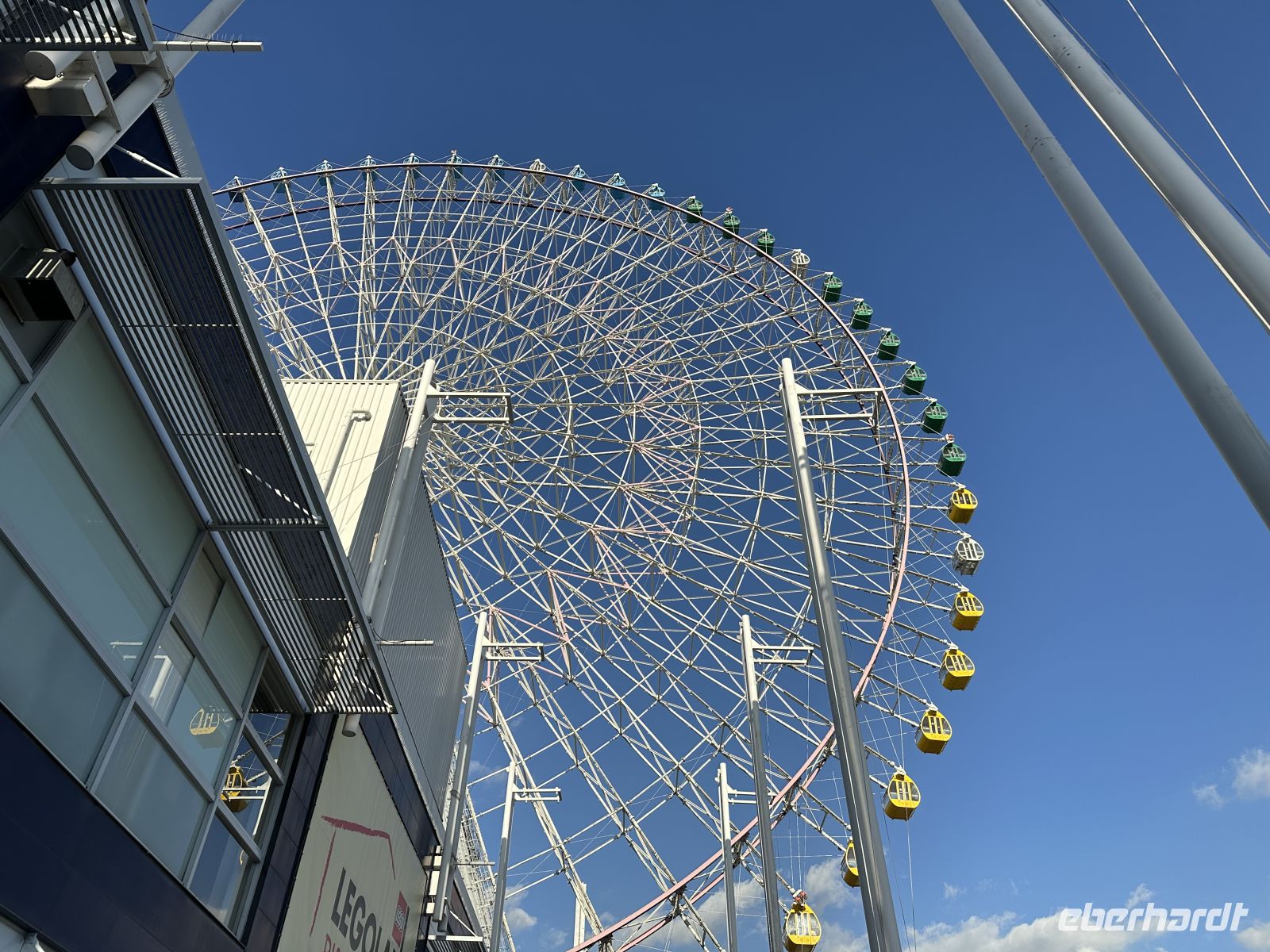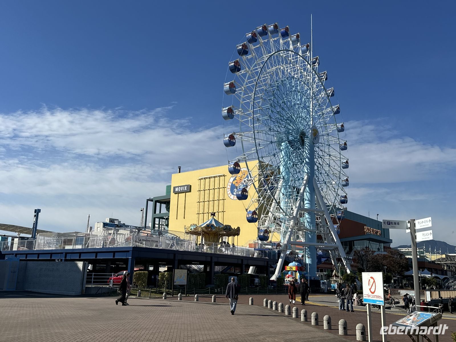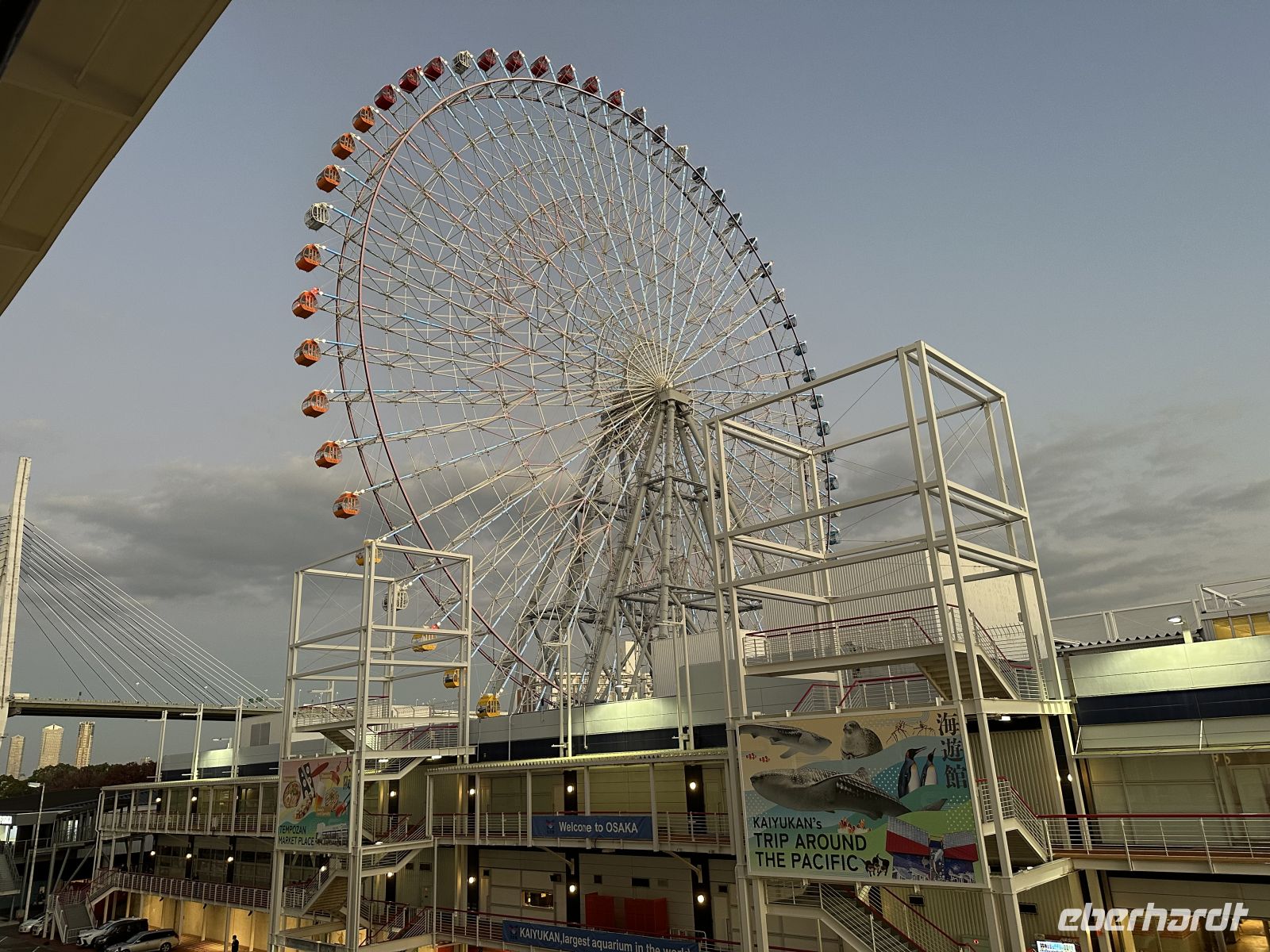 Unser nächstes Ziel ist der Besuch des Osu Kannon Tempels, der eine faszinierende Mischung aus Spiritualität, Geschichte und lebendigem urbanem Leben bieten soll. Der Tempel selbst ist ein buddhistischer Tempel der Shingon-Sekte, der mitten im Herzen des lebhaften Ōsu-Viertels liegt. Er dient als eine Oase der Ruhe und Beschaulichkeit inmitten des Trubels der angrenzenden Einkaufsstraßen. Und hier kommt der heutige Konflikt: Kultur oder Kulinarik? Für beides nacheinander reicht die Zeit nicht aus. Der heutige Tempel ist eine Rekonstruktion aus dem 20. Jahrhundert, da der ursprüngliche Bau aus dem Jahr 1333 im Laufe der Geschichte, unter anderem durch Brände und Kriegsschäden, zerstört wurde. Im Zentrum der Verehrung steht eine große, geschnitzte Holzstatue der Kannon, der Göttin der Barmherzigkeit, die der Tempel seinem Namen verdankt. Unterhalb der Haupthalle befindet sich das Shinpukuji-Athenäum oder auch die Tempel-Bücherei. Es beherbergt eine außergewöhnlich wertvolle Sammlung von über 15.000 klassischen chinesischen und japanischen Texten. Darunter befinden sich Kopien des Kojiki, der ältesten überlieferten Chronik der japanischen Frühgeschichte und Mythologie. Der Tempel ist das spirituelle Zentrum des umliegenden Osu-Viertels, einem der bekanntesten Einkaufs- und Kulturviertel Nagoyas. Die angrenzende, überdachte Einkaufspassage ist ein regelrechtes Netz aus Gängen und Gassen, so groß als ob es ein ganzes Stadtviertel ist. Hier kann man japanischen Tee oder Kimonos kaufen oder sich durch die lokale Küche futtern. Auf unserem Wunschzettel steht heute Miso, in der Annahme, dass es sich um eine Suppe handelt. Allerdings, wie ich nun las, ist Miso eigentlich ein Gewürz, kein Wunder, dass die Bedienung der Restaurants uns immer kopfschüttelnd abgewiesen hat, nein Miso hätten sie nicht. In der kleinen Kaschemme, die wir dann ausfindig machen, ist der Wirt klever und erkennt in uns Touristen, denen man alle unterjubeln kann. Ja, Miso hätte er. Er serviert uns eine braune Suppe, die ein bisschen nach Maggi schmeckt, für uns aber als leckere Miso-Suppe durchgeht (Hauptsache lokal). Da die Suppe doch eher übersichtlich ist, was die Sättigung betrifft, bestellen wir noch Sashimi nach und der Wirt zaubert uns eine wundervolle Platte mit exklusiven Köstlichkeiten. Und eine andere Besonderheit erleben wir hier noch. Neben uns hat eine junge Japanerin Platz genommen, die sich Sake bestellt. Dieser wird aus einer riesigen Flasche – vielleicht 1,5 Liter – eingeschenkt. Das Glas steht in einem viereckigen Kästchen und es wird so viel Sake eingegossen, bis auch das Kästchen voll ist. Das wollen wir auch! Zum großen Erstaunen unserer Gastgeber bestellen wir dieses besondere Getränk auch für uns. Nun, geschmacklich ist es eben Sake, aber die Prozedur macht es hier aus. Nach diesem lokalen Erlebnis müssen wir rennen, um pünktlich am Bus zu sein, was wir nicht schaffen, wir sind fünf Minuten zu spät (peinlich). Am Nachmittag haben wir noch Zeit, das Hafengelände auf eigene Faust zu erkunden. Mit dem Riesenrad (das scheint es hier in jedem Hafen zu geben) geht es hoch hinaus und wir haben einen fantastischen Blick auf unser Schiff und die Stadt. Alternativ gibt es direkt im Hafengebäude einen Turm, auf den man gegen eine kleine Gebühr fahren kann.