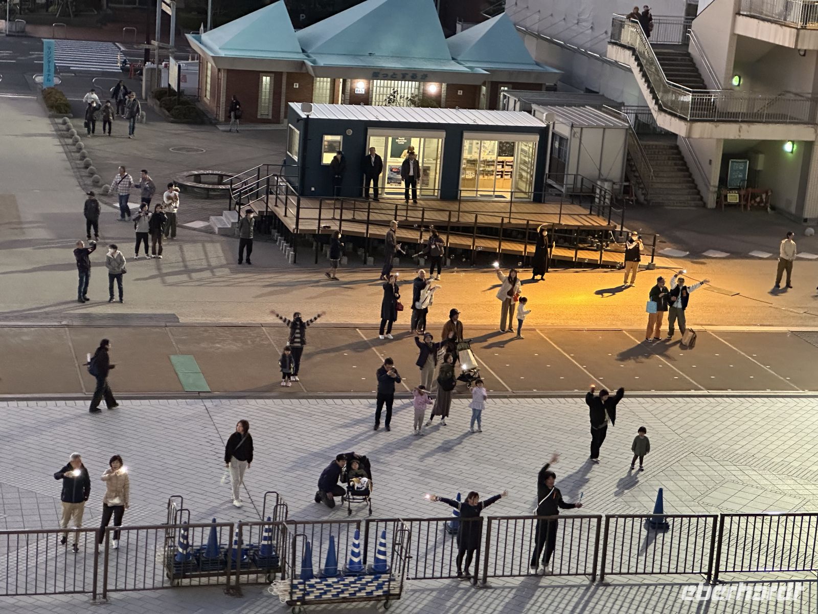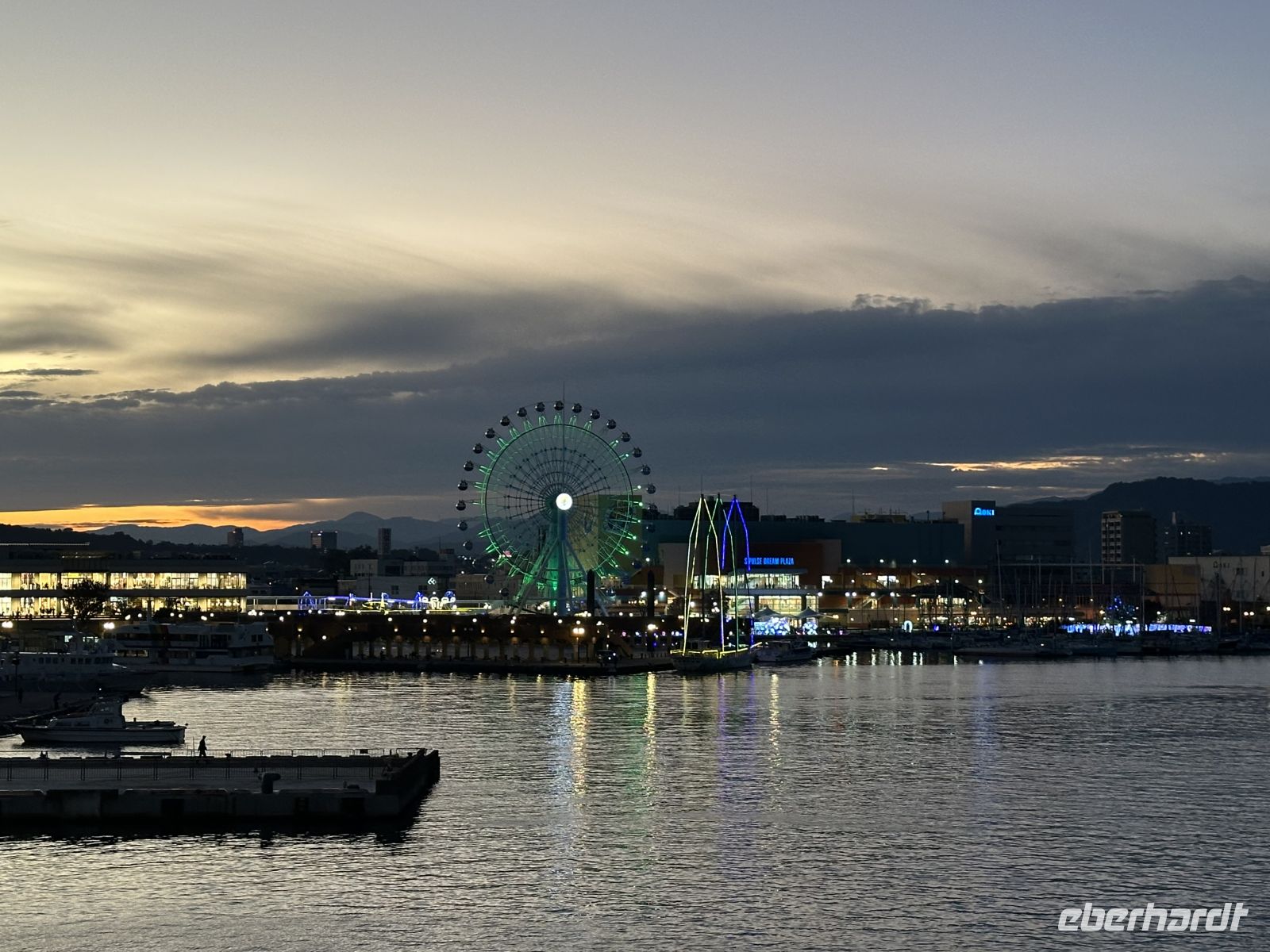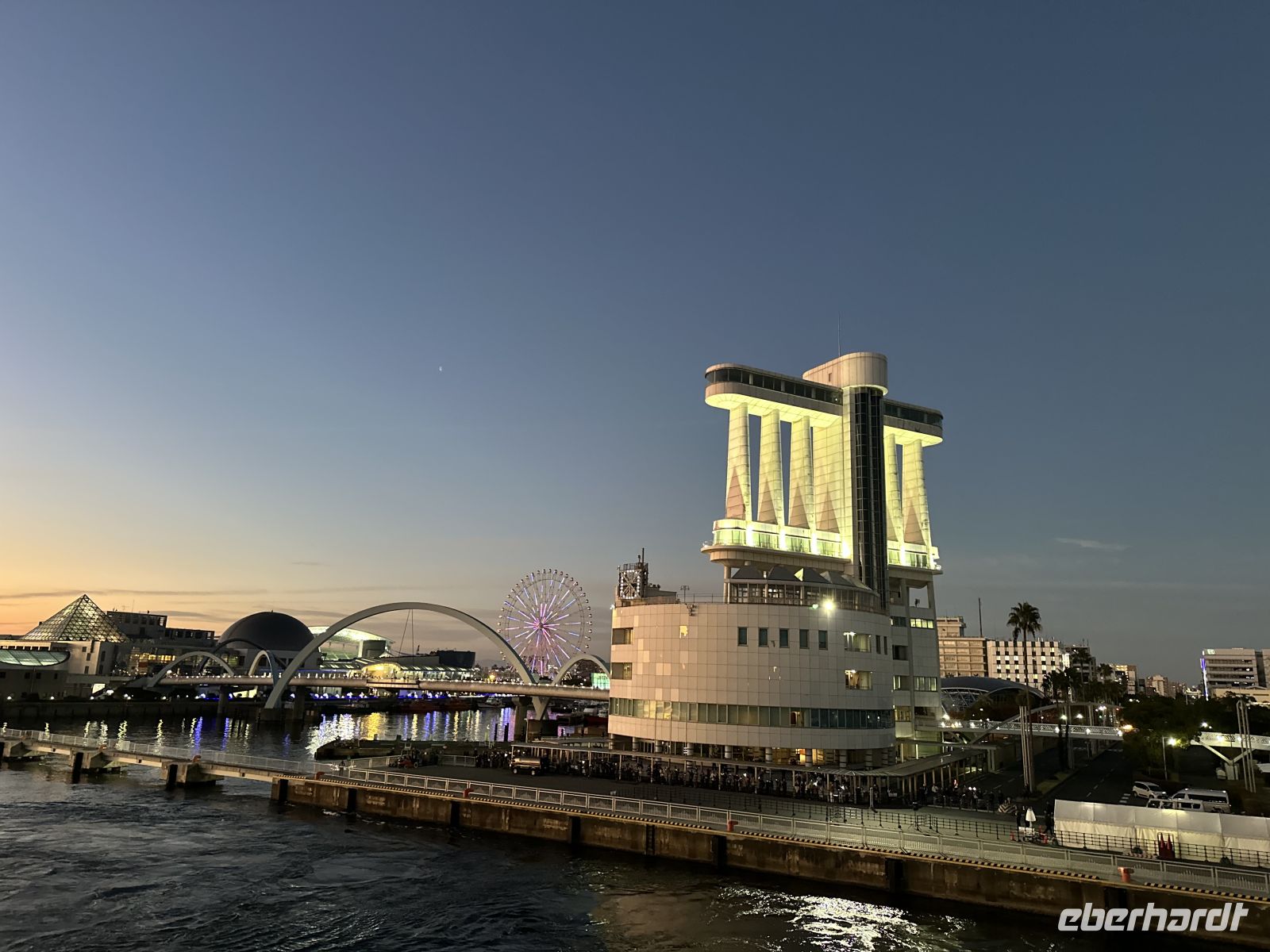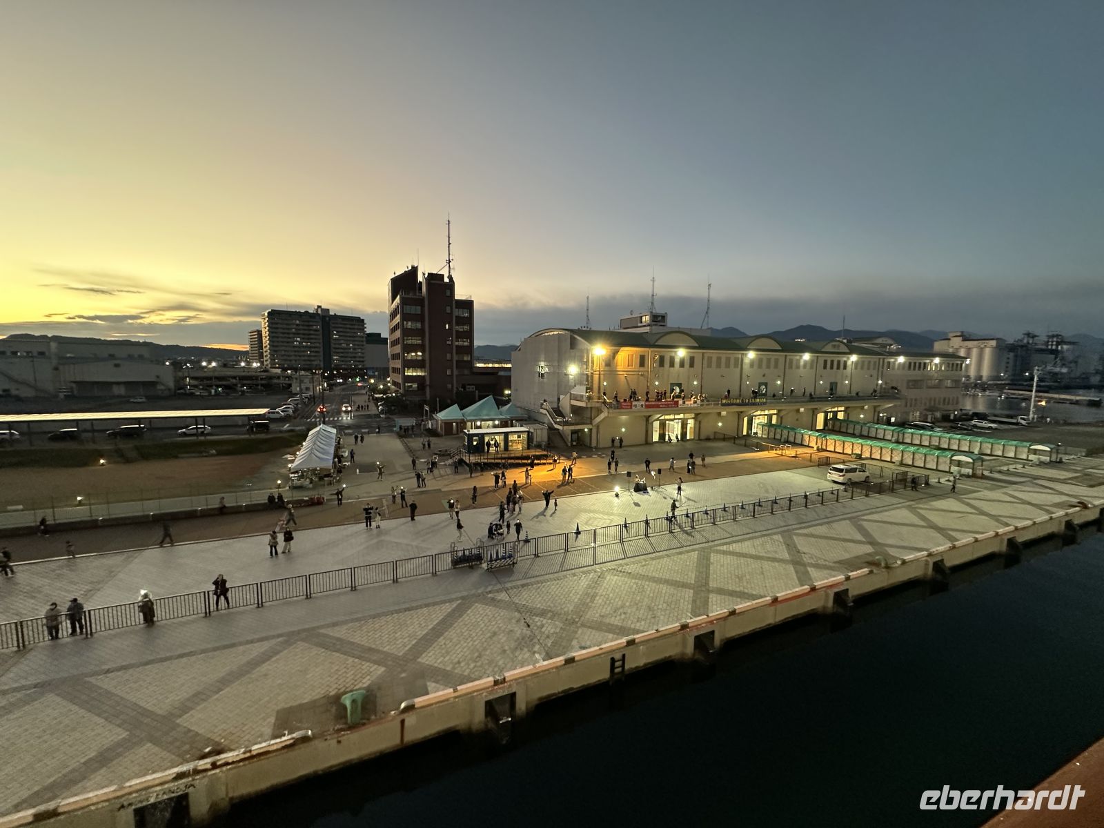 Am Abend, in der Dämmerung, scheint der Hafen von Nagoya zu leuchten. Am Kai stehen viele Japaner, die mit den Lampen ihrer Handys winken und uns herzlich verabschieden.