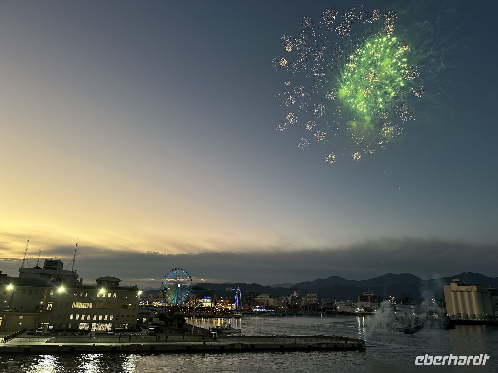 Gegen 17.00 Uhr verlässt die Norwegian Sun Shimizu. Wieder stehen viele Menschen am Kai und winken uns zu. Und heute gibt es sogar ein Feuerwerk zum Abschied!