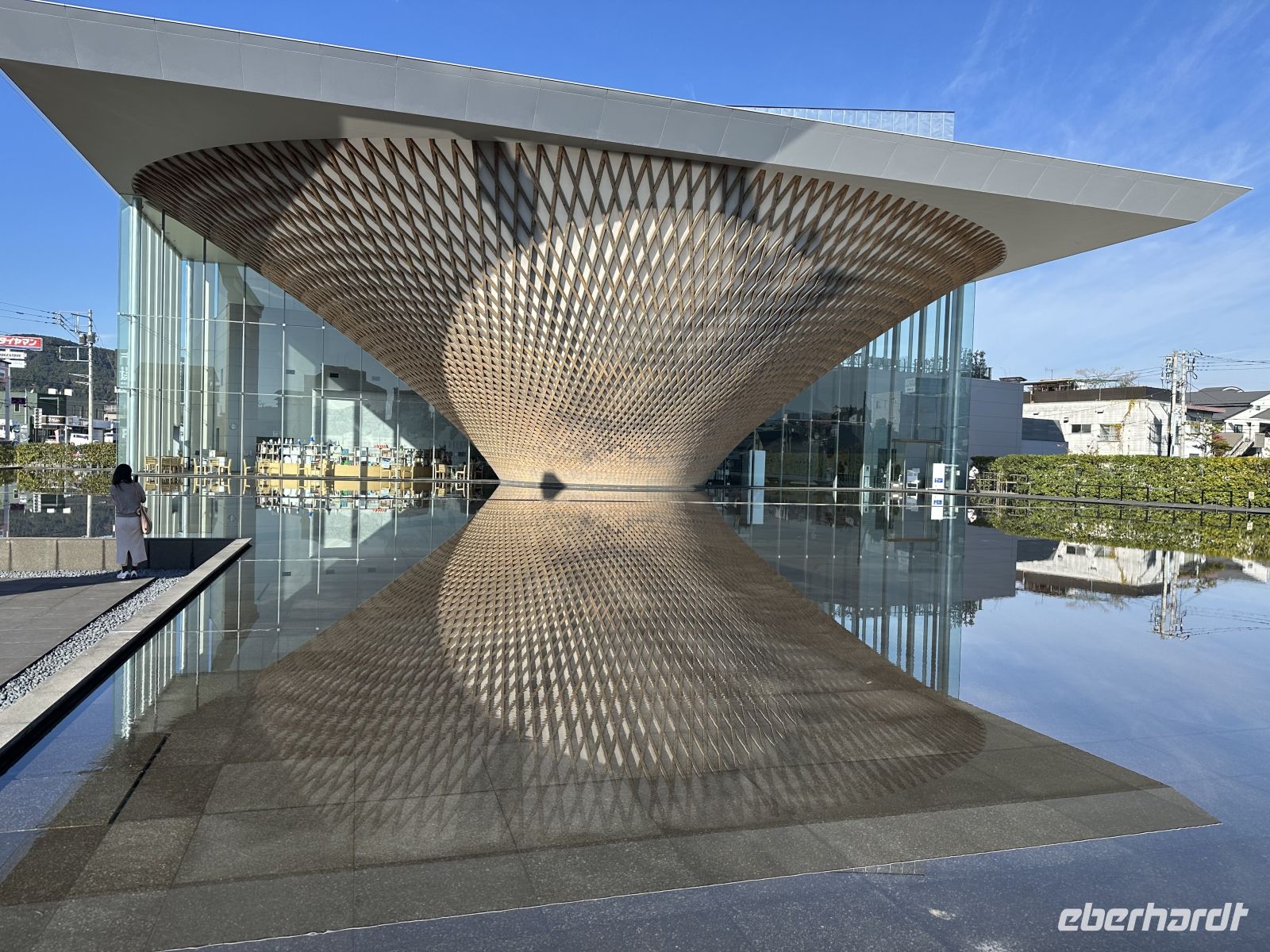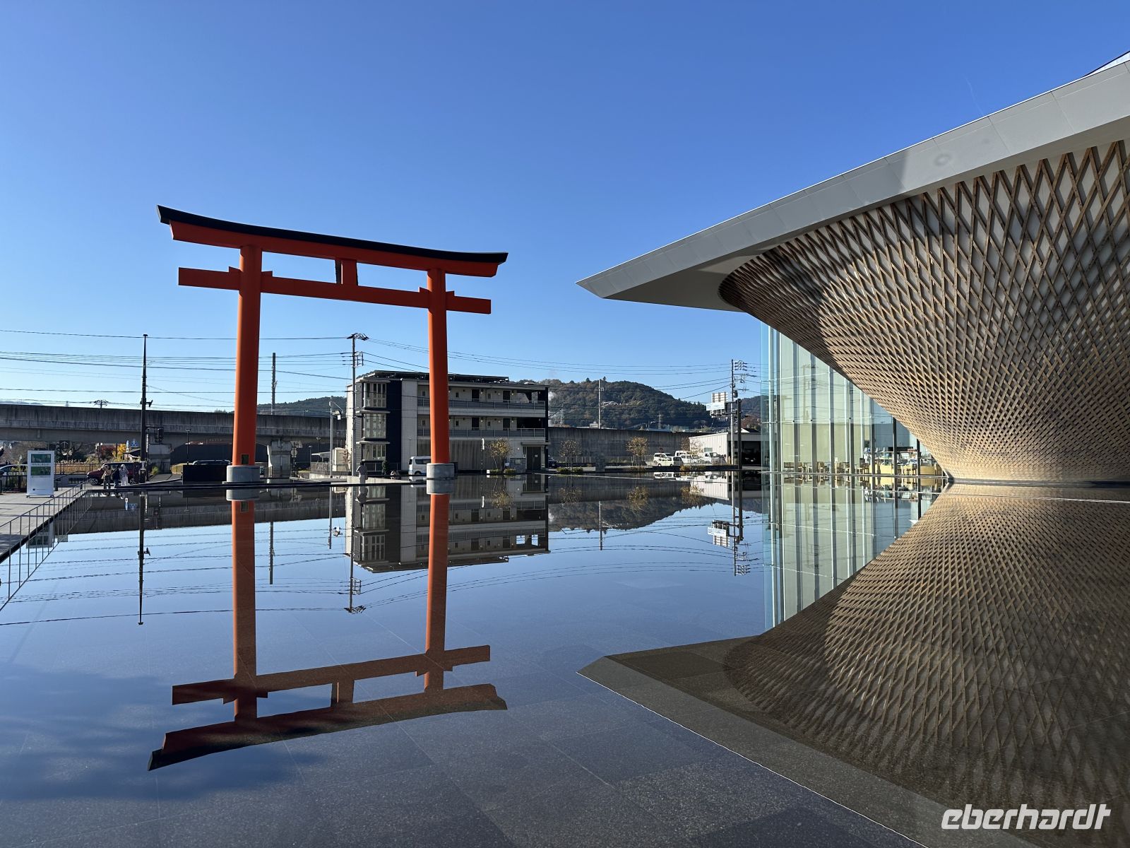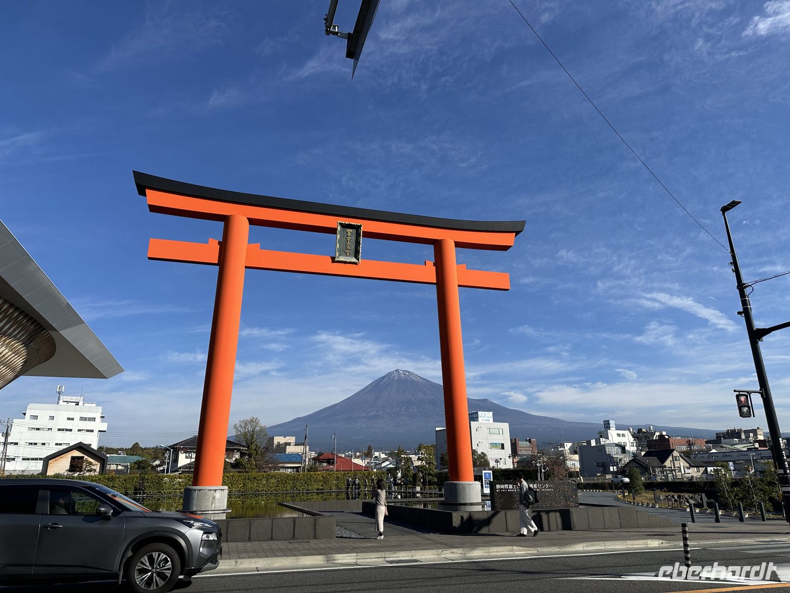 Vor dem Welterbezentrum befindet sich ein Tori und ein Wasserbecken, in dem sich das Tori herrlich spiegelt. Im Gebäude selbst führt eine Rampe in die oberen Etagen, das soll visualisieren, als ob man den Fuji besteigen würde. Während des Aufstiegs und auf verschiedenen Plattformen erhalten wir umfassende Informationen über die Geschichte, Geologie und die religiöse und kulturelle Bedeutung des Fuji als Weltkulturerbe. Der Höhepunkt des virtuellen Aufstiegs ist die Beobachtungshalle auf dem Gipfel des spiralförmigen Turms. Von hier aus haben wir einen ungehinderten Blick auf den echten Fuji. Durch die Fenster, die oft als „Gemäldefenster“ bezeichnet werden, wirkt der Berg wie ein lebendes Kunstwerk. In einem der unteren Räume sehen wir uns einen Kurzfilm über den Fuji während der vier Jahreszeiten an. Im Fuji-Shop mit anschließendem Café decken wir uns mit Wasabi-Salz ein, so wie es uns die Reiseleiterin empfohlen hat (denn schließlich steht Weihnachten vor der Tür).