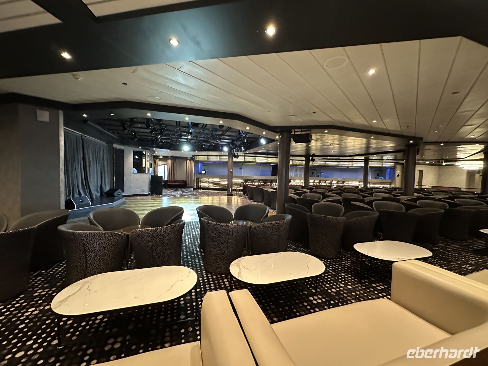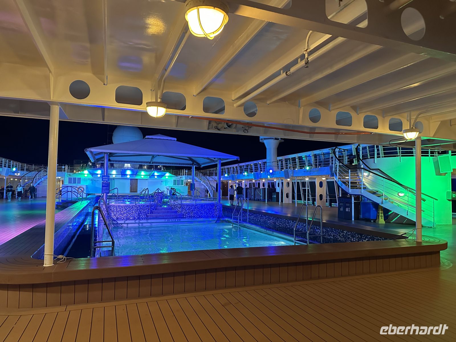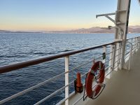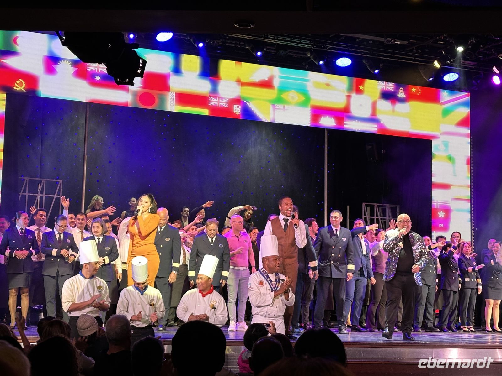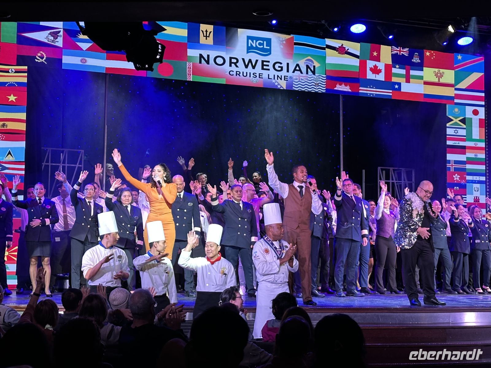 Nach dem Abendessen findet im Theater die Abschiedsshow statt. Am Ende stehen die Offiziere, die Köche, Kellner und Zimmermädchen auf der Bühnen und verabschieden sich von uns und allen anderen Gästen. Ein weiterer Gänsehautmoment.