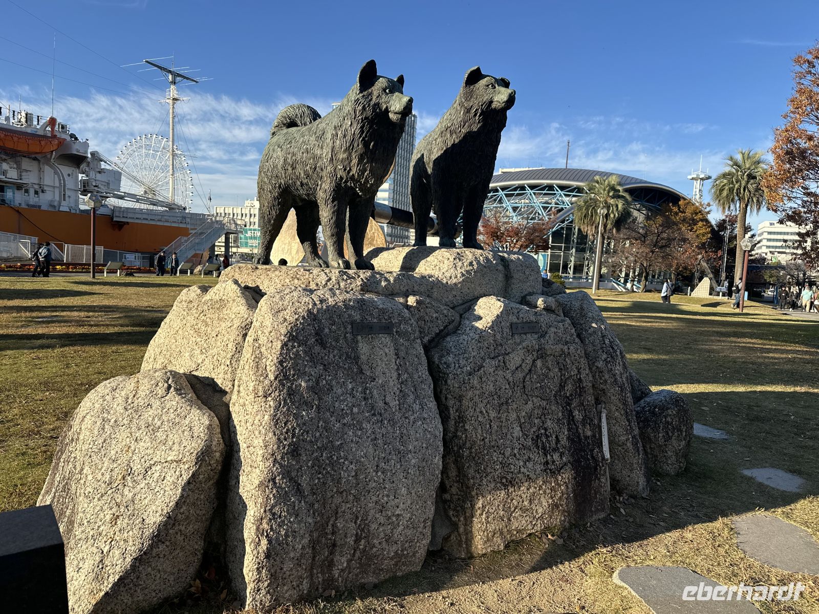 Es gibt hier so viel zu erleben. Zum Beispiel haben wir eine Statue gesehen, die zwei Hunde darstellt. Die Statue und ein Text auf der Tafel erzählen die berühmte und bewegende Geschichte der beiden Schlittenhunde Taro und Jiro der japanischen Antarktisexpedition. Die Hunde Taro und Jiro waren wichtige Helfer der ersten japanischen Antarktisexpedition. Aufgrund widriger Wetterbedingungen und des gefährlichen Treibeises mussten die Mitglieder der zweiten Expedition im Jahr 1958 die Shōwa-Station überstürzt verlassen und alle Schlittenhunde zurücklassen, da eine sofortige Rettung der Tiere unmöglich war. Entgegen aller Erwartungen überlebten Taro und Jiro als einzige der 15 zurückgelassenen Hunde den extrem kalten antarktischen Winter und wurden ein Jahr später bei der Ankunft der nächsten Expedition wohlauf in der Nähe der Station gefunden.