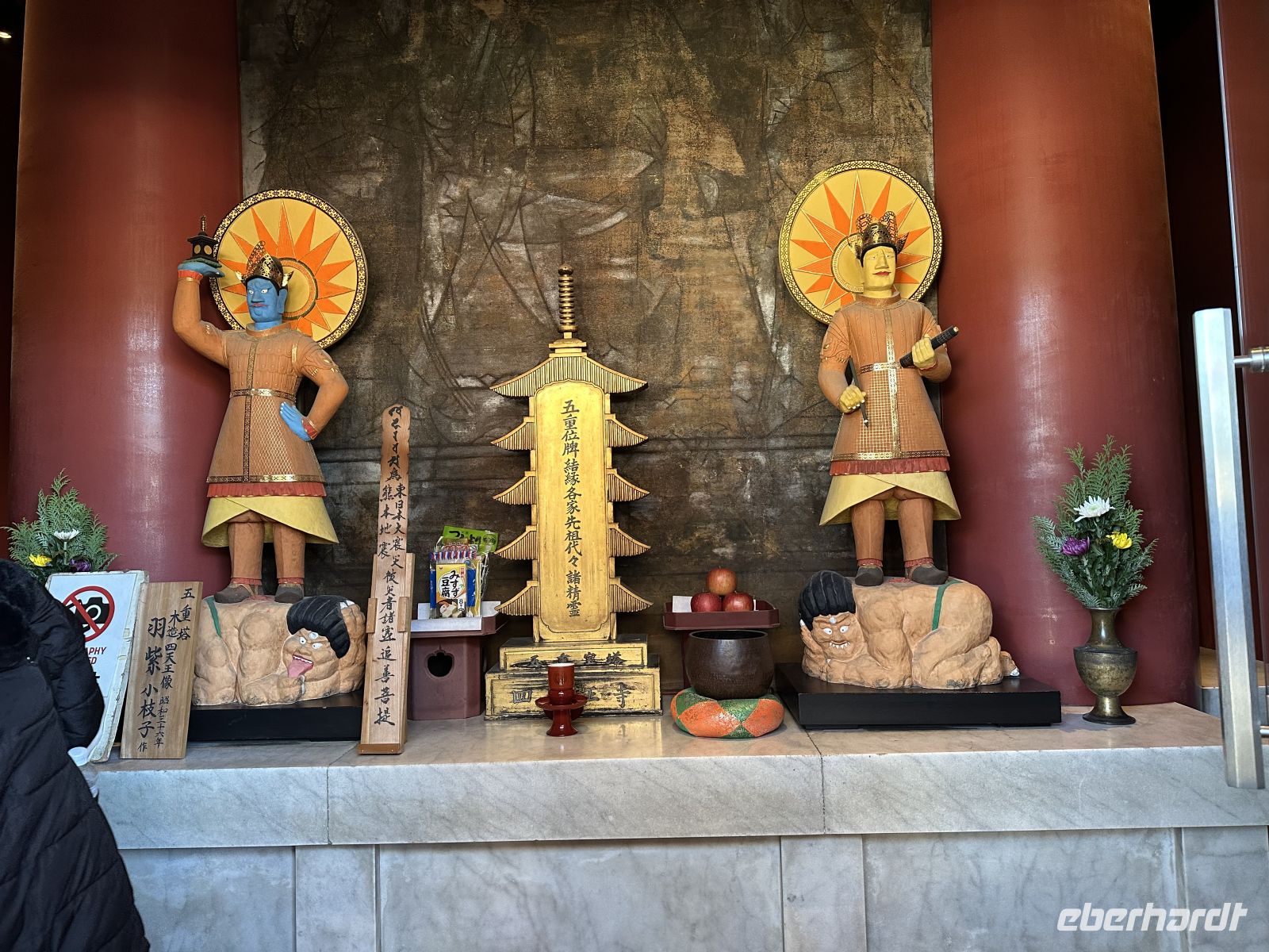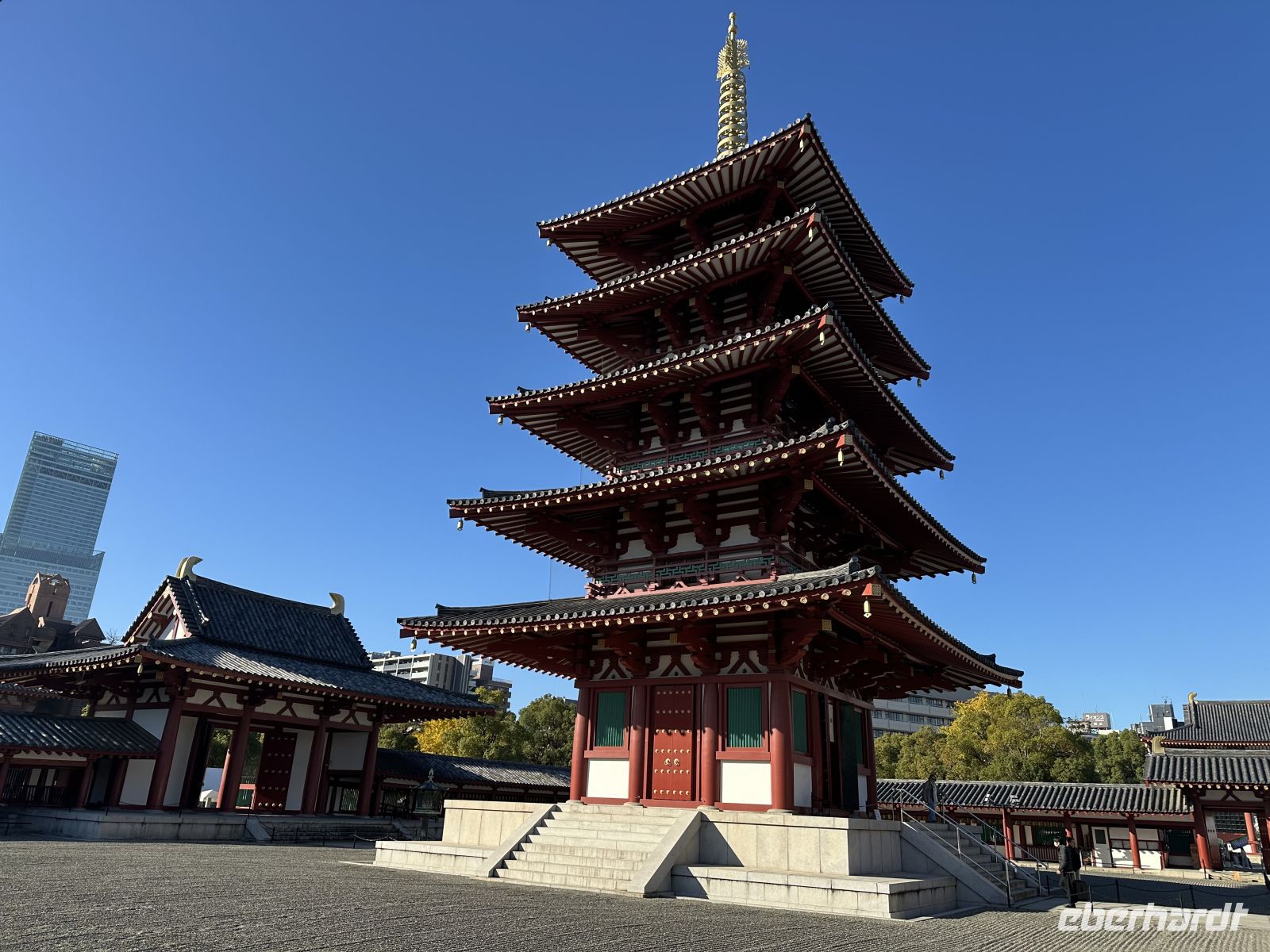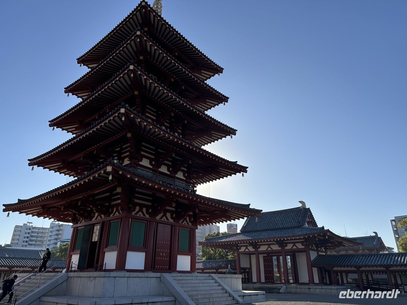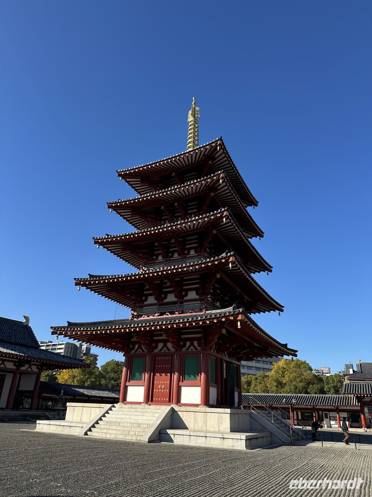 Am Vormittag besuchen wir zunächst den Shitennoji Tempel. Es ist einer der ältesten buddhistischen Tempel Japans. Zunächst bewundern wir die fünfstöckige Pagode. Die etwa 29 Meter hohe Pagode ist ein markantes Wahrzeichen und wir können tatsächlich hinein gehen. Allerdings müssen wir die Schuhe ausziehen. Im untersten Geschoss liegen Schuhbeutel und auf einer Tafel steht, dass wir unsere Schuhe ausziehen, in die Beutel stecken und mitnehmen sollen. Eine schmale Wendeltreppe führt nach oben. Die Wände im Inneren der Pagode sind mit kleinen goldenen buddhistischen Figuren und den Gedächtnistafeln geschmückt. Der gesamte Aufbau dient dem Gedenken an die Verstorbenen und dem Streben nach dem buddhistischen Paradies.