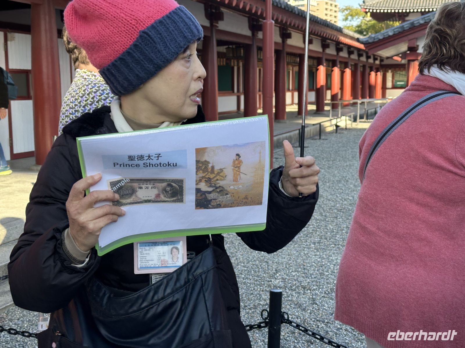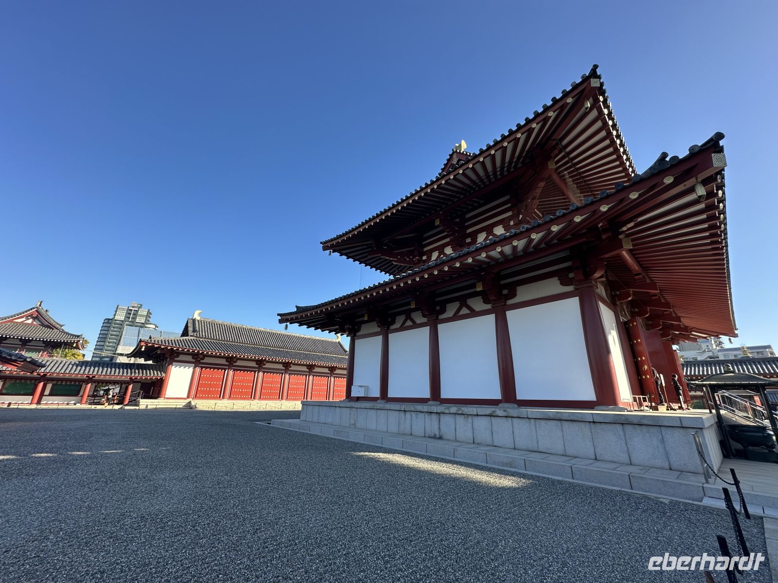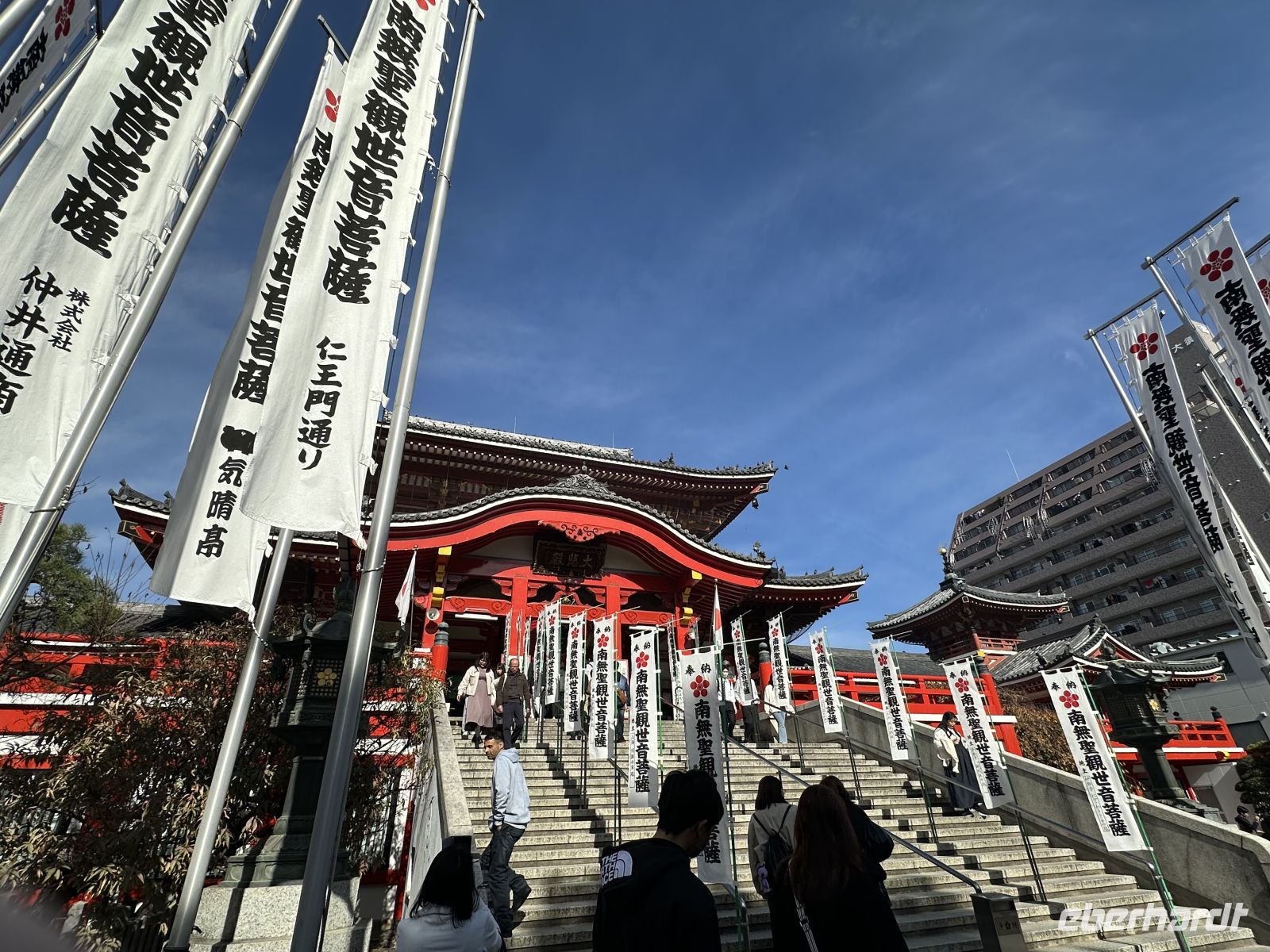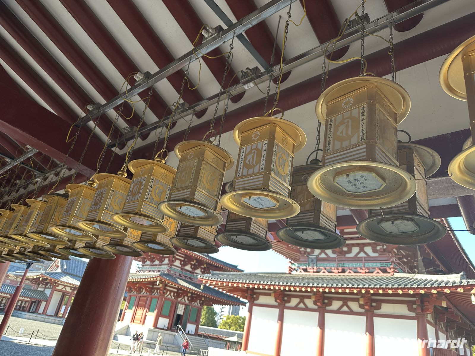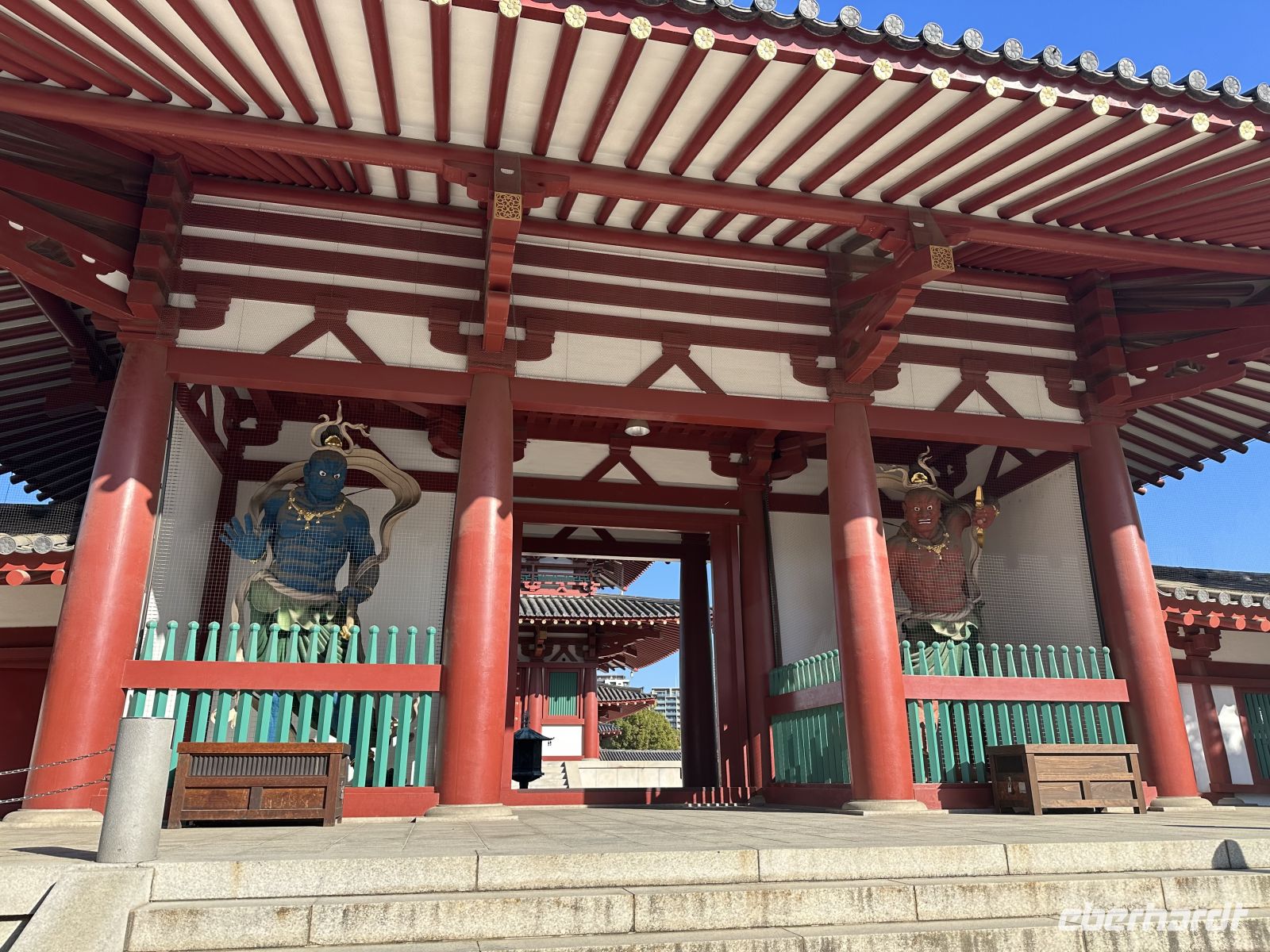Am Vormittag besuchen wir zunächst den Shitennoji Tempel. Es ist einer der ältesten buddhistischen Tempel Japans. Zunächst bewundern wir die fünfstöckige Pagode. Die etwa 29 Meter hohe Pagode ist ein markantes Wahrzeichen und wir können tatsächlich hinein gehen. Allerdings müssen wir die Schuhe ausziehen. Im untersten Geschoss liegen Schuhbeutel und auf einer Tafel steht, dass wir unsere Schuhe ausziehen, in die Beutel stecken und mitnehmen sollen. Eine schmale Wendeltreppe führt nach oben. Die Wände im Inneren der Pagode sind mit kleinen goldenen buddhistischen Figuren und den Gedächtnistafeln geschmückt. Der gesamte Aufbau dient dem Gedenken an die Verstorbenen und dem Streben nach dem buddhistischen Paradies.