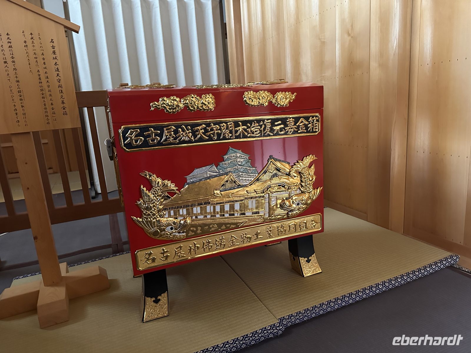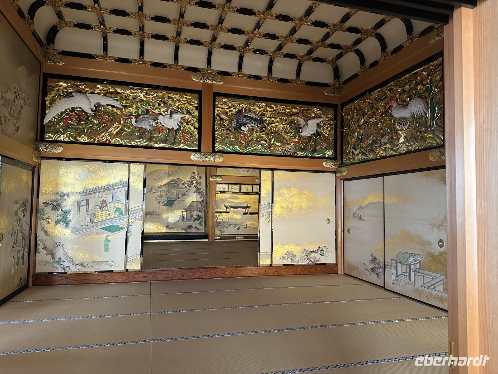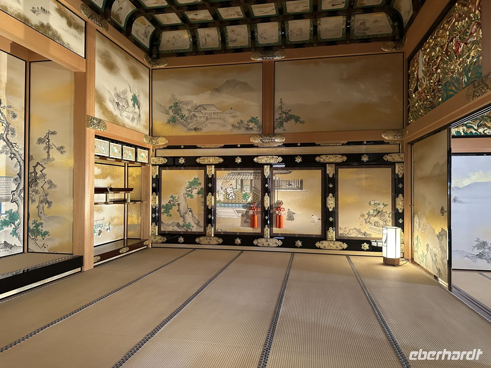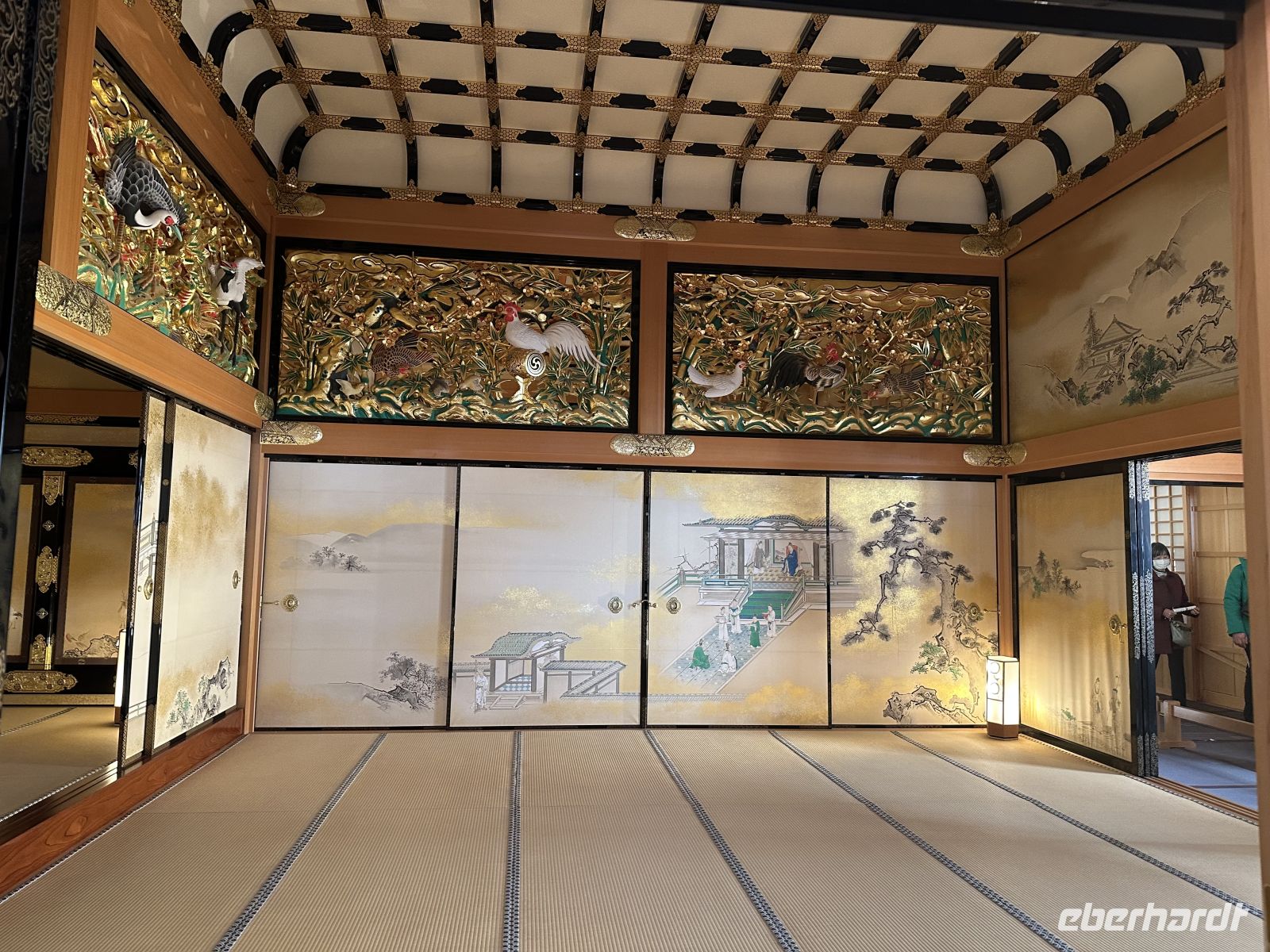 Der Ausflug, an dem heute einige Gäste unserer Gruppe teilnehmen, heißt “Nagoya Castle & Osu Kannon Tempel. Um 09.15 Uhr treffen wir uns im Theater und hole nuns unsere Sticker ab. Unsere örtliche Reiseleiterin heute heißt Kazu. Bereits im Bus stellt sie uns die berühmten Samurai vor. Sie hat eine Mappe mit Bildern in der Hand, die uns die Vorstellung dieser großen Persönlichkeiten in der Fantasie erleichtert. Auch ist sie sehr besorgt, dass wir den Weg vom Palast nicht zurück finden könnten und hat auch diesen bildlich dargestellt. Gemeinsam mit vielen anderen Touristen errreichen wir Nagoya Castle. Der Hauptturm glänzt in seiner ganzen Pracht. Das Wetter is tuns mal wieder hold. Der Turm ist das markanteste Merkmal der Burg und gilt als das Wahrzeichen der Stadt Nagoya. Der ursprüngliche Burgturm, der 1612 fertiggestellt wurde, ist bei Luftangriffen im Zweiten Weltkrieg zerstört worden. Das heutige Gebäude ist ein Wiederaufbau aus dem Jahr 1959 in Stahlbeton, der die ursprüngliche Erscheinung nachahmt. Auf dem obersten Dach des Hauptturms befanden sich ursprünglich die berühmten goldenen Kinshachi, stilisierte, delphinartige Fabelwesen, die als Symbol des Schlosses bekannt sind und es vor Feuer schützen sollten. Dieser Hauptturm war lange Zeit ein Museum zur Geschichte der Burg und der Stadt Nagoya, ist aber seit 2018 für Besucher gesperrt, da ein weiterer, originalgetreuer Wiederaufbau aus Holz geplant ist, um ihn erdbebensicher und historisch korrekt zu rekonstruieren. Was wir aber besuchen können, ist der Hommaru-Palast, der als Meisterwerk der Shoin-zukuri-Architektur gilt. Ehe wir den Palast betreten können, heißt es für uns anstehen. Die Schlange ist unglaublich lang und unsere Reiseleiterin verschiebt den Treffpunkt für die Weiterfahrt um eine Viertelstunde. Am Eingang heißt es: Schuhe aus! Allerdings könnte man sich ein paar Pantoffeln schnappe, was zu empfehlen ist, denn der Palast ist tatsäch fußkalt. Die eigenen Schuhe können wir ohne Gebürh in ein Schränkchen einschließen. In den ersten Räume sehen wir die dramatischen, großflächigen Wandmalereien von furchterregenden Tigern und Leoparden auf Goldgrund. Diese sollten die Gäste sofort beeindrucken und die Stärke der Owari-Tokugawa-Familie demonstrieren. Laut unserer Reiseleiterin dachte man damals, Leoparden seien weibliche Tiger, deshalb wurden sie gemeinsam auf den Bildern dargestellt. Die Haupthalle, der offizielle Audienzsaal des Burgherren ist einer der größten und prunkvollsten Bereiche. Der Raum des Burgherren ist durch ein erhöhtes Podest gekennzeichnet, das seinen höheren sozialen Status und seine Autorität verdeutlichte. Die Gemälde zeigen elegante Motive wie Kiefern, die als Symbol für Langlebigkeit stehen. Der luxuriöseste Teil des Palastes wurde eigens für den Besuch des Shōgun Tokugawa Iemitsu im Jahr 1634 erbaut. Dies ist der Gipfel des Prunks. Hier beeindrucken uns die aufwendigen Schnitzereien, die mit Metallbeschlägen und Gold verziert sind, sowie die feinen Wandmalereien der Kano-Schule, die eine der berühmtesten Malerwerkstatt der Edo-Zeit war.