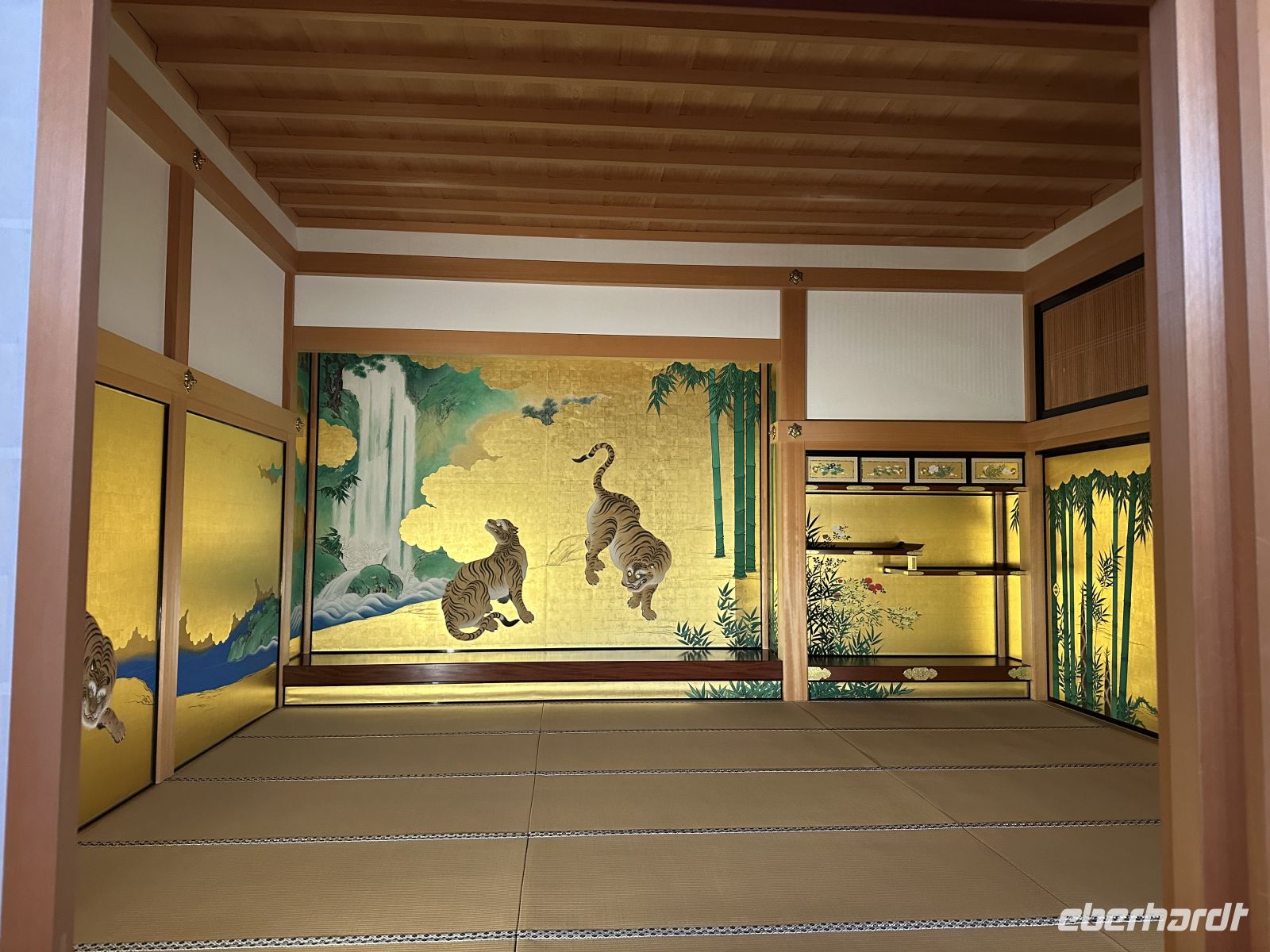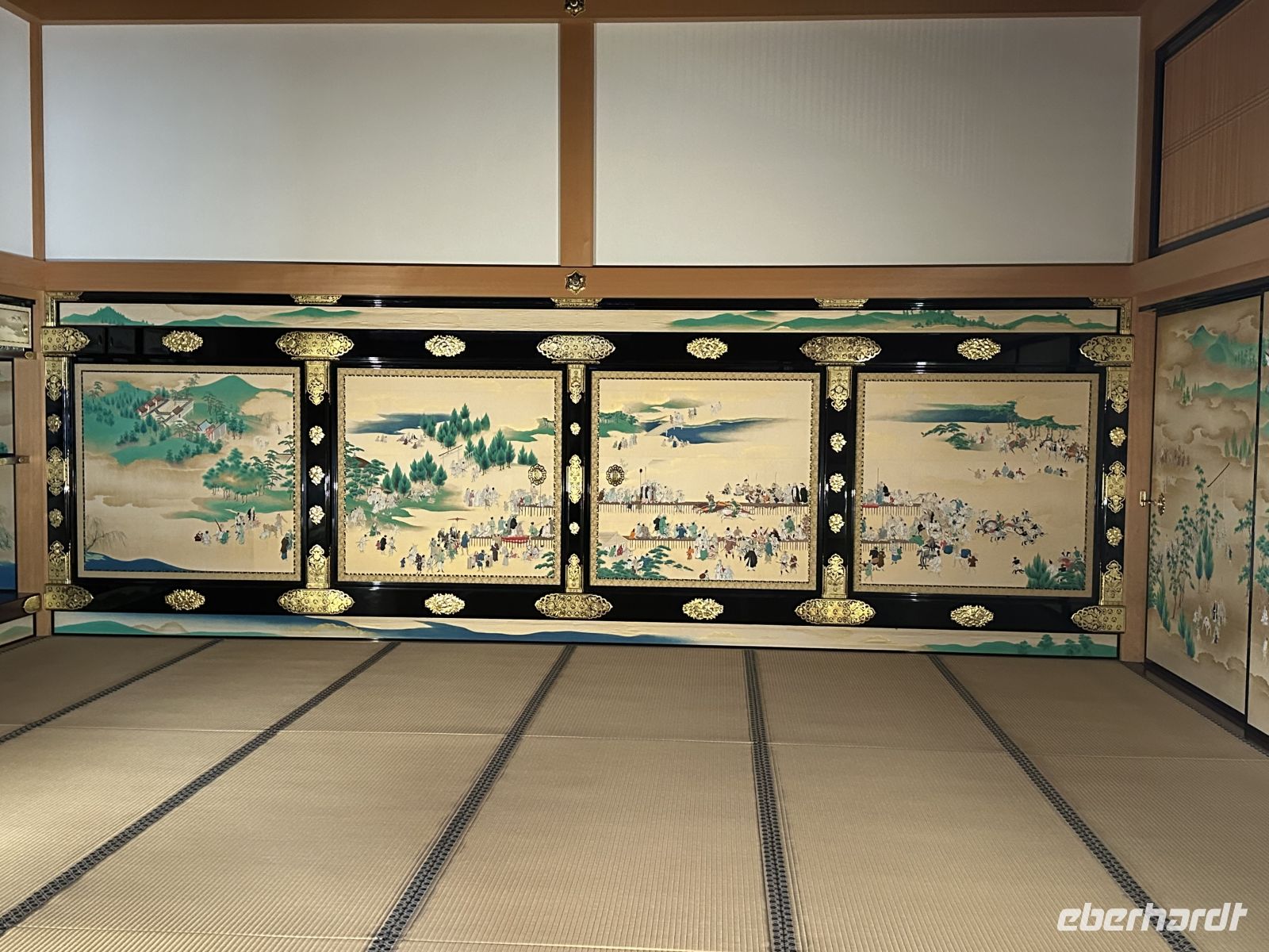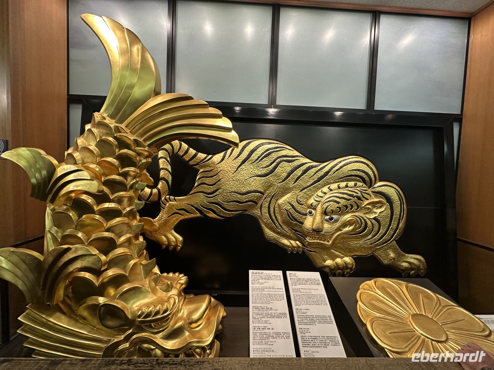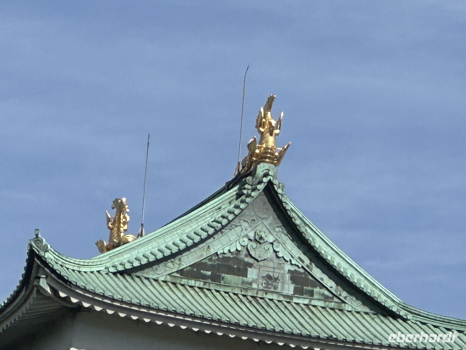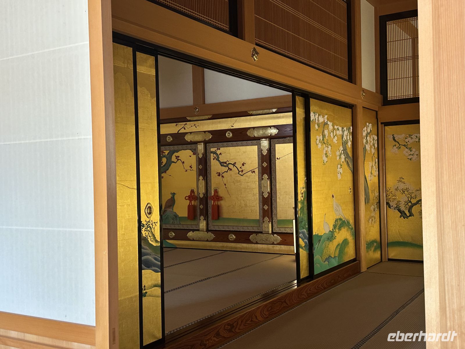 Der Ausflug, an dem heute einige Gäste unserer Gruppe teilnehmen, heißt “Nagoya Castle & Osu Kannon Tempel. Um 09.15 Uhr treffen wir uns im Theater und hole nuns unsere Sticker ab. Unsere örtliche Reiseleiterin heute heißt Kazu. Bereits im Bus stellt sie uns die berühmten Samurai vor. Sie hat eine Mappe mit Bildern in der Hand, die uns die Vorstellung dieser großen Persönlichkeiten in der Fantasie erleichtert. Auch ist sie sehr besorgt, dass wir den Weg vom Palast nicht zurück finden könnten und hat auch diesen bildlich dargestellt. Gemeinsam mit vielen anderen Touristen errreichen wir Nagoya Castle. Der Hauptturm glänzt in seiner ganzen Pracht. Das Wetter is tuns mal wieder hold. Der Turm ist das markanteste Merkmal der Burg und gilt als das Wahrzeichen der Stadt Nagoya. Der ursprüngliche Burgturm, der 1612 fertiggestellt wurde, ist bei Luftangriffen im Zweiten Weltkrieg zerstört worden. Das heutige Gebäude ist ein Wiederaufbau aus dem Jahr 1959 in Stahlbeton, der die ursprüngliche Erscheinung nachahmt. Auf dem obersten Dach des Hauptturms befanden sich ursprünglich die berühmten goldenen Kinshachi, stilisierte, delphinartige Fabelwesen, die als Symbol des Schlosses bekannt sind und es vor Feuer schützen sollten. Dieser Hauptturm war lange Zeit ein Museum zur Geschichte der Burg und der Stadt Nagoya, ist aber seit 2018 für Besucher gesperrt, da ein weiterer, originalgetreuer Wiederaufbau aus Holz geplant ist, um ihn erdbebensicher und historisch korrekt zu rekonstruieren. Was wir aber besuchen können, ist der Hommaru-Palast, der als Meisterwerk der Shoin-zukuri-Architektur gilt. Ehe wir den Palast betreten können, heißt es für uns anstehen. Die Schlange ist unglaublich lang und unsere Reiseleiterin verschiebt den Treffpunkt für die Weiterfahrt um eine Viertelstunde. Am Eingang heißt es: Schuhe aus! Allerdings könnte man sich ein paar Pantoffeln schnappe, was zu empfehlen ist, denn der Palast ist tatsäch fußkalt. Die eigenen Schuhe können wir ohne Gebürh in ein Schränkchen einschließen. In den ersten Räume sehen wir die dramatischen, großflächigen Wandmalereien von furchterregenden Tigern und Leoparden auf Goldgrund. Diese sollten die Gäste sofort beeindrucken und die Stärke der Owari-Tokugawa-Familie demonstrieren. Laut unserer Reiseleiterin dachte man damals, Leoparden seien weibliche Tiger, deshalb wurden sie gemeinsam auf den Bildern dargestellt. Die Haupthalle, der offizielle Audienzsaal des Burgherren ist einer der größten und prunkvollsten Bereiche. Der Raum des Burgherren ist durch ein erhöhtes Podest gekennzeichnet, das seinen höheren sozialen Status und seine Autorität verdeutlichte. Die Gemälde zeigen elegante Motive wie Kiefern, die als Symbol für Langlebigkeit stehen. Der luxuriöseste Teil des Palastes wurde eigens für den Besuch des Shōgun Tokugawa Iemitsu im Jahr 1634 erbaut. Dies ist der Gipfel des Prunks. Hier beeindrucken uns die aufwendigen Schnitzereien, die mit Metallbeschlägen und Gold verziert sind, sowie die feinen Wandmalereien der Kano-Schule, die eine der berühmtesten Malerwerkstatt der Edo-Zeit war.