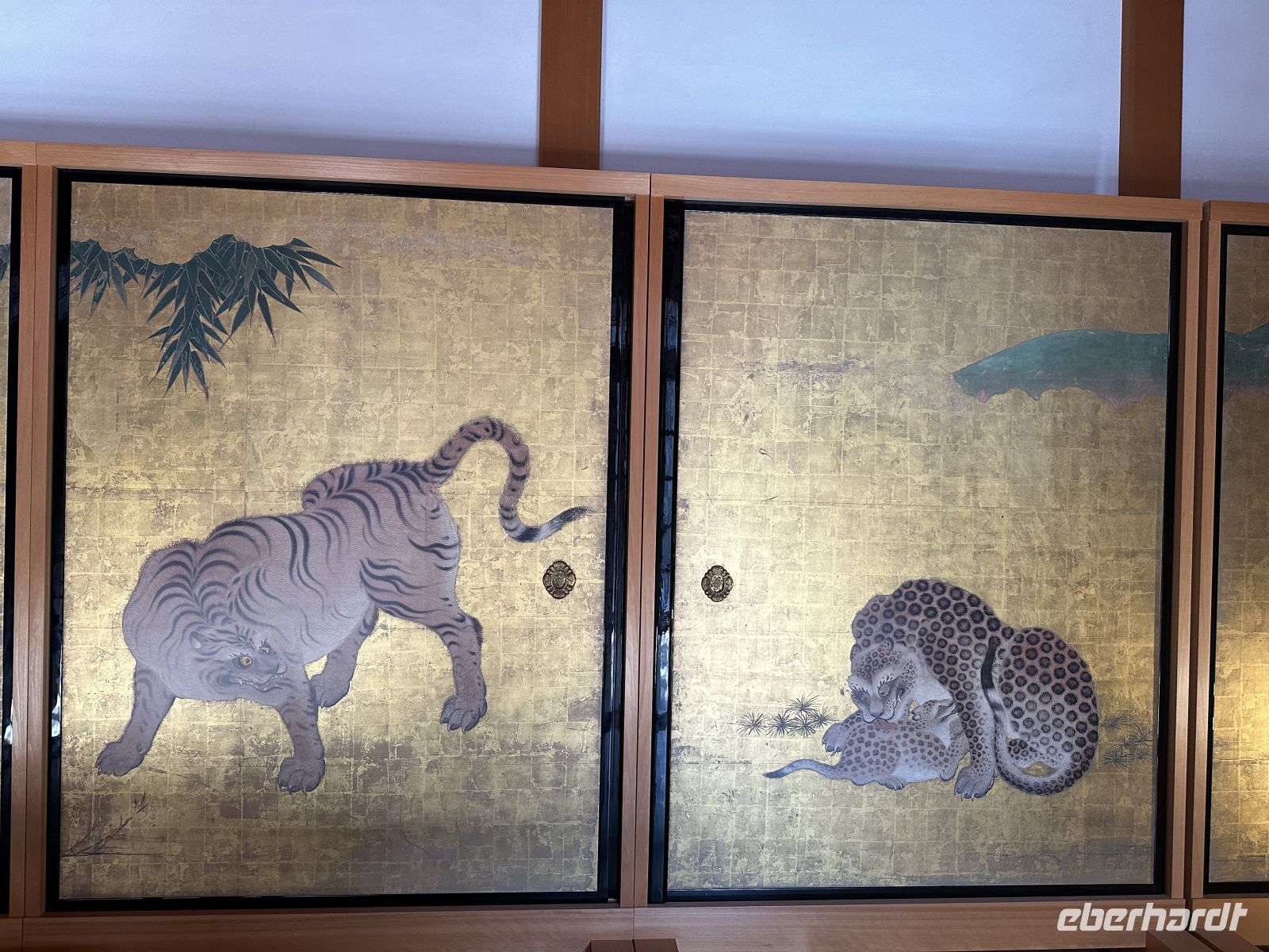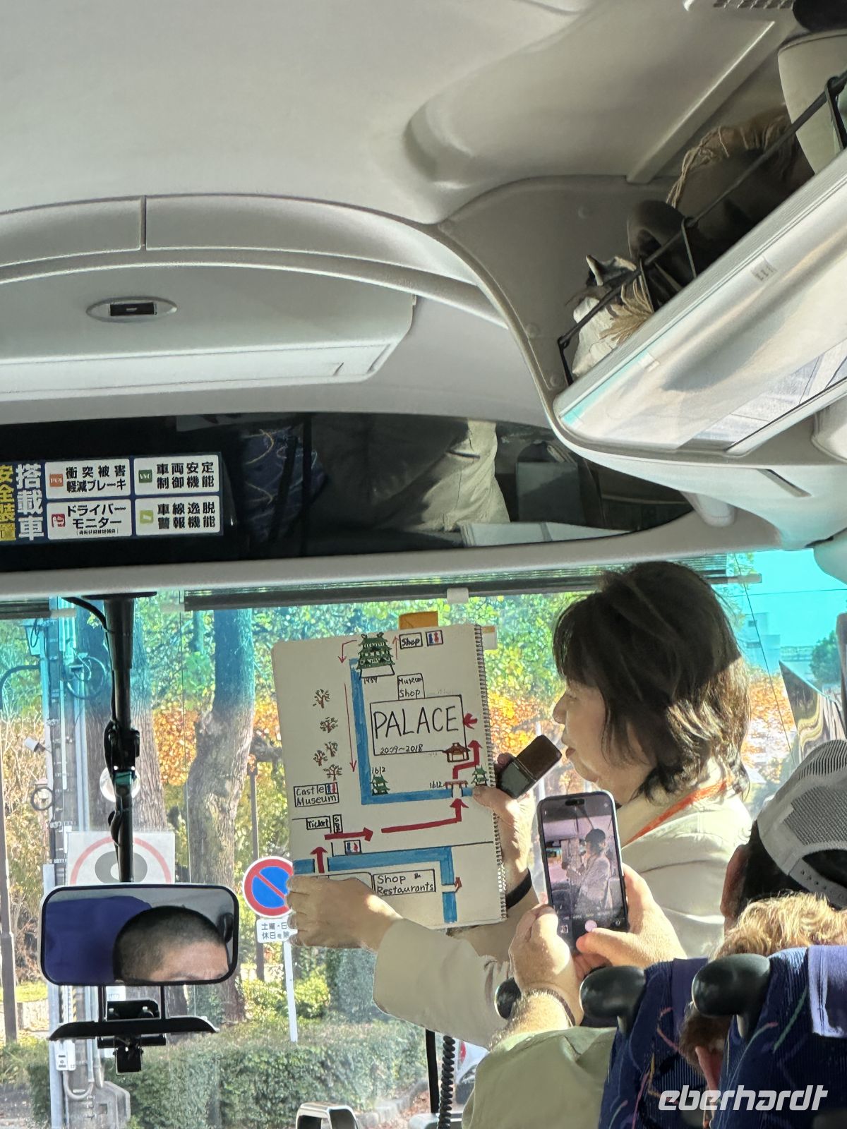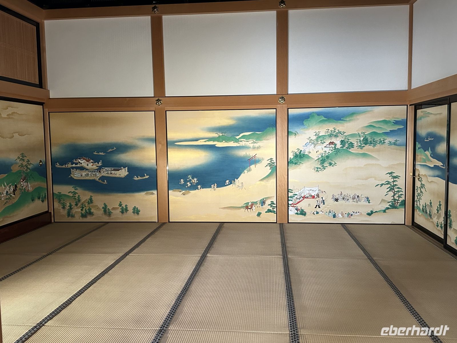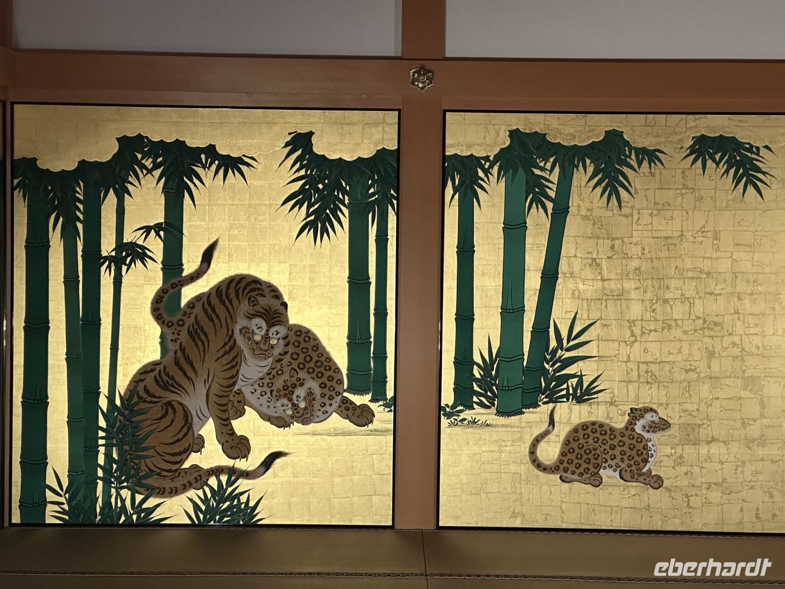Der Ausflug, an dem heute einige Gäste unserer Gruppe teilnehmen, heißt “Nagoya Castle & Osu Kannon Tempel. Um 09.15 Uhr treffen wir uns im Theater und hole nuns unsere Sticker ab. Unsere örtliche Reiseleiterin heute heißt Kazu. Bereits im Bus stellt sie uns die berühmten Samurai vor. Sie hat eine Mappe mit Bildern in der Hand, die uns die Vorstellung dieser großen Persönlichkeiten in der Fantasie erleichtert. Auch ist sie sehr besorgt, dass wir den Weg vom Palast nicht zurück finden könnten und hat auch diesen bildlich dargestellt. Gemeinsam mit vielen anderen Touristen errreichen wir Nagoya Castle. Der Hauptturm glänzt in seiner ganzen Pracht. Das Wetter is tuns mal wieder hold. Der Turm ist das markanteste Merkmal der Burg und gilt als das Wahrzeichen der Stadt Nagoya. Der ursprüngliche Burgturm, der 1612 fertiggestellt wurde, ist bei Luftangriffen im Zweiten Weltkrieg zerstört worden. Das heutige Gebäude ist ein Wiederaufbau aus dem Jahr 1959 in Stahlbeton, der die ursprüngliche Erscheinung nachahmt. Auf dem obersten Dach des Hauptturms befanden sich ursprünglich die berühmten goldenen Kinshachi, stilisierte, delphinartige Fabelwesen, die als Symbol des Schlosses bekannt sind und es vor Feuer schützen sollten. Dieser Hauptturm war lange Zeit ein Museum zur Geschichte der Burg und der Stadt Nagoya, ist aber seit 2018 für Besucher gesperrt, da ein weiterer, originalgetreuer Wiederaufbau aus Holz geplant ist, um ihn erdbebensicher und historisch korrekt zu rekonstruieren. Was wir aber besuchen können, ist der Hommaru-Palast, der als Meisterwerk der Shoin-zukuri-Architektur gilt. Ehe wir den Palast betreten können, heißt es für uns anstehen. Die Schlange ist unglaublich lang und unsere Reiseleiterin verschiebt den Treffpunkt für die Weiterfahrt um eine Viertelstunde. Am Eingang heißt es: Schuhe aus! Allerdings könnte man sich ein paar Pantoffeln schnappe, was zu empfehlen ist, denn der Palast ist tatsäch fußkalt. Die eigenen Schuhe können wir ohne Gebürh in ein Schränkchen einschließen. In den ersten Räume sehen wir die dramatischen, großflächigen Wandmalereien von furchterregenden Tigern und Leoparden auf Goldgrund. Diese sollten die Gäste sofort beeindrucken und die Stärke der Owari-Tokugawa-Familie demonstrieren. Laut unserer Reiseleiterin dachte man damals, Leoparden seien weibliche Tiger, deshalb wurden sie gemeinsam auf den Bildern dargestellt. Die Haupthalle, der offizielle Audienzsaal des Burgherren ist einer der größten und prunkvollsten Bereiche. Der Raum des Burgherren ist durch ein erhöhtes Podest gekennzeichnet, das seinen höheren sozialen Status und seine Autorität verdeutlichte. Die Gemälde zeigen elegante Motive wie Kiefern, die als Symbol für Langlebigkeit stehen. Der luxuriöseste Teil des Palastes wurde eigens für den Besuch des Shōgun Tokugawa Iemitsu im Jahr 1634 erbaut. Dies ist der Gipfel des Prunks. Hier beeindrucken uns die aufwendigen Schnitzereien, die mit Metallbeschlägen und Gold verziert sind, sowie die feinen Wandmalereien der Kano-Schule, die eine der berühmtesten Malerwerkstatt der Edo-Zeit war.