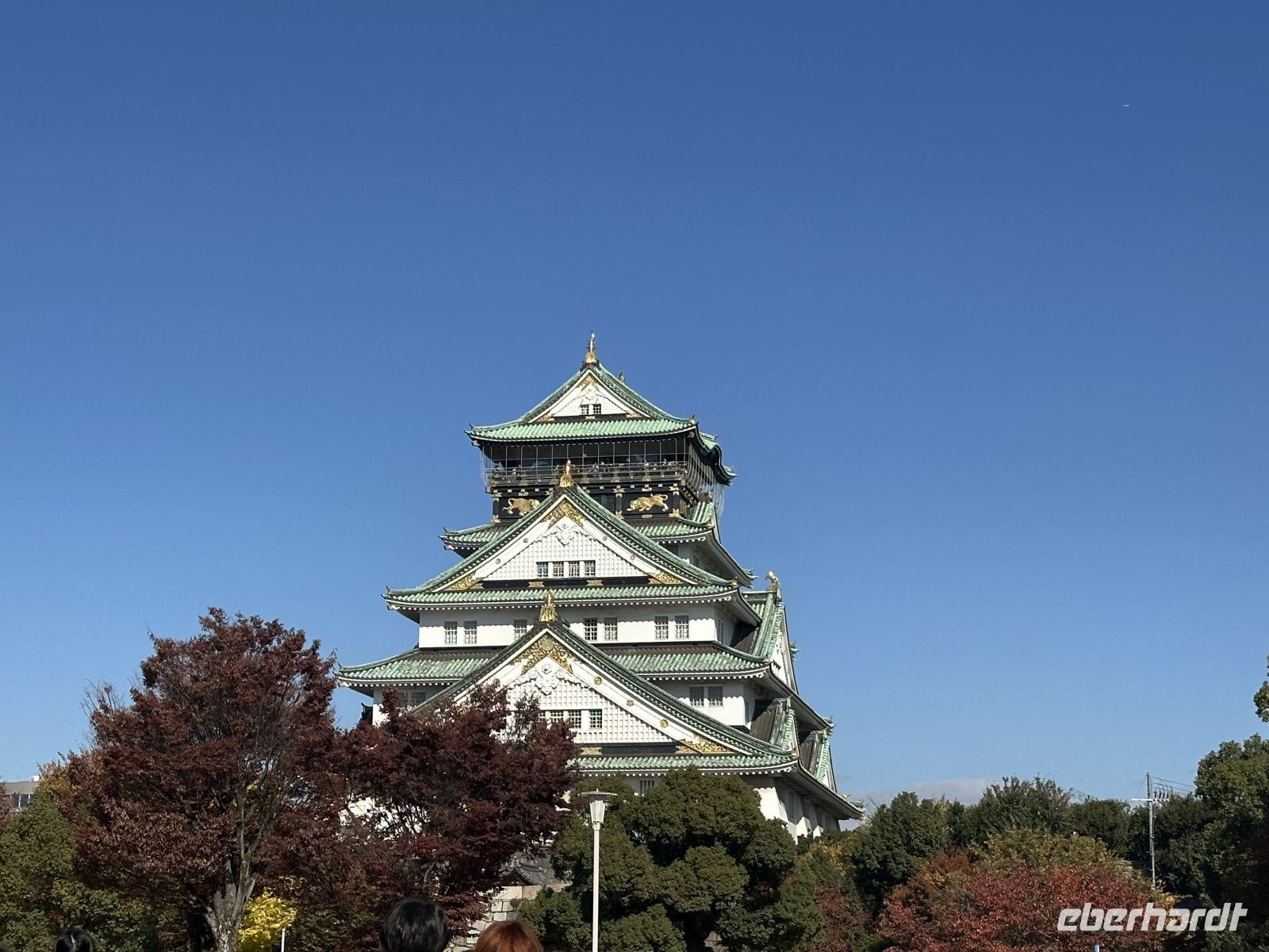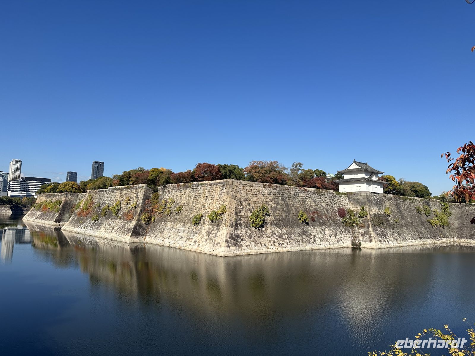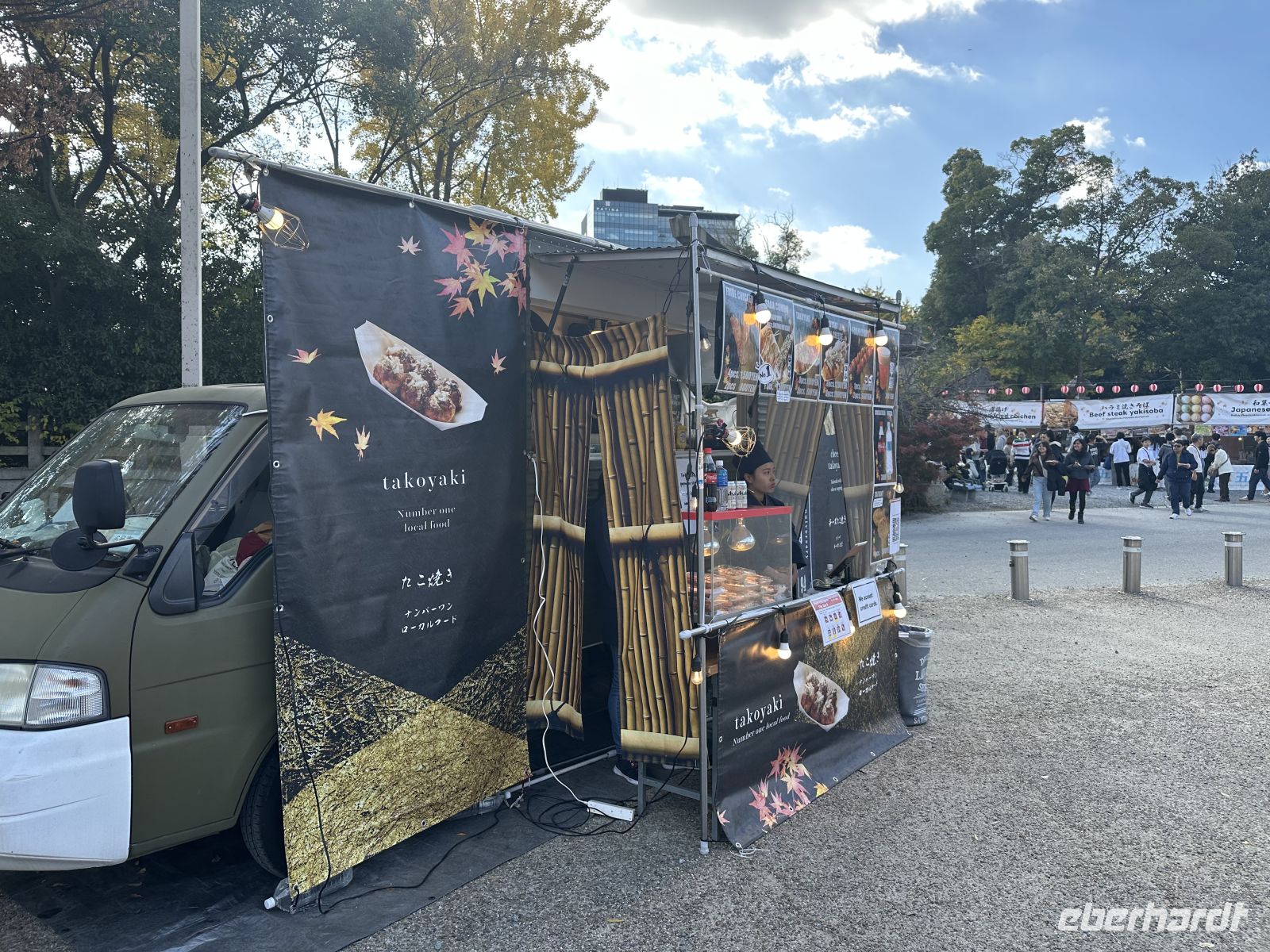 Unser nächstes Ziel ist die Burg Osaka. Vom Parkplatz müssen wir etwa 800 Meter bis zum Eingang laufen. Wir kommen vorbei an den trutzigen Burgmauern und können uns weiterhin an der fantastischen Laubfärbung der Bäume ergötzen. Der Besuch der Burg Osaka ist eine Reise in die Ära der Samurai und des mächtigen Feldherrn Toyotomi Hideyoshi, der die Burg im späten 16. Jahrhundert erbauen ließ. Die heutige Anlage ist eine beliebte Kombination aus historischer Architektur, einem modernen Museum und einem weitläufigen Park. Wie bereits erwähnt gelangen wir zur Burg durch einen riesigen Park, der eine grüne Oase mitten in der Stadt bildet. Die beeindruckendsten Merkmale sind die tiefen Wassergräben und die gigantischen Steinmauern. Am Octopus Stone am Sakuramon-Tor, ist einer der größten Steinblöcke, die jemals für eine japanische Burg verwendet wurden, zu sehen. Wir passieren mehrere große Tore, wie das Ōte-mon, und sehen erhaltene Wachtürme, die als wichtige Kulturgüter gelten. Der Hauptturm ist die zentrale Attraktion und das Wahrzeichen Osakas. Er wurde 1931 als äußerliche Rekonstruktion wieder aufgebaut und beherbergt heute ein modernes Museum. Bis zur 5. Etage können wir sogar einen Aufzug benutzen, abwärts muss man allerdings alles zu Fuß gehen. Auch, wer die Aussicht in der 8. Etage bewundern will, muss die Treppe nehmen. Das Innere des Museums (ab 5. Etage abwärts) ist modern ausgestattet. Die Ausstellungen zeigen die reiche Geschichte der Burg, die Rolle von Toyotomi Hideyoshi und die berühmten Sommerschlachten von Osaka anhand von Artefakten, Dioramen und Modellen. Ganz unten gibt es eine Filmvorführung, einige Gäste, die nicht gar so gut zu Fuß sind, bestätigen, dass es sich lohnt, den Film anzuschauen. Auf dem Weg zurück gibt es ein paar Imbiss-Stände, hier kann man lokale Spezialitäten kaufen und probieren, wie zum Beispiel Takoyaki.