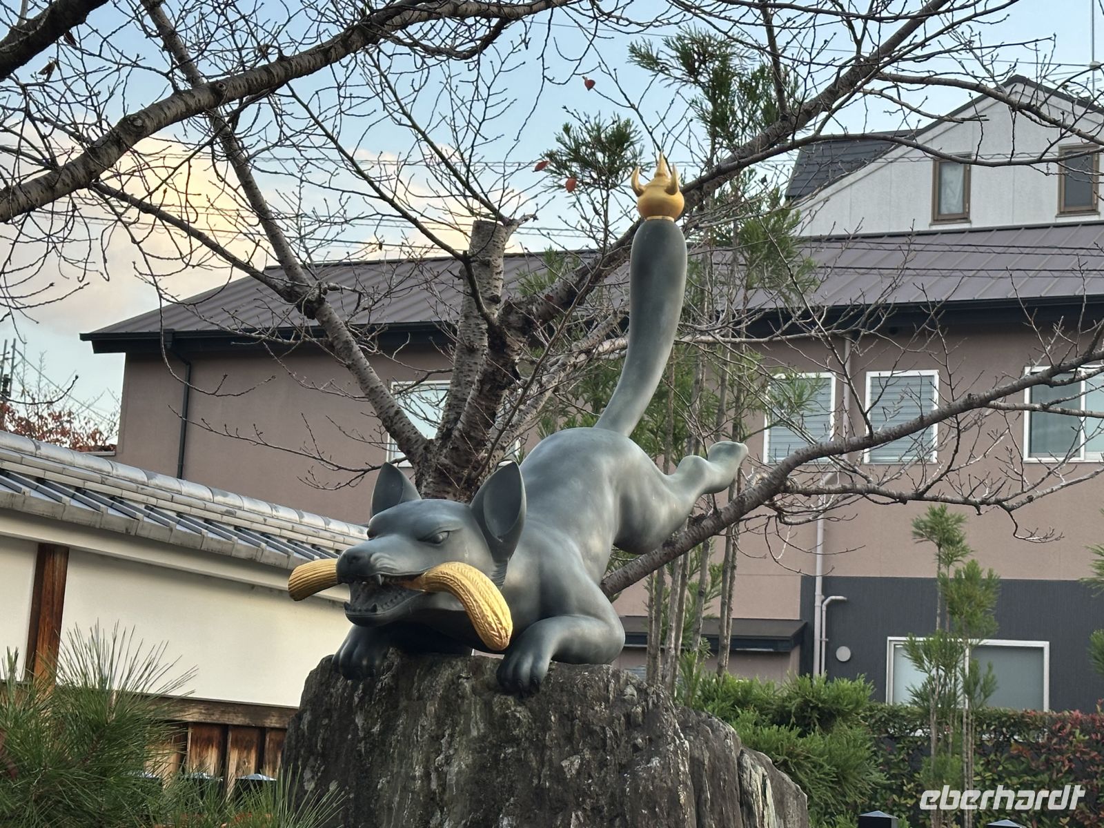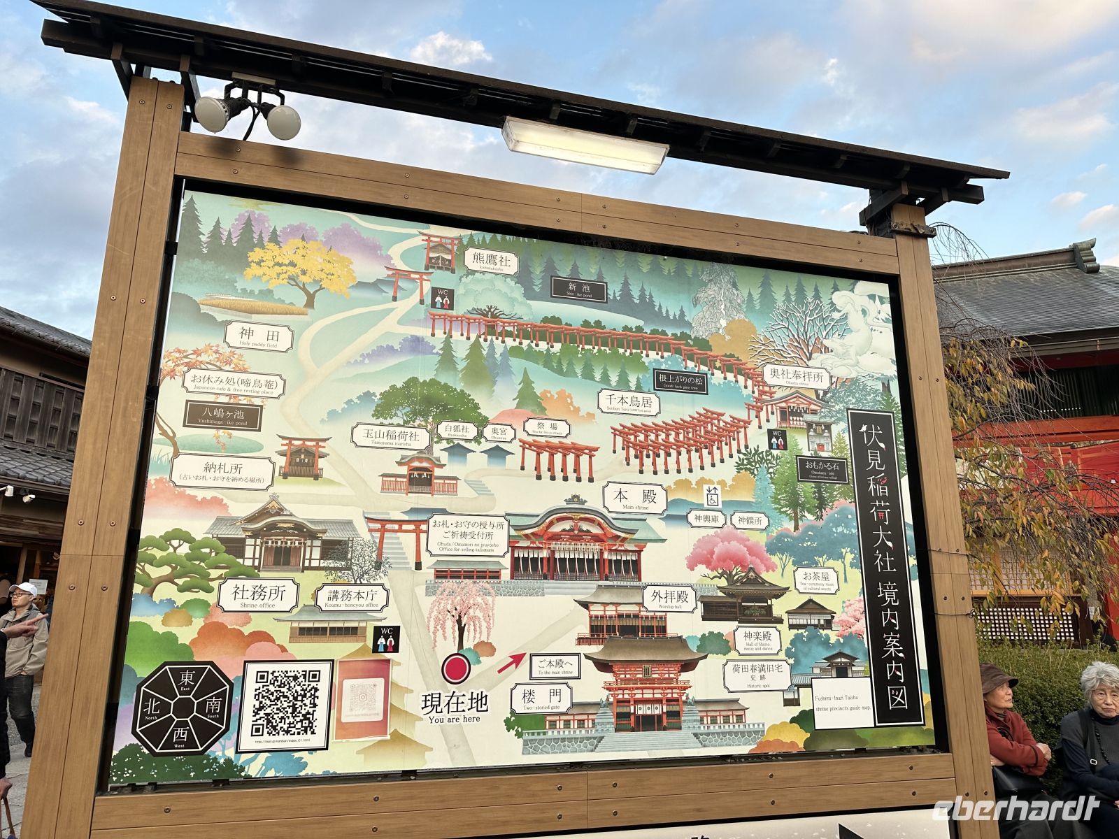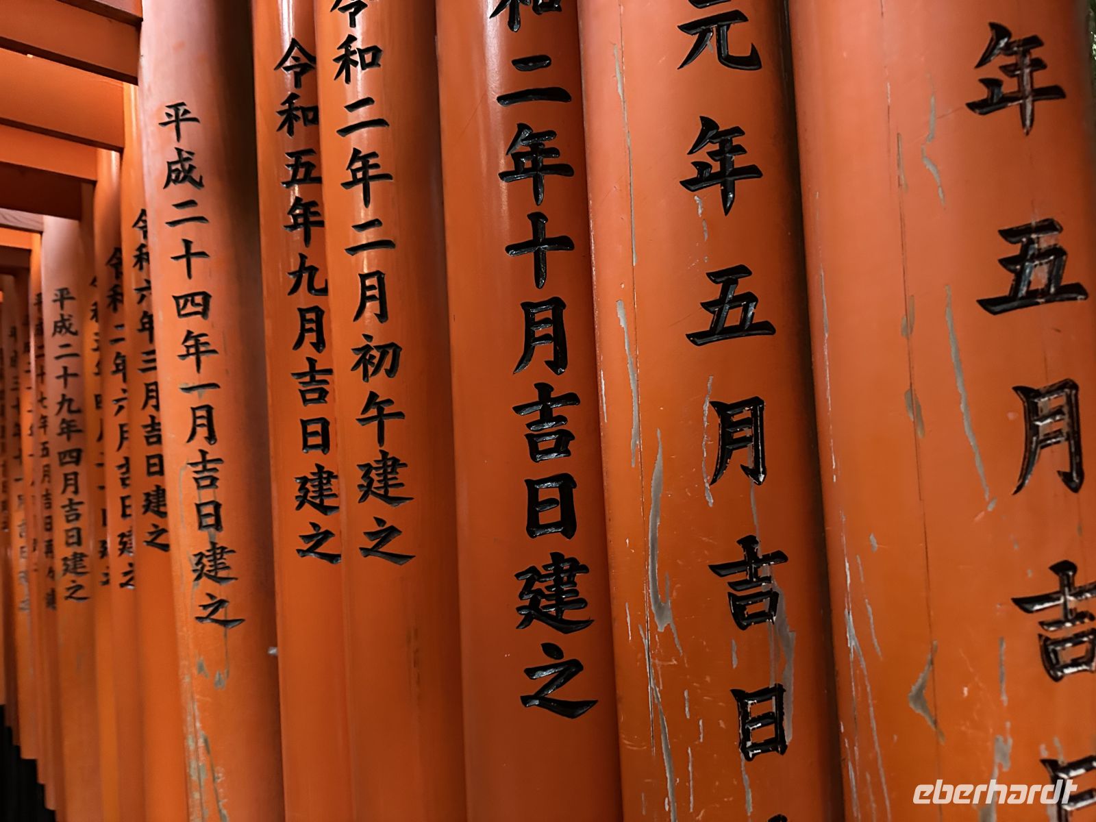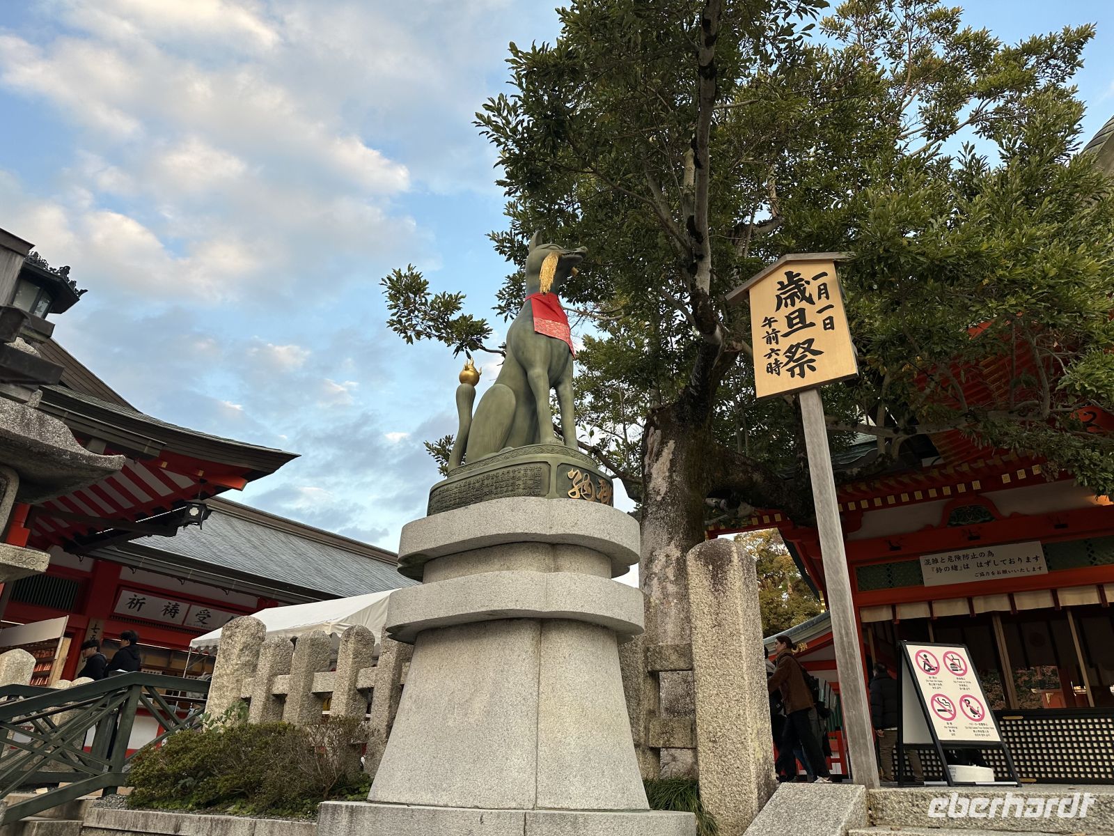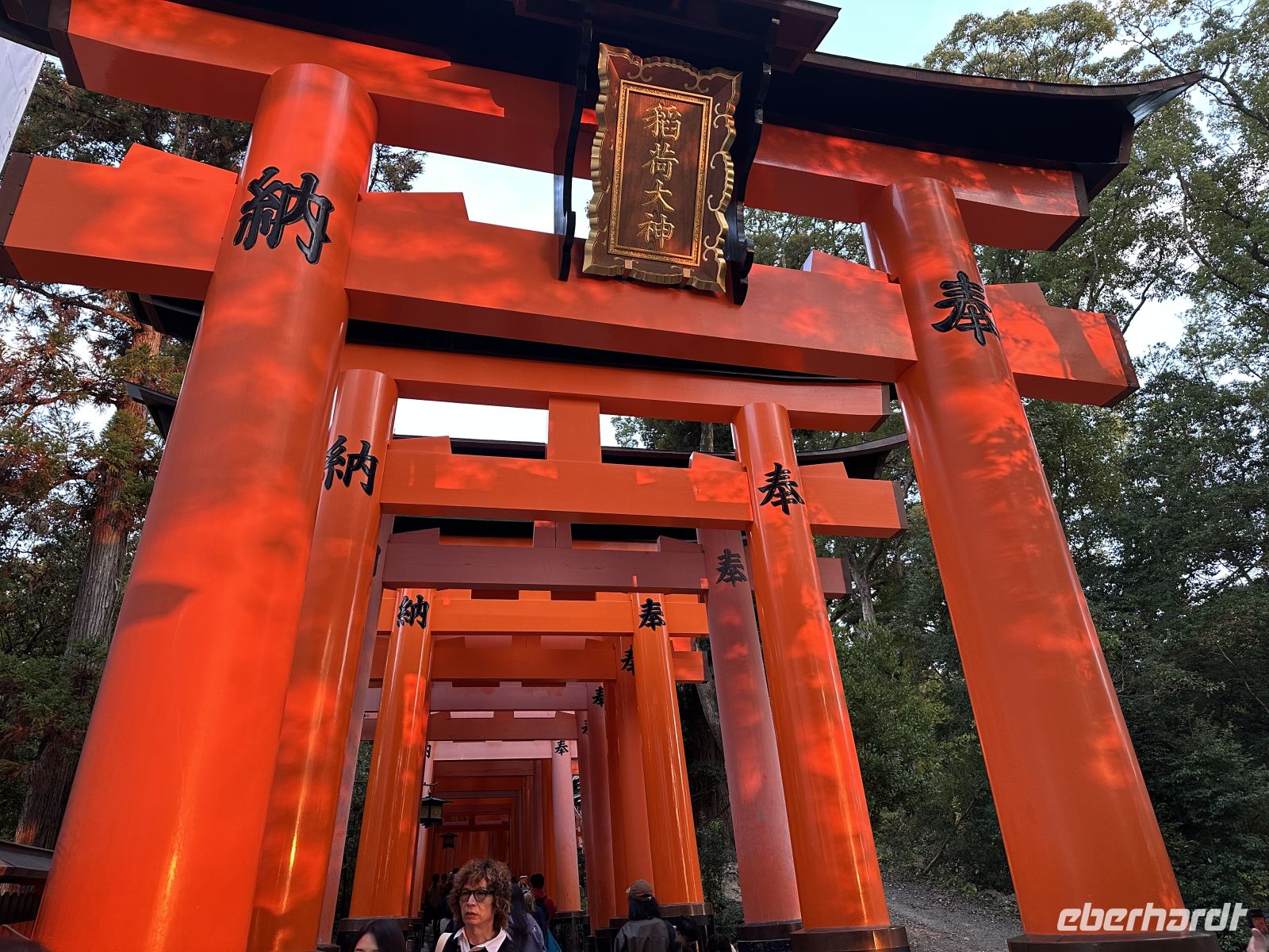 Zum Abschluss unseres Ausflugs besuchen wir den Tempel der tausend Tori. Wir spazieren durch eng aneinander gereihte zinnoberrote Tori. Obwohl der Name "Tausend" lautet, wird geschätzt, dass es auf dem gesamten Berg Inari etwa 10.000 Tori gibt. Jedes dieser Tore wurde von einer Privatperson oder einem Unternehmen in Japan als Dankesgabe oder in der Hoffnung auf geschäftlichen Erfolg und Wohlstand gestiftet. Die Namen der Spender sind auf der Rückseite der Tore in schwarzer Schrift zu sehen.Der Schrein ist dem Kami Inari gewidmet, der Shinto-Gottheit des Reises, der Landwirtschaft, des Wohlstands und des Handels. Überall auf dem Gelände stehn Fuchsstatuen, da die Füchse als Boten des Kami Inari gelten. Sie halten einen Schlüssel zum Reisspeicher oder eine Reisähre im Maul und geben ein tolles Fotomotiv her. Es ist bereits dunkel als wir zum Schiff zurückkehren.