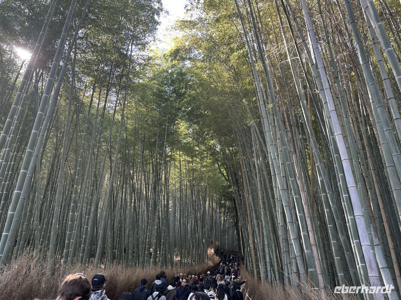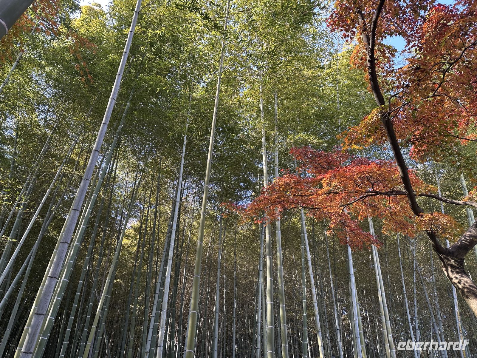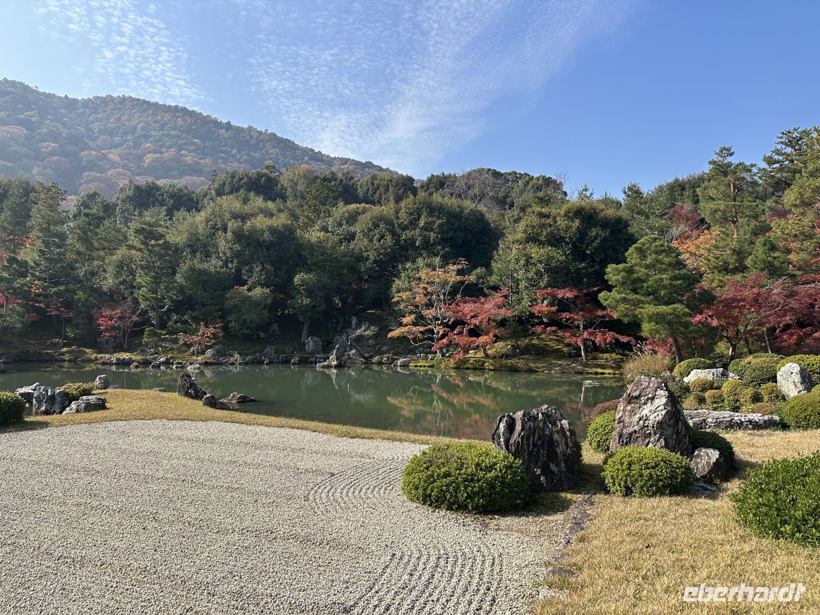 Heute unternehmen wir einen privaten Ausflug. Das heißt, nur unsere Eberhardt Gruppe ist heute gemeinsam unterwegs. Unser Reiseleiter heißt Jun und spricht Deutsch. Unser erstes Ziel ist der Tenryu Tempel, ein bedeutender Zen-Tempel, der zum UNESCO Welterbe zählt. Der Temple wurde 1339 gegründet und zählt zu den fünf großen Zen-Tempeln Kyotos. Trotz mehrerer Brände, die die meisten Gebäude zerstörten (die heutigen stammen hauptsächlich aus der Meiji-Zeit, 1868–1912), gilt er als Hauptsitz der Rinzai-Schule des Zen-Buddhismus. Zunächst durchqueren wir den Zen-Landschaftsgarten, der als eines der ältesten und besten Beispiele traditioneller japanischer Gartenkunst gilt und der sich heute in den schönsten Herbstfarben zeigt. Er wurde im 14. Jahrhundert von dem Zen-Meister Musō Soseki entworfen und ist bis heute in seiner ursprünglichen Form erhalten. Er beinhaltet einen großen Teich mit Felsformationen und integriert die umliegende Landschaft. Direkt hinter dem Nordausgang des Tempelgeländes beginnt der berühmte, riesige Bambuswald von Arashiyama, durch den uns anschließend ein Spaziergang führt. Trotz des großen Gewühles an Menschenmengen, die heute den Tempel besuchen, finden wir unseren Bus wieder. Unser nächstes Ziel ist der Goldene Tempel. Was haben wir für ein Glück. Der Tempel strahlt im Sonnenlicht und die bunten Bäume tun ihr Übriges dazu. Fantastische Bilder gelingen. Unsere Mittagspause verbringen wir im Nishiki Markt, in Kyotos historischer und wichtigster Lebensmittel-Einkaufsstraße. Der Markt befindet sich erstreckt sich über eine schmale, etwa 400 Meter lange Passage und ist vollständig überdacht. Wir kosten uns durch die lokalen Spezialitäten, wie frischen Meeresfrüchten, gegrilltem Aal und feinstem Kobe Beef.