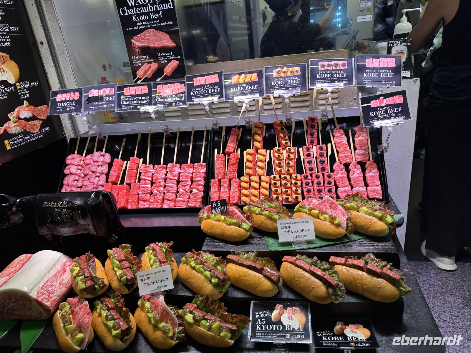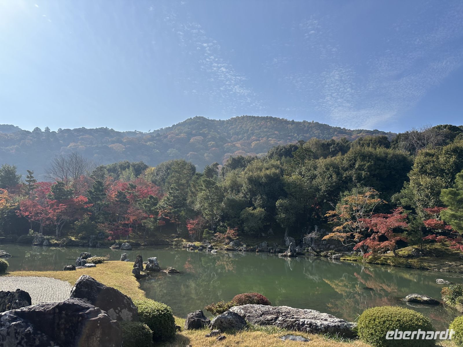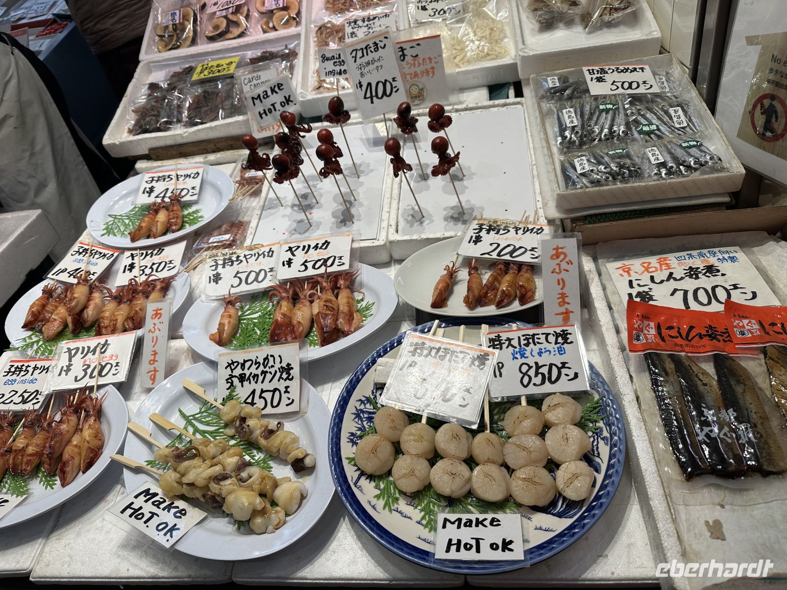 Heute unternehmen wir einen privaten Ausflug. Das heißt, nur unsere Eberhardt Gruppe ist heute gemeinsam unterwegs. Unser Reiseleiter heißt Jun und spricht Deutsch. Unser erstes Ziel ist der Tenryu Tempel, ein bedeutender Zen-Tempel, der zum UNESCO Welterbe zählt. Der Temple wurde 1339 gegründet und zählt zu den fünf großen Zen-Tempeln Kyotos. Trotz mehrerer Brände, die die meisten Gebäude zerstörten (die heutigen stammen hauptsächlich aus der Meiji-Zeit, 1868–1912), gilt er als Hauptsitz der Rinzai-Schule des Zen-Buddhismus. Zunächst durchqueren wir den Zen-Landschaftsgarten, der als eines der ältesten und besten Beispiele traditioneller japanischer Gartenkunst gilt und der sich heute in den schönsten Herbstfarben zeigt. Er wurde im 14. Jahrhundert von dem Zen-Meister Musō Soseki entworfen und ist bis heute in seiner ursprünglichen Form erhalten. Er beinhaltet einen großen Teich mit Felsformationen und integriert die umliegende Landschaft. Direkt hinter dem Nordausgang des Tempelgeländes beginnt der berühmte, riesige Bambuswald von Arashiyama, durch den uns anschließend ein Spaziergang führt. Trotz des großen Gewühles an Menschenmengen, die heute den Tempel besuchen, finden wir unseren Bus wieder. Unser nächstes Ziel ist der Goldene Tempel. Was haben wir für ein Glück. Der Tempel strahlt im Sonnenlicht und die bunten Bäume tun ihr Übriges dazu. Fantastische Bilder gelingen. Unsere Mittagspause verbringen wir im Nishiki Markt, in Kyotos historischer und wichtigster Lebensmittel-Einkaufsstraße. Der Markt befindet sich erstreckt sich über eine schmale, etwa 400 Meter lange Passage und ist vollständig überdacht. Wir kosten uns durch die lokalen Spezialitäten, wie frischen Meeresfrüchten, gegrilltem Aal und feinstem Kobe Beef.