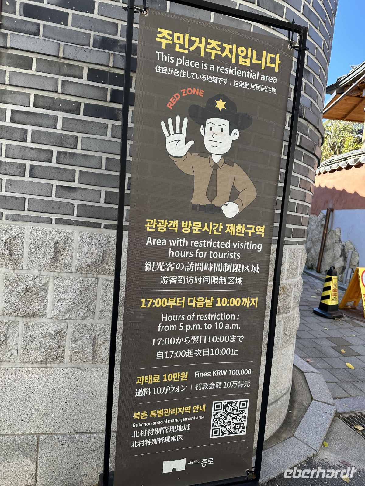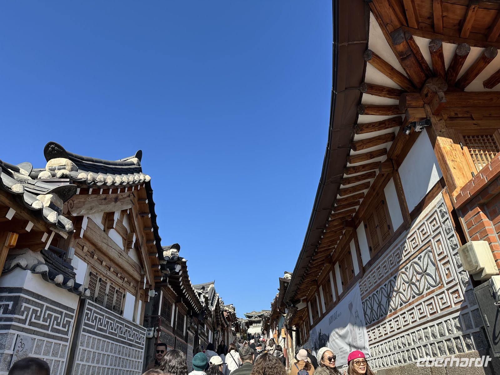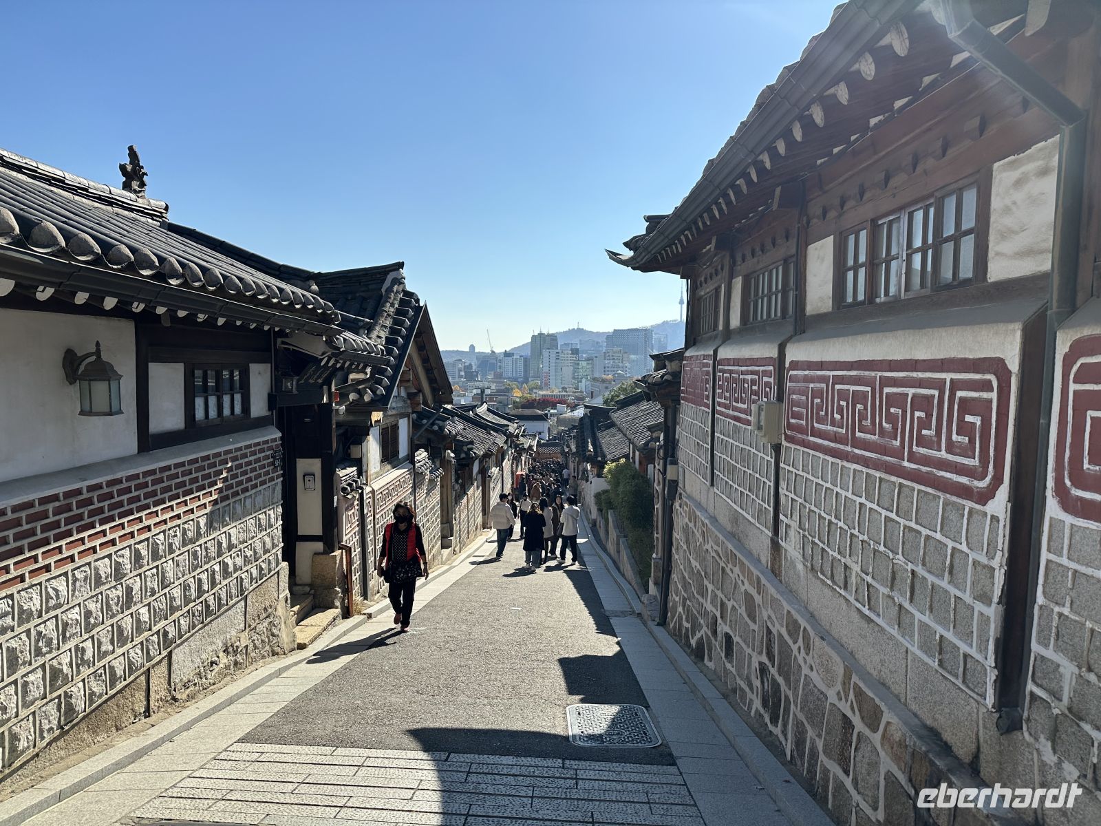 Nach der Palastbesichtiung fahren wir zum Bukchon Hanok Village, ein Wohnviertel zwischen den beiden großen Palästen Gyeongbokgung und Changdeokgung. Es ist berühmt für seine traditionellen koreanischen Häuser (Hanoks). Im Gegensatz zu vielen anderen historischen Stätten ist Bukchon kein Museumsdorf, sondern wird aktiv von Bewohnern Seouls bewohnt. Viele der Hanoks sind private Residenzen oder kleine Pensionen. Um die Privatsphäre und Ruhe der Anwohner zu respektieren, werden wir und alle anderen Besucher durch Schilder und freiwillige Helfer eindringlich gebeten, leise zu sprechen und Lärm zu vermeiden. Bestimmte Gassen, insbesondere die berühmten Bukchon-Gassen mit den "Acht Schönheiten" die die malerischsten Ausblicke bieten, sind als Ruhezonen gekennzeichnet. Die Gassen sind gesäumt von hunderten traditionellen koreanischen Holzhäusern aus der Joseon-Dynastie. Sie zeichnen sich durch geschwungene Dächer, hölzerne Rahmen und warme Lehmwände aus. Das Viertel war während der Joseon-Zeit das Wohngebiet hochrangiger Regierungsbeamter und Adelsfamilien, was den hohen historischen Wert der Gegend unterstreicht. Das Dorf liegt auf einem Hügel, was zu malerischen Ausblicken auf die modernen Hochhäuser Seouls führt, die sich hinter den traditionellen Hanoks erheben. Man muss gut zu Fuß sein, um die steilen Straßen zu erklimmen.