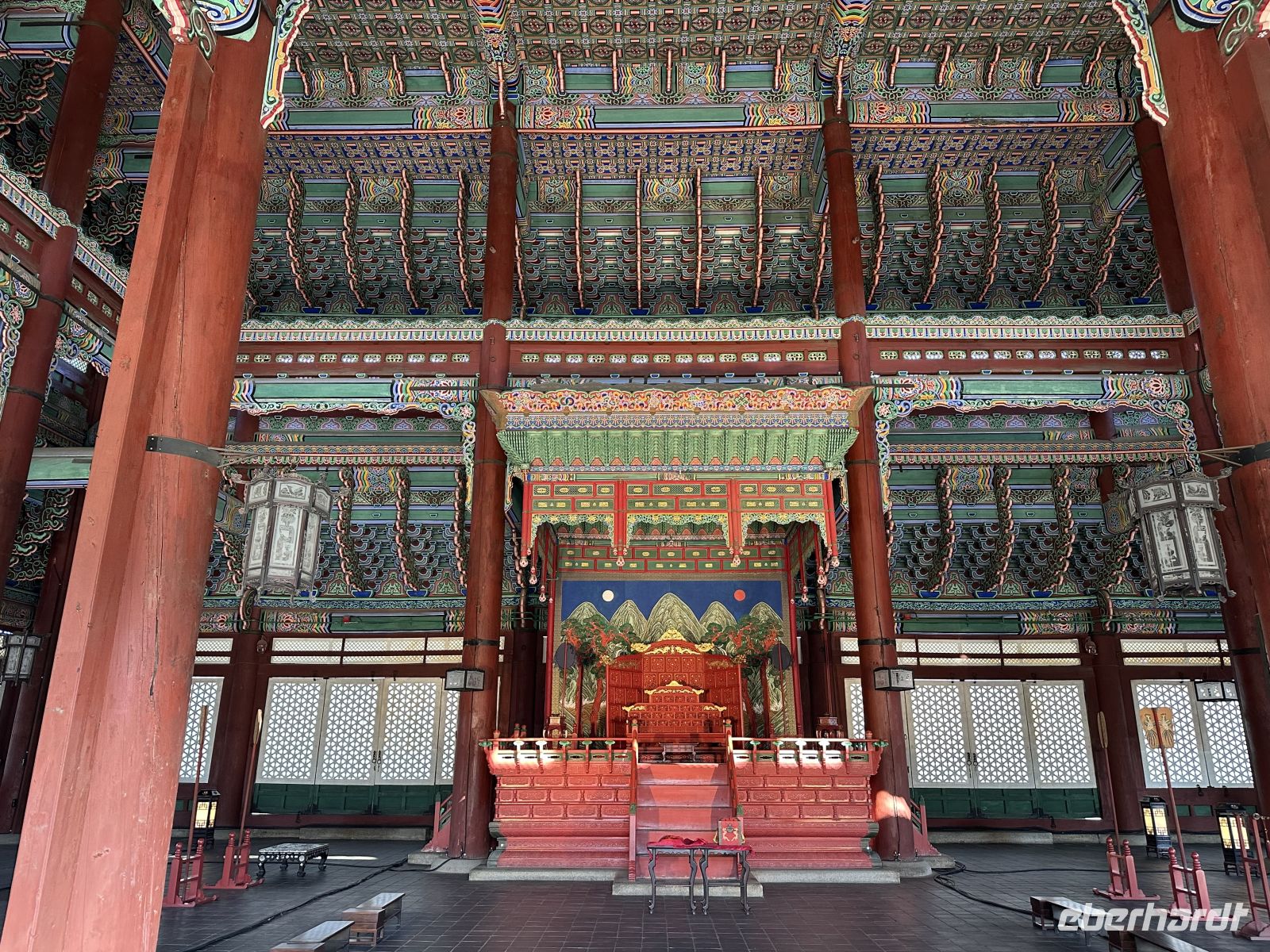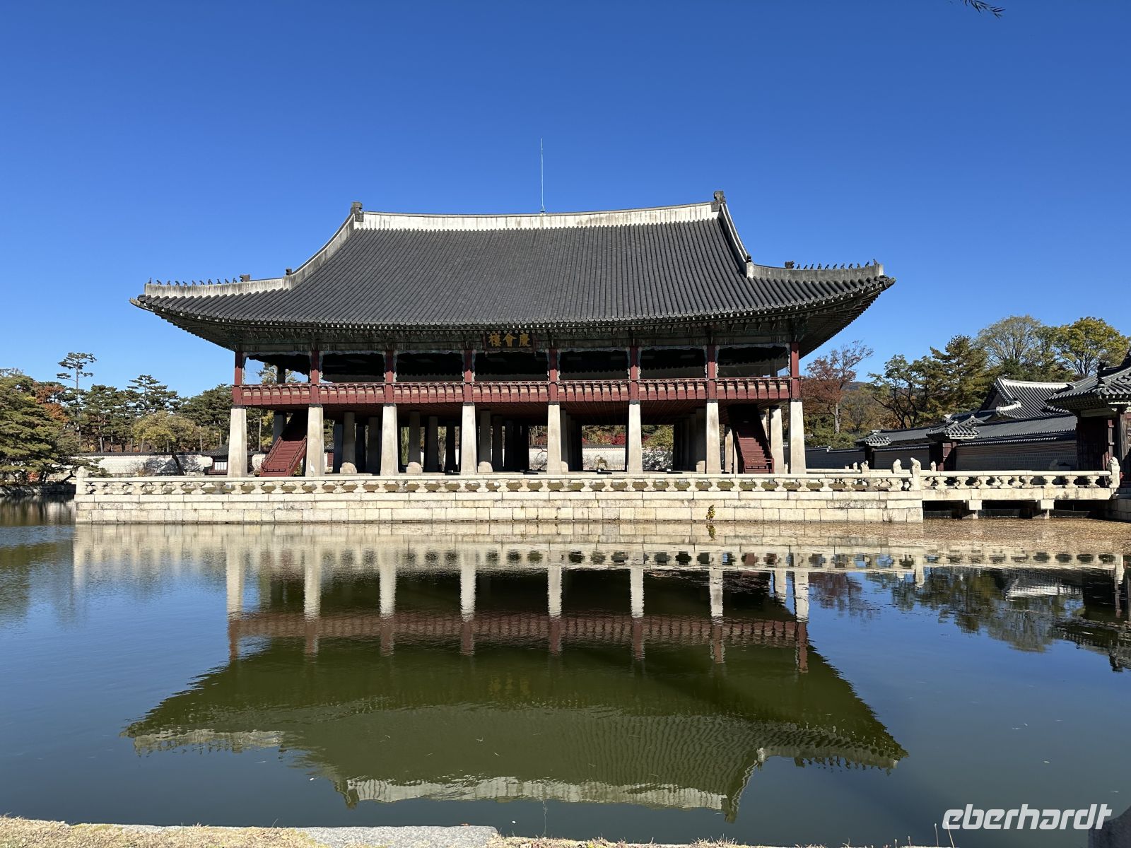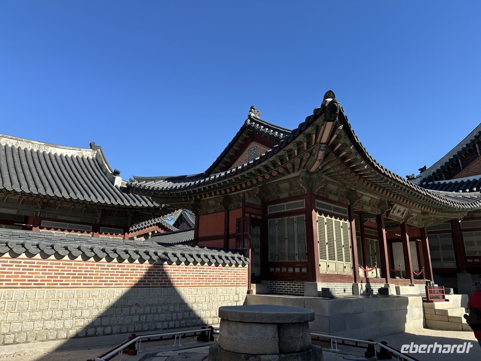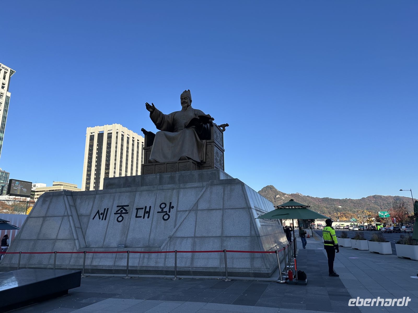 Ab sieben Uhr steht ein üppiges Frühstücksbuffet bereit. Wir stärken uns für den Tag, verladen die Koffer und fahren Richtung Gyeongbokgung Palast. Zunächst besuchen wir den Gwanghwamun-Platz, der sich direkt vor dem Palast befindet. Dieser Platz ist ein bedeutendes Wahrzeichen und das historische Zentrum Seouls. Der Platz erstreckt sich entlang der Sejong-daero, einer Hauptverkehrsader, die während der Joseon-Dynastie (1392–1897) die Straße der Sechs Ministerien war und somit bereits das Zentrum der königlichen Verwaltung bildete. Heute tobt hier der normale Großstadtverkehr. Kaya zeigt und erklärt uns die Statue von König Sejong, die in der Mitte des Platzes steht und dem vierten König der Joseon-Dynastie gewidmet ist. König Sejong ist berühmt für die Erschaffung des koreanischen Alphabets. Der Platz dient auch als monumentaler Vorhof zum Gyeongbokgung-Palast, der vom mächtigen Gwanghwamun-Tor abgeschlossen wird. Wir besuchen jetzt die Wachablösungszeremonie, eine farbenfrohe historische Nachstellung des königlichen Wachwechsels aus der Joseon-Dynastie. Natürlich sind wir nicht alleine hier. Vor allem junge Mädchen fallen durch ihre wunderschönen glitzernden Kleider auf. Aber auch viele junge Männer sind in traditioneller Kleidung unterwegs. Die königliche Wachablösungszeremonie vor dem Gwanghwamun-Tor ist ein großes Spektakel und eine der Hauptattraktionen Seouls. Sie stellt detailgetreu den Prozess dar, wie die Wachen das Tor zur Hauptstadt während der Joseon-Dynastie bewachten und übergaben. Die Zeremonie dauert insgesamt etwa 20 Minuten. Zunächst erscheint der Zeremonienmeister, das heißt, ein Offizier kommt an, um die Zeremonie zu überwachen. Es folgt der Einmarsch der Wachen: Die Torwachen marschieren unter militärischer Musikbegleitung zum Tor. Sie tragen die Uniformen, Rüstungen und Waffen, die authentisch den historischen Aufzeichnungen nachempfunden sind. Die Kommandeure der abtretenden und der eintretenden Wachen inspizieren sich gegenseitig und tauschen das königliche Siegel aus, um offiziell die Verantwortung für das Tor zu übergeben.Die neuen Wachen nehmen ihre Positionen ein, während die abgetretenen Wachen abmarschieren. Ein letzter Trommelschlag signalisiert das Ende der Zeremonie. Ein wesentliches Element der Zeremonie ist die traditionelle königliche Militärkapelle. Ihre Musik ist laut und feierlich. Die Musiker tragen ebenfalls historische Kleidung und spielen Instrumente wie Trommeln, Hörner und Oboen. Wir widmen uns nun der Besichtigung des Gyeongbokgung-Palastes, der einer der größten und wichtigsten der fünf großen Paläste Seouls ist und aus der Ära der Joseon-Dynastie stammt. Die Anlage ist streng nach den Prinzipien der koreanischen Königsarchitektur ausgerichtet, beginnend mit dem Haupttor Gwanghwamun, durch welches wir das Palastgelände betreten. Die Thronhalle ist der zentrale und wichtigste Komplex. Hier wurden offizielle Staatsgeschäfte geführt und der König inthronisiert. Durch schmale Fenster können heute die Besucher einen Blick hinein werfen. Als nächstes kommen wir zum Gyeonghoeru-Pavillon. Dies ist ein großer, offener Pavillon auf Stelzen in der Mitte eines künstlichen Sees. Er diente für königliche Bankette und Feste.