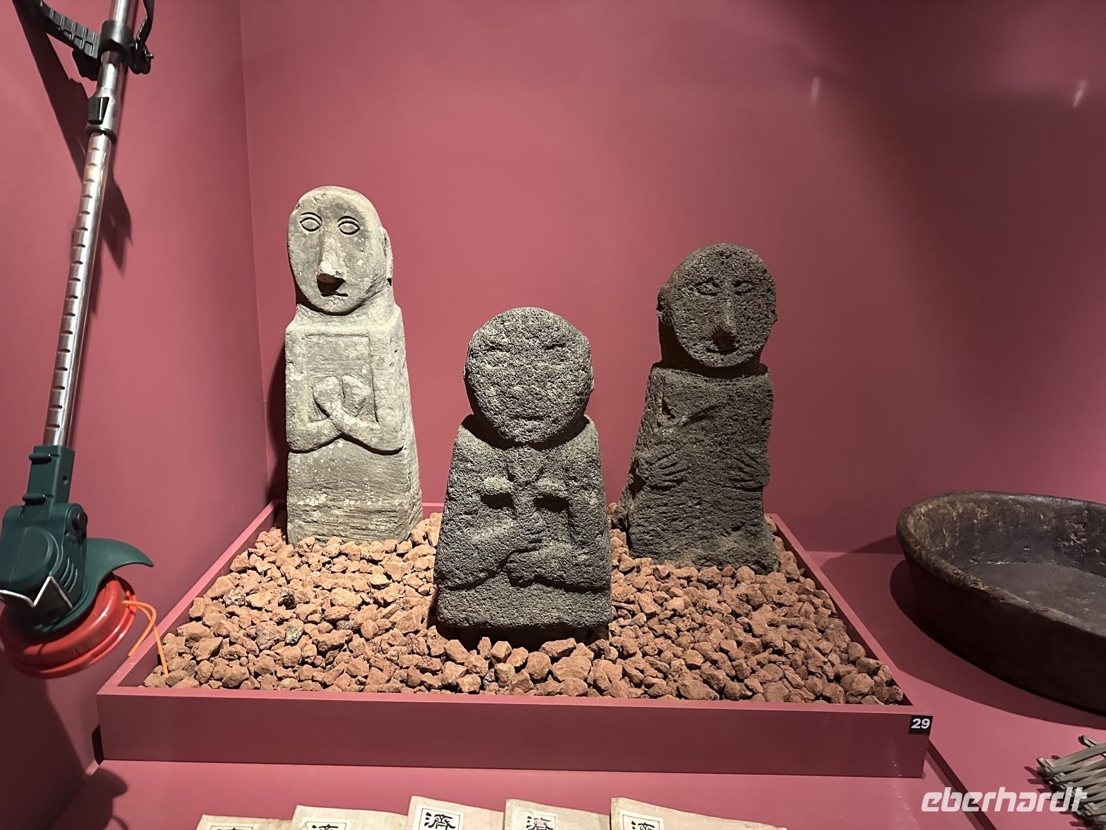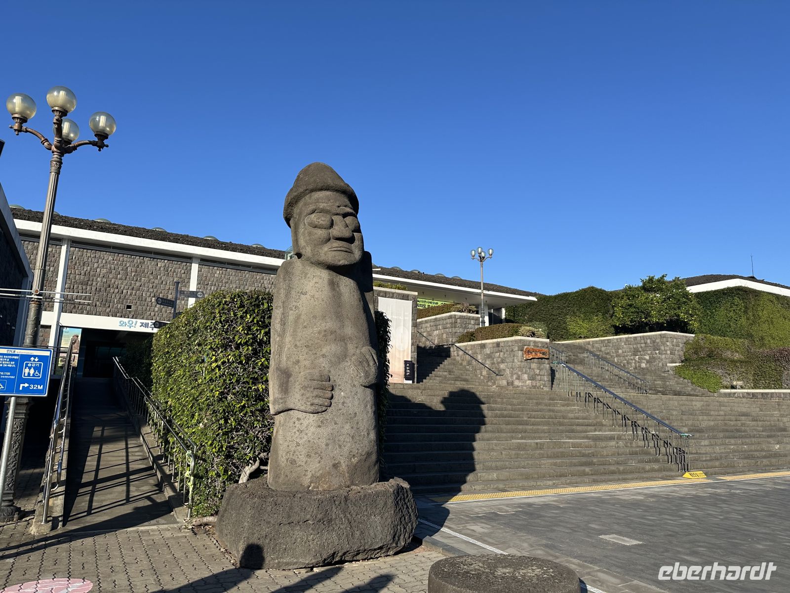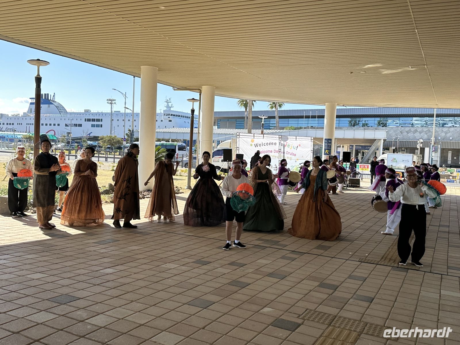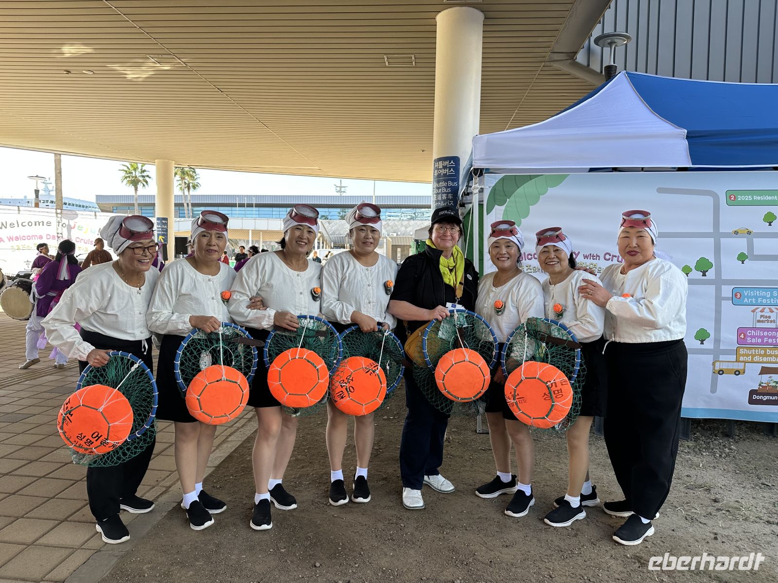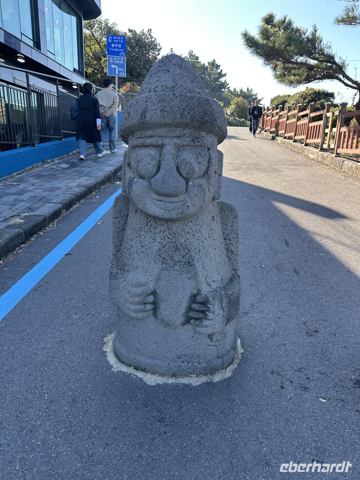 Den Vormittag verbringen wir auf See. So ist Zeit für ein gemütliches Frühstück im Restaurant. Hier können wir uns bedienen lassen, aus der Karte wählen und mit etwas Glück auch einen Fensterplatz ergattern. Um elf treffen wir uns zur Vorbesprechung auf den Ausflug, denn deutschsprachige Guides gibt es nicht und so ist es besser, wenn wir uns ein bisschen vorbereiten. 13.00 Uhr bekommen wir im Theater Sticker, die uns ausweisen zu welchem Bus wir gehören. Heute ist es die Nummer 13. Im Hafen erwartet uns eine Musik- und Tanzgruppe und eine Gruppe der berühmten Jeju-Taucherinnen, die uns auffordern, sich mit uns zu fotografieren. Das ist eine große Überraschung und eine unglaubliche Erinnerung. Die Haenyeo (zu Deutsch: „Seefrauen“) sind die traditionellen Taucherinnen der südkoreanischen Insel Jeju. Sie tauchen ohne Sauerstoffgeräte bis zu 20 Meter tief und sammeln Meeresfrüchte wie Seeigel, Seetang und Muscheln für ihren Lebensunterhalt. Sie sind seit Jahrhunderten aktiv und spielten in der oft matriarchalisch geprägten Gesellschaft von Jeju traditionell die Rolle der Hauptversorgerinnen der Familie. Nie im Leben hätte ich damit gerechnet, dass sie uns am Hafen begrüßen und sich mit uns fotografieren lassen. Sie arbeiten oft in Gruppen und sind in Genossenschaften organisiert, die die Fanggebiete und -regeln festlegen. Die Arbeit ist physisch extrem anstrengend und gefährlich. Viele der Taucherinnen sind heute über 60 oder 70 Jahre alt, da es nur wenig Nachwuchs gibt. Ihre Kultur und Praxis wurden 2016 von der UNESCO in die Liste des immateriellen Kulturerbes der Menschheit aufgenommen. Nach dieser herzerwärmenden Begrüßung steigen wir in unseren Ausflugsbus und lernen Yoon-Sun kennen, die heute unsere örtliche Reiseleiterin ist. Unser erster Fotostopp findet am Drachenfelsen statt. Der Felsen ist eine beeindruckende Basaltformation, die durch Erosion über Tausende von Jahren geformt wurde. Er ragt etwa 10 Meter über das Wasser hinaus und ist rund 30 Meter lang, wobei ein Teil unter Wasser liegt. Die Form erinnert tatsächlich an den Kopf und Hals eines brüllenden Drachen, der gerade aus dem Meer auftaucht oder in den Himmel aufsteigen will. Hier treffen wir auch zum ersten Mal auf einen Händler mit Hallabong. Das ist eine Hybrid-Zitrusfrucht, die durch die Kreuzung der Kiyomi-Orange und der Ponkan-Mandarine entstanden ist. Ursprünglich in Japan gezüchtet, wird sie in Südkorea fast ausschließlich auf Jeju-Island angebaut. Sie wurde nach dem höchsten Berg Koreas, dem Hallasan auf Jeju, benannt. Während wir zurück kehren zu unserem Bus fallen uns zwei mannshohe Steinfiguren auf. Diese sogenannten Großväter werden uns heute noch merhmals begegnen. Die Figuren heßen Dol Hareubang, was wörtlich „Steingroßvater“ im Dialekt von Jeju bedeutet. Es sind große, stilisierte Statuen aus dem porösen, dunklen Vulkangestein der Insel. Sie haben hervorstehende Augen, eine große Nase, einen leichten Gesichtsausdruck und tragen eine runde Mütze. Ursprünglich wurden sie im 18. Jahrhundert während der Joseon-Dynastie aufgestellt und dienten als Wächter und Grenzmarker an den Eingängen von Festungen oder Dörfern. Sie sollten das Wohlergehen und den Wohlstand der Gemeinschaft schützen und böse Geister abwehren. Sie gelten als Götter, die Schutz und Fruchtbarkeit spenden. Es gibt den Volksglauben, dass das Reiben ihrer Nase die Geburt eines Jungen begünstigt. Die Dol Hareubang sind heute das ikonische Wahrzeichen und ein Symbol der Insel Jeju.