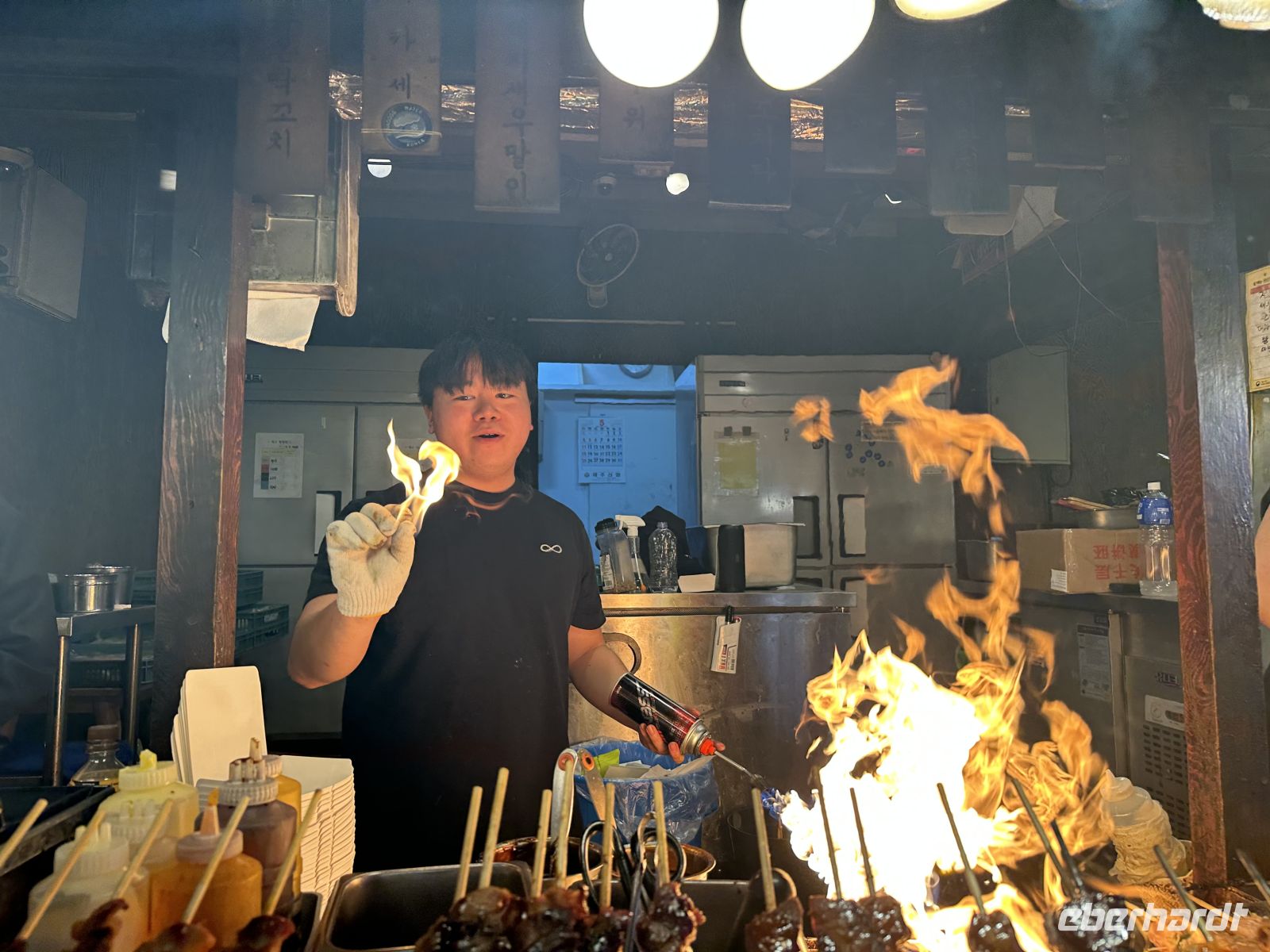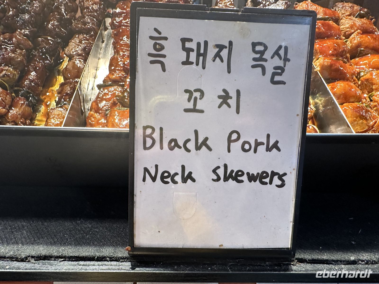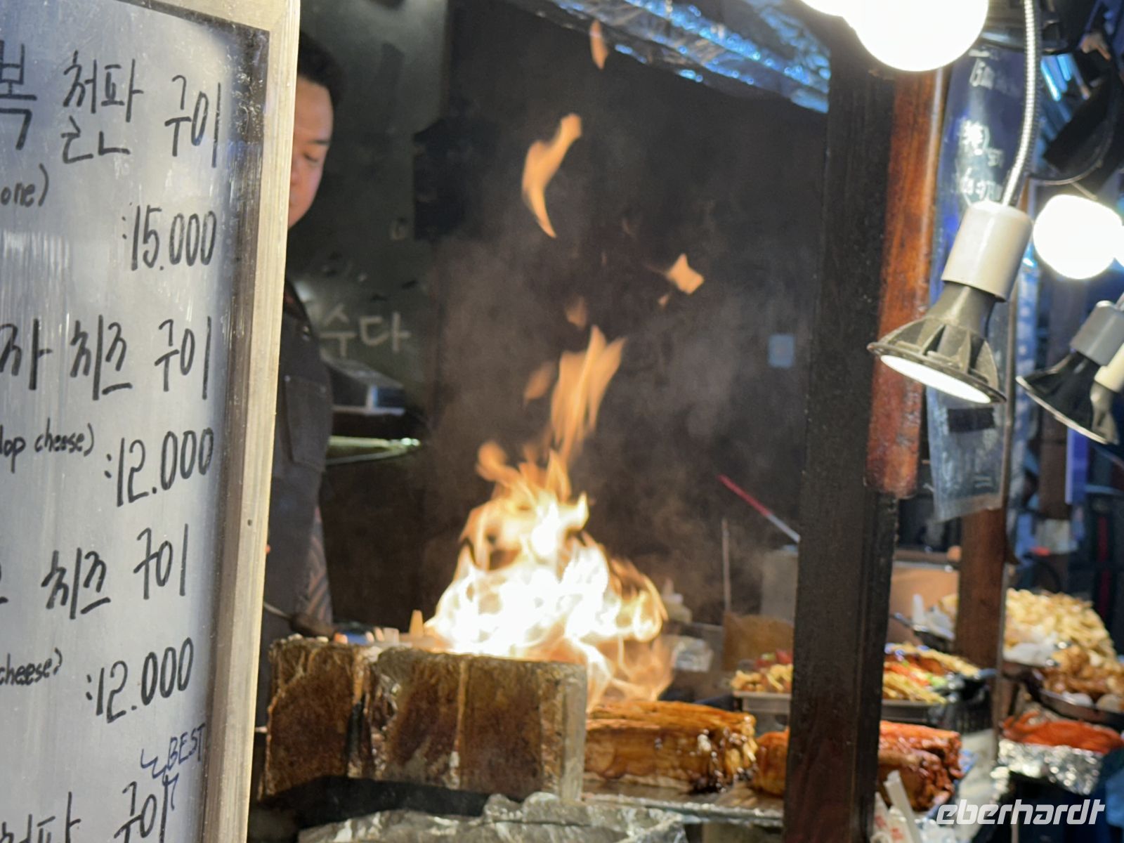 Als nächstes besuchen wir den Dongmun Traditional Market (Dongmun Jae-Rae Si-Jang), welcher der größte und älteste traditionelle Markt in Jeju-Stadt ist. Der Markt ist berühmt für seine frischen Meeresfrüchte, direkt vom Meer, aber auch für landwirtschaftliche Produkte, insbesondere die Jeju-Mandarinen und andere lokale Spezialitäten. Wir nutzen die Zeit und kosten frisch gepressten Mandarinensaft und Black Pork, das berühmte schwarze Schwein. Das Schwarze Schwein von Jeju ist eine einheimische Schweinerasse der Insel Jeju und gilt als deren wichtigste kulinarische Spezialität. Es handelt sich um eine traditionelle Rasse, die sich durch ihr schwarzes Fell und eine robustere Natur auszeichnet. Sie ist als koreanisches Naturdenkmal Nr. 550 geschützt. Das Fleisch ist bekannt für seinen intensiven, reichhaltigen Geschmack, eine saftige Textur und eine gute Marmorierung. Es wird oft als "Wagyu-Version" des Schweinefleischs bezeichnet. Es wird traditionell in dicken Scheiben als Korean BBQ (Barbecue) serviert und oft über Holzkohle oder brennendem Heu gegrillt, was ihm ein einzigartiges Raucharoma verleiht. In unserem Fall gönnt uns der Verkäufer eine kleine Show, in dem er buchstäblich mit dem Feuer spielt. Zum Ende des Ausflugs besuchen wir das Naturkunde- und Folkloremuseum. Hier gibt es übrigens leckeren Kaffee.