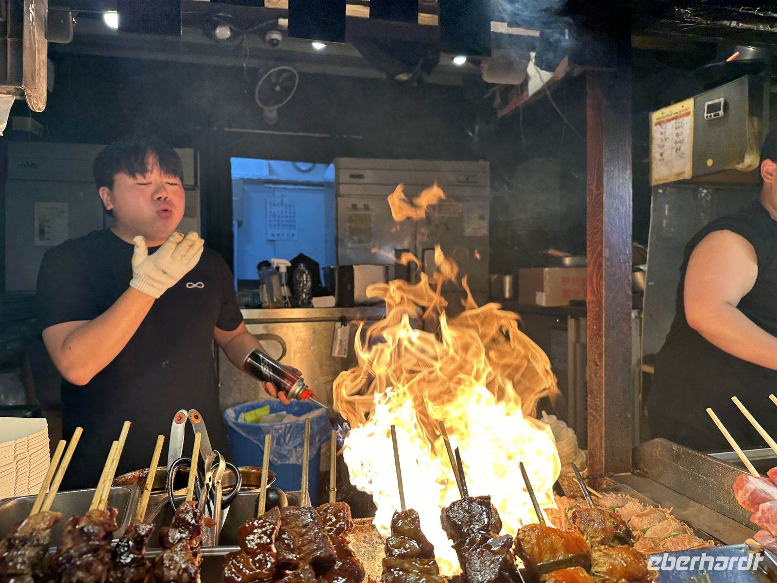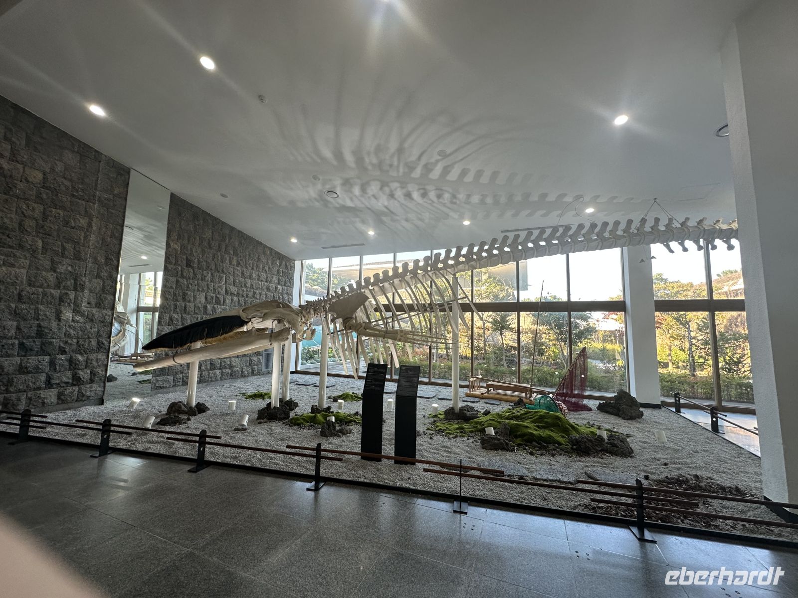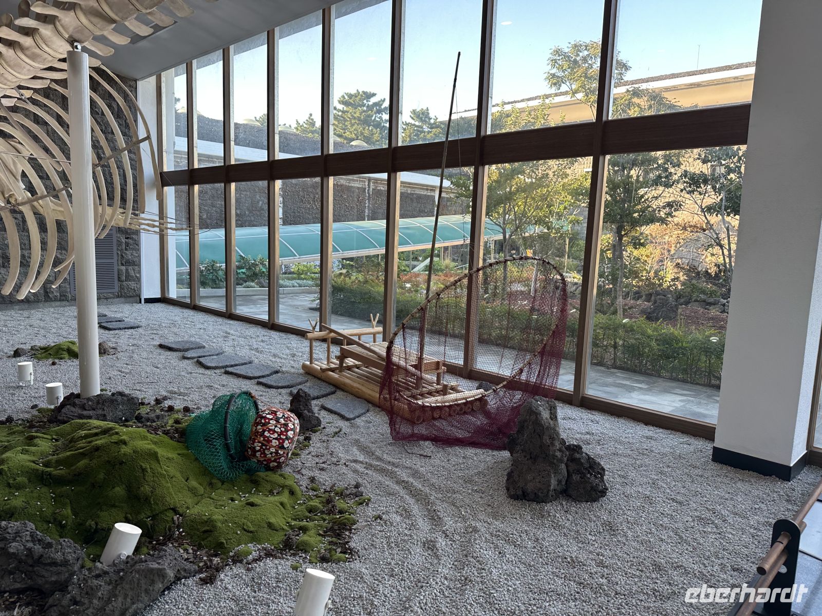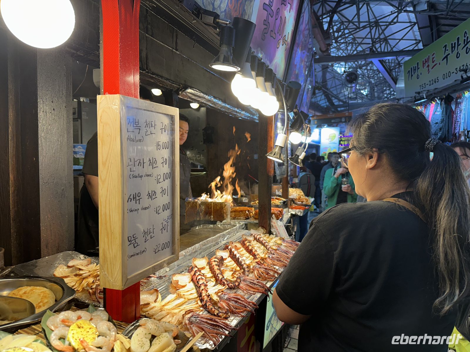 Als nächstes besuchen wir den Dongmun Traditional Market (Dongmun Jae-Rae Si-Jang), welcher der größte und älteste traditionelle Markt in Jeju-Stadt ist. Der Markt ist berühmt für seine frischen Meeresfrüchte, direkt vom Meer, aber auch für landwirtschaftliche Produkte, insbesondere die Jeju-Mandarinen und andere lokale Spezialitäten. Wir nutzen die Zeit und kosten frisch gepressten Mandarinensaft und Black Pork, das berühmte schwarze Schwein. Das Schwarze Schwein von Jeju ist eine einheimische Schweinerasse der Insel Jeju und gilt als deren wichtigste kulinarische Spezialität. Es handelt sich um eine traditionelle Rasse, die sich durch ihr schwarzes Fell und eine robustere Natur auszeichnet. Sie ist als koreanisches Naturdenkmal Nr. 550 geschützt. Das Fleisch ist bekannt für seinen intensiven, reichhaltigen Geschmack, eine saftige Textur und eine gute Marmorierung. Es wird oft als "Wagyu-Version" des Schweinefleischs bezeichnet. Es wird traditionell in dicken Scheiben als Korean BBQ (Barbecue) serviert und oft über Holzkohle oder brennendem Heu gegrillt, was ihm ein einzigartiges Raucharoma verleiht. In unserem Fall gönnt uns der Verkäufer eine kleine Show, in dem er buchstäblich mit dem Feuer spielt. Zum Ende des Ausflugs besuchen wir das Naturkunde- und Folkloremuseum. Hier gibt es übrigens leckeren Kaffee.