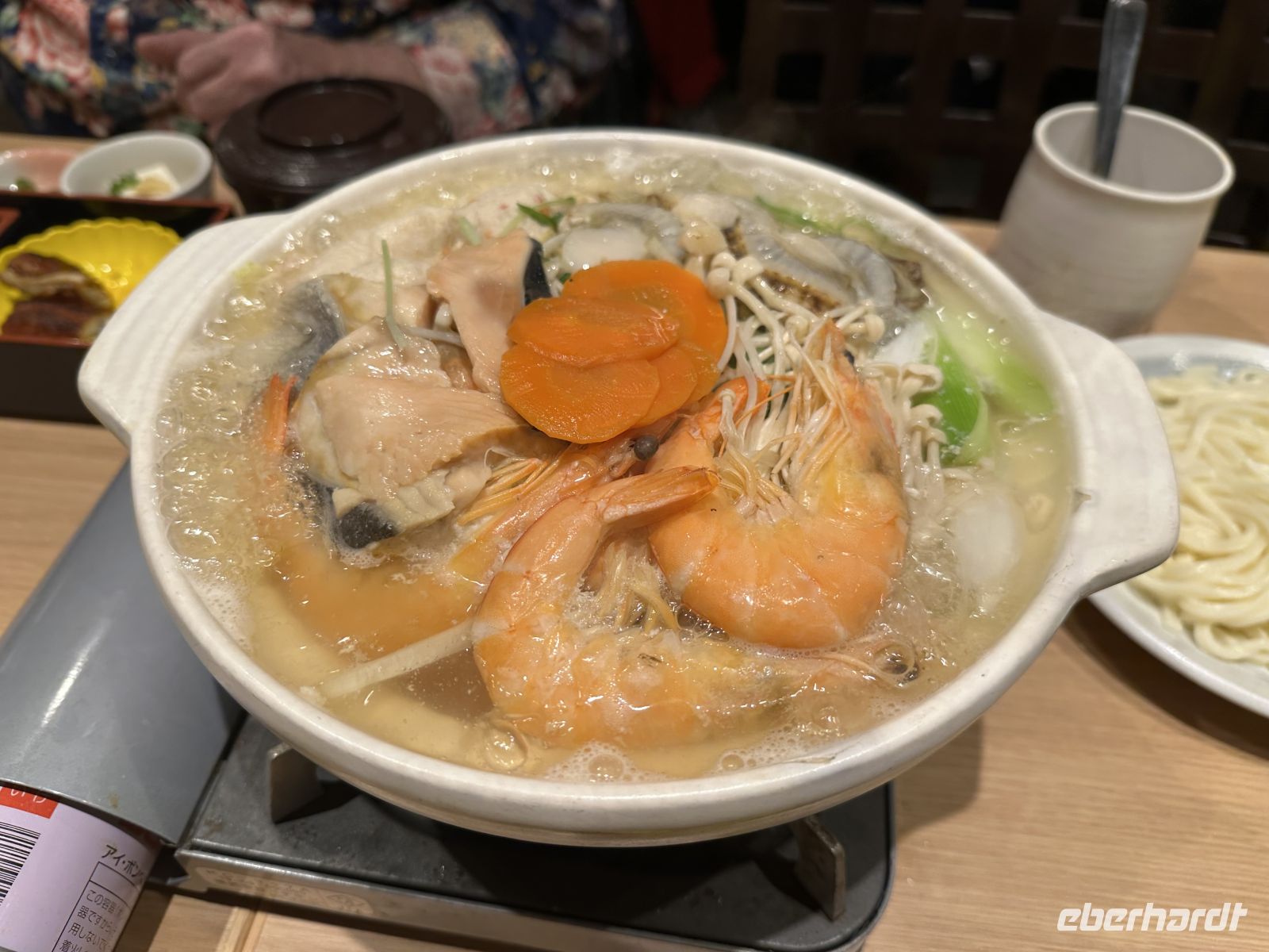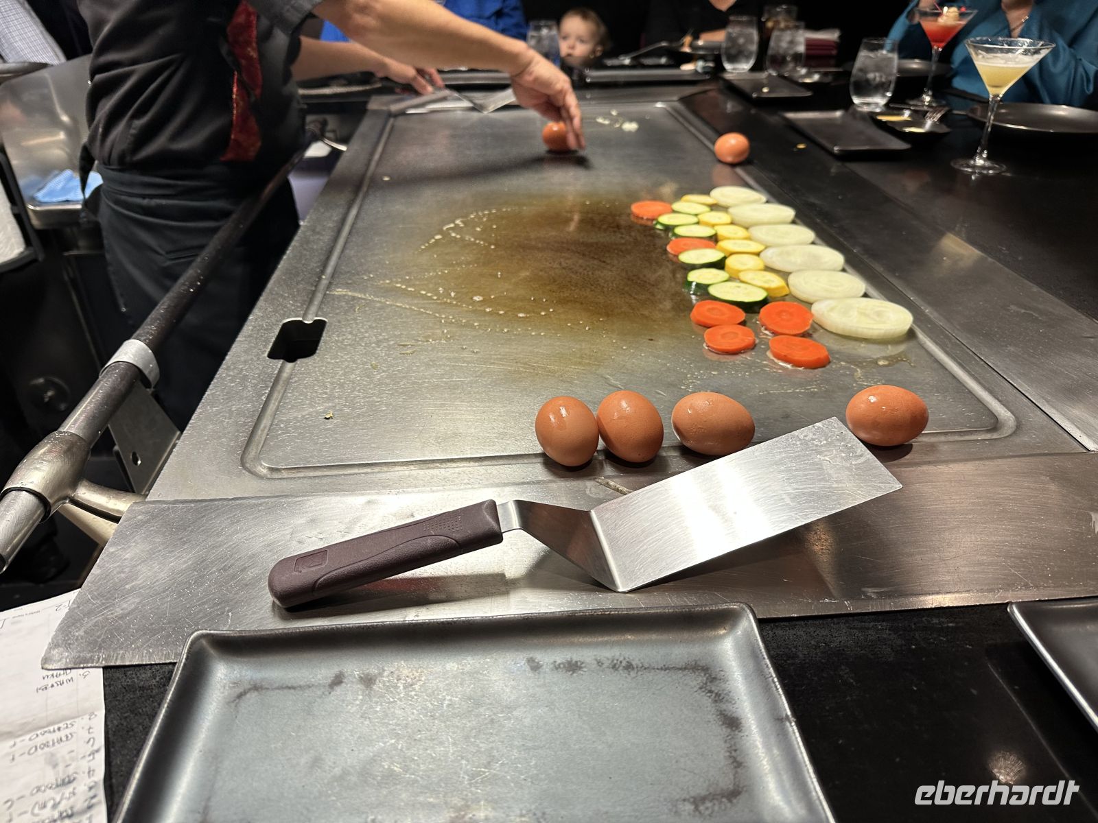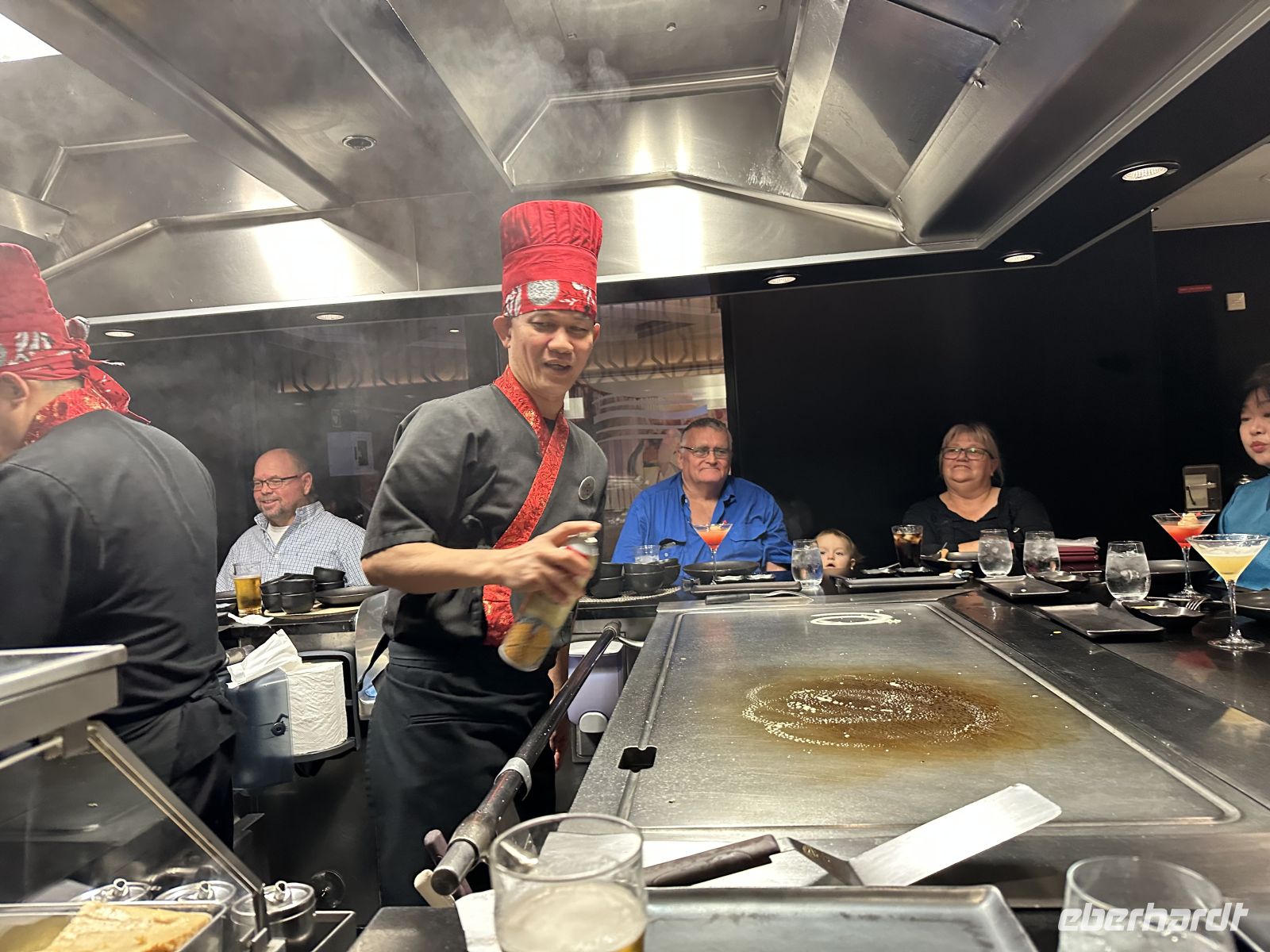 Viele Seetage gibt es nicht auf unserer Reise. Also nutzen wir heute den Tag und besuchen das Tepanyaki Restaurant. Das ist eines der Spezialitätenrestaurants mit Aufpreis, von denen wir ein bis drei – je nach Kabinenkategorie – inklusive haben. Auf großen, flachen Stahlgrills (Teppan) wird das Essen direkt vor unseren Augen zubereitet. Das Highlight ist der Koch, der gleichzeitig Entertainer ist. Er jongliert mit seinen Messern und mit den Eiern, die dann zusammen mit Nudeln anbraten werden. Als Vorspeise gibt es eine Suppe und einen Salat. Das Hauptgericht können wir wählen. Es gibt Fleisch wie Steak und Hähnchen oder Meeresfrüchte (Garnelen und Jakobs-muscheln), die auf dem Grill zubereitet werden. Dazu werden der Knoblauch-Bratreis und gegrilltes Gemüse serviert. Selbstverständlich darf ein süßer Nachtisch nicht fehlen. Letztendlich ist der Besuch des Tepanyaki weniger ein intimes Abendessen, sondern vielmehr eine lebhafte Dinner-Show mit frischen, herzhaften Speisen.