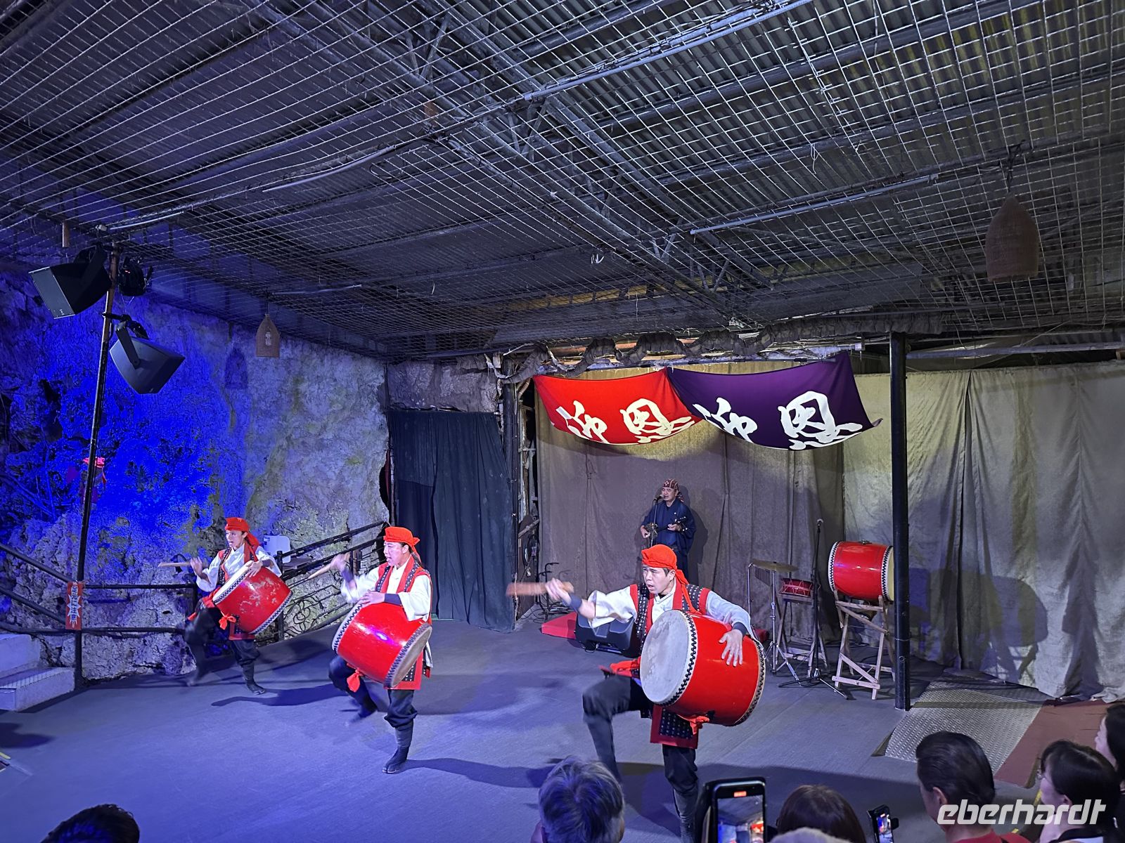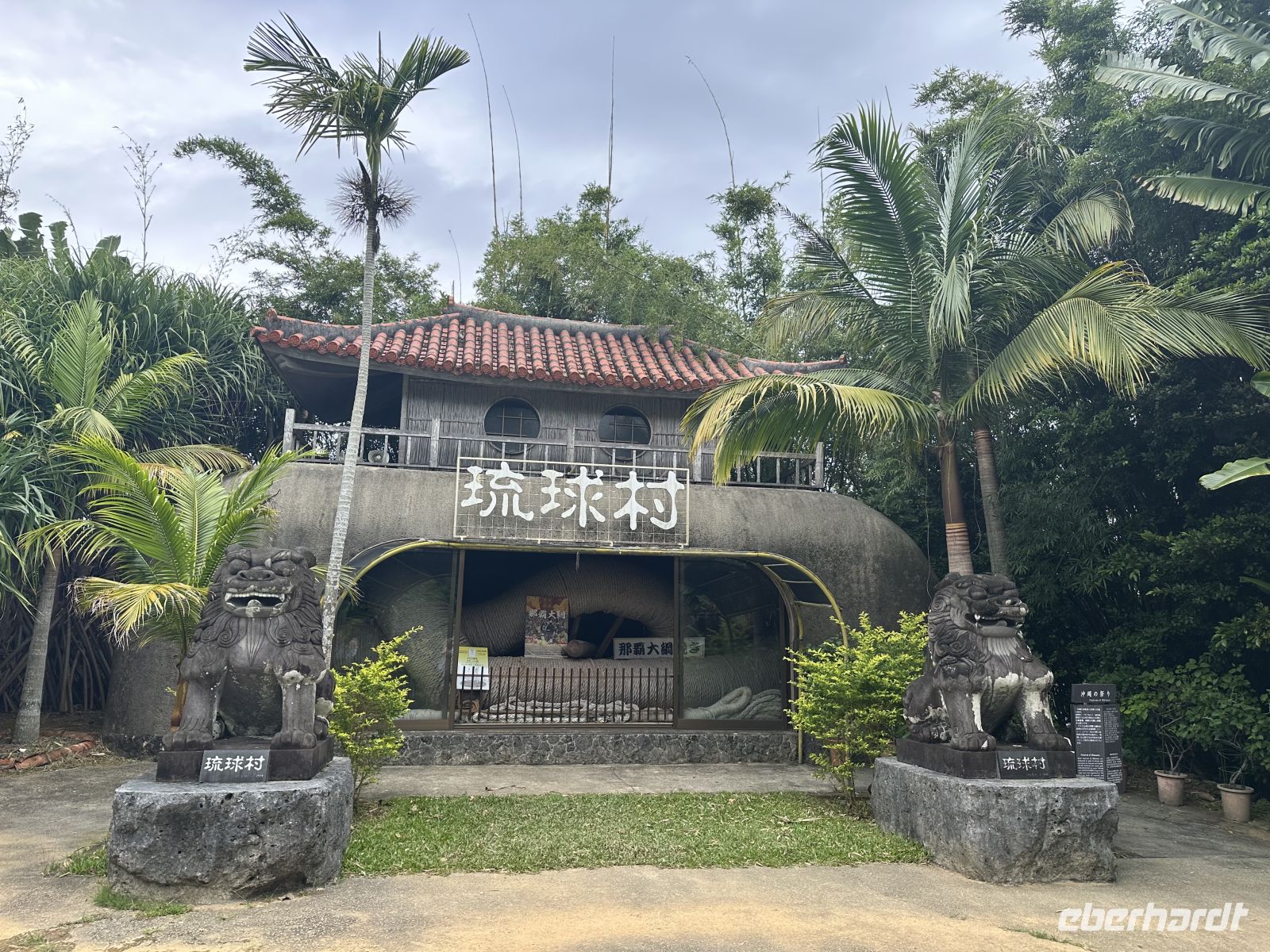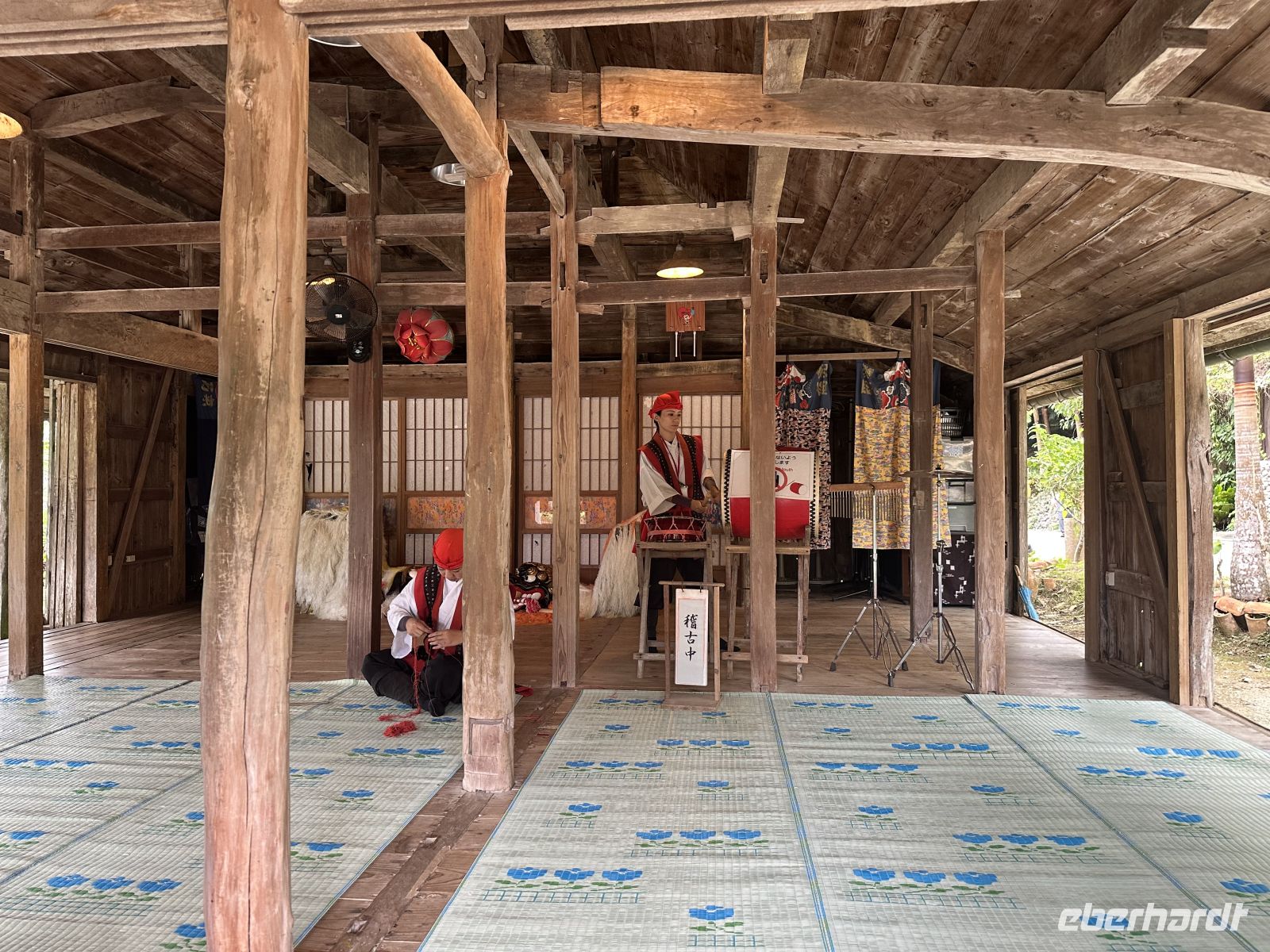 Unser nächstes Ziel ist das Ryukyu Folk Village, ein Freilichtmuseum und ein Kultur-Themenpark. Leider muss man sagen, dass dieses Museums-Dorf seine besten Zeiten scheinbar hinter sich hat. Die schönen Minka-Häuser, die einst in belebten Dörfern standen und von dort hierher versetzt wurden, stehen zum großen Teil leer. In einem ist ein Webstuhl zu sehen, in einem anderen wird gesunder grüner Tee angeboten. Auch Sänger und Musiker sind in manchen Häusern aktiv. Der Höhepunkt aber ist die Trommel- und Tanzaufführung im Theater. Hier erleben wir eine wunderbare Präsentation der okinawanischen Volkskunst. Das zentrale Element der Darbietung ist der Eisa-Tanz und der Ryukyu-Tanz. Der Eisa ist der bekannteste Trommel- und Tanzstil Okinawas und war ursprünglich ein ritueller Tanz, der während des buddhistischen Bon-Festes aufgeführt wurde, um die Geister der Ahnen zu ehren und zu verabschieden. Das Herzstück des Eisa sind die Trommeln. Die Künstler schlagen sie mit großer Wucht und wir merken, dass sie mit ganzem Herzen dabei sind. Zwei Frauen treten als Tänzerinnen auf. Sie tragen wunderschöne Kimonos und bewegen sich anmutig.