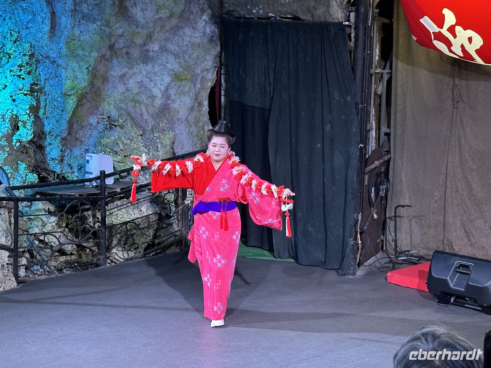Mit der Rolltreppe gelangen wir zunächst zum Haupteingang. Ab hier ist es nur noch möglich, die Höhle im Gänsemarsch zu durchqueren. An einigen Stellen wird es eng, an anderen kommen wir nur gebückt hindurch. Insgesamt legen wir etwa einen Kilometer auf einem Rundweg zurück. Die Ryugado-Höhle entstand über einen Zeitraum von etwa 175 Millionen Jahren. Während des Rundgangs bewundern wir eine Vielzahl von Stalaktiten und Stalagmiten in bizarren, farbigen Formationen, die durch Beleuchtung noch dramatischer in Szene gesetzt werden. Eines der berühmtesten Merkmale ist das sogenannte „Gefäß Gottes“. Dabei handelt es sich um ein Tongefäß aus der prähistorischen Yayoi-Zeit (ca. 300 v. Chr. bis 300 n. Chr.), das einst von Höhlenbewohnern zurückgelassen wurde. Im Laufe der Zeit wurde es durch Sinterablagerungen vollständig von Kalzit überzogen und ist so zu einem einzigartigen, steinernen Artefakt geworden.
