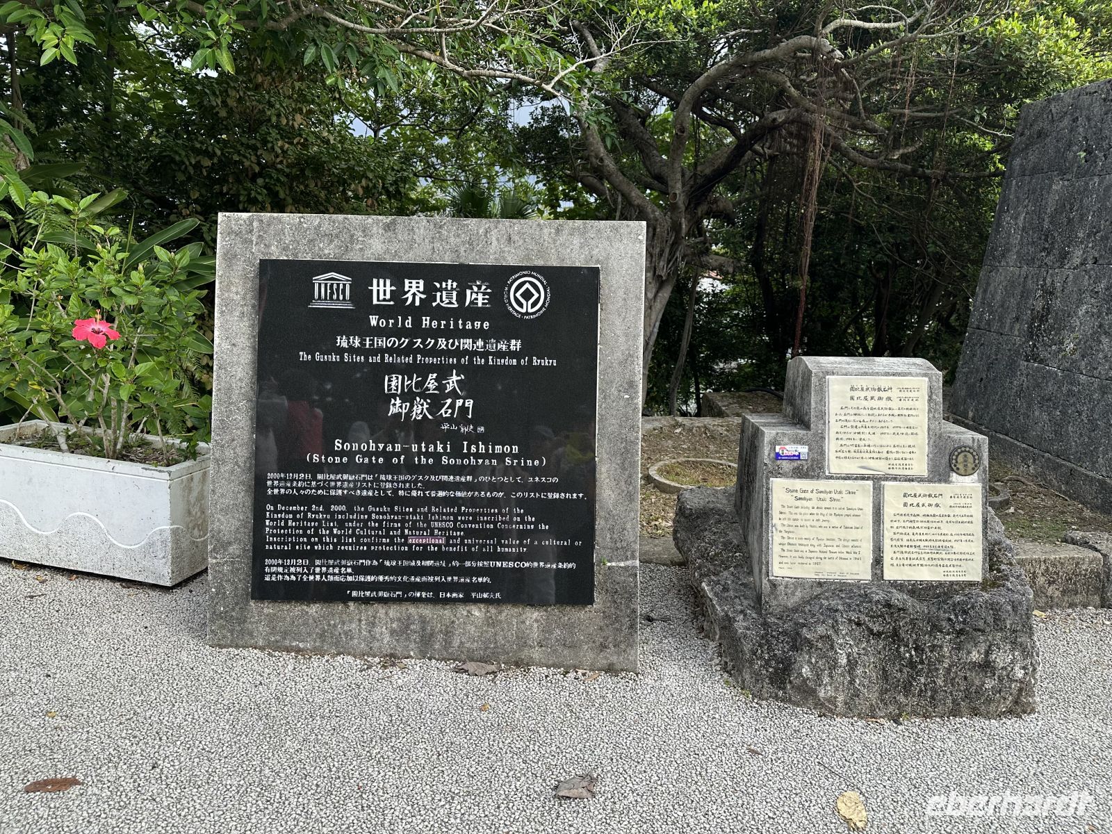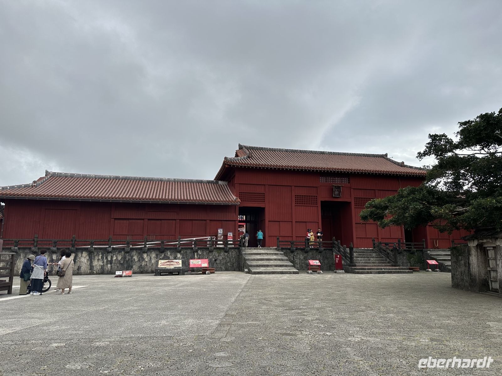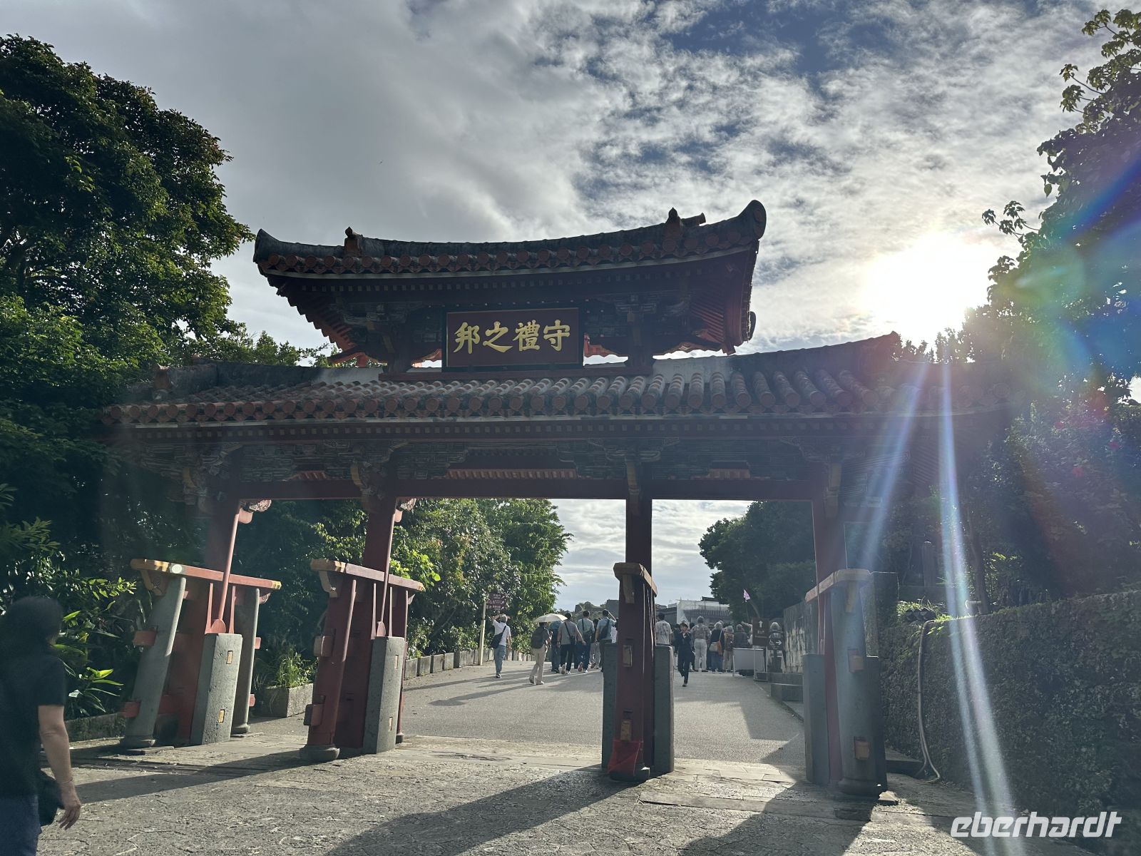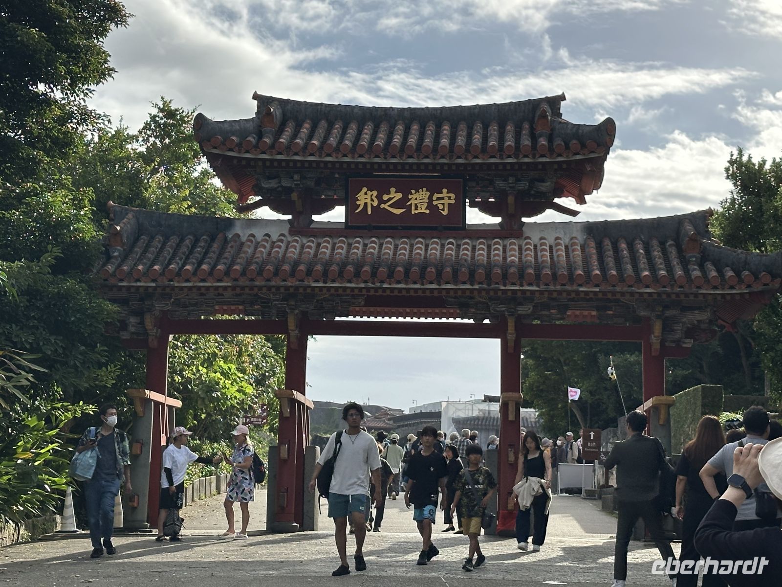 DasShurei-mon ist das berühmte, sieben Meter hohe Eingangstor mit einem leuchtend roten Ziegeldach. Es folgt das Kankai-mon, das erste Haupttor des Burginneren. Die weitläufigen Ringmauern der Burg sind vollständig erhalten und begehbar. Von hier aus haben wir einen spektakulären Ausblick auf Naha und das Meer.