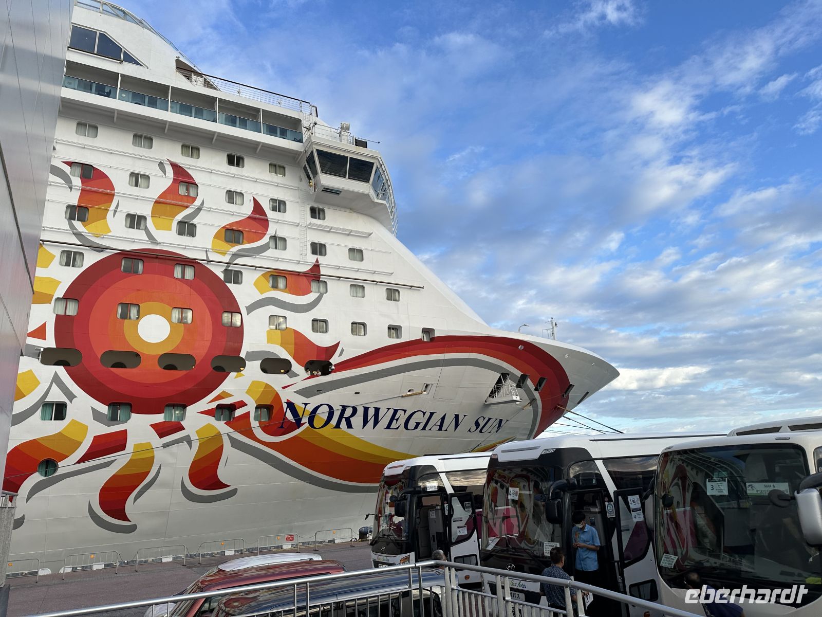 Bevor wir uns auf den Weg zum Hafen und zu unserem Kreuzfahrtschiff machen, legen wir eine individuelle Mittagspause ein. Wir besuchen noch einmal die Insadong Straße, auf der es am Tage recht lebhaft zu geht. Hier kann sich jeder nach seinem Bedarf kulinarisch versorgen. Satt und zufrieden lehnen wir uns im Bus zurück und so kommt es, dass die anderthalb Stunden Fahrt zum Kreuzfahrthafen wie im Fluge vergehen. Unser Fahrer setzt uns am Hafenterminal ab und wir nehmen unsere Koffer selbst mit ins Hafengebäude. Hier werden fehlende Kofferanhänger angebracht und die Koffer abgegeben. Mit der Rolltreppe geht es eine Etage höher, hier zeigen wir Pass und Voucher vor und werden in die Check-In Halle gebeten. An vielen Tischen sitzen fleißige Mitarbeiter, die mit uns gemeinsam den Check in erledigen. Wir bekommen unsere Bordkarten und können an Bord der Norwegian Sun gehen, unser zu Hause für die nächsten Tage. Anfangs ist es ein bisschen aufregend, wir müssen uns erst einmal orientieren, die richtige Kabine finden und herausbekommen, wo ist vorn und wo ist hinten. Gar nicht so einfach, aber überall steht Schiffspersonal, das uns hilft, den richtigen Weg zu finden. Um 17.30 Uhr treffen wir uns im Atrium und gehen gemeinsam zum Abendessen.