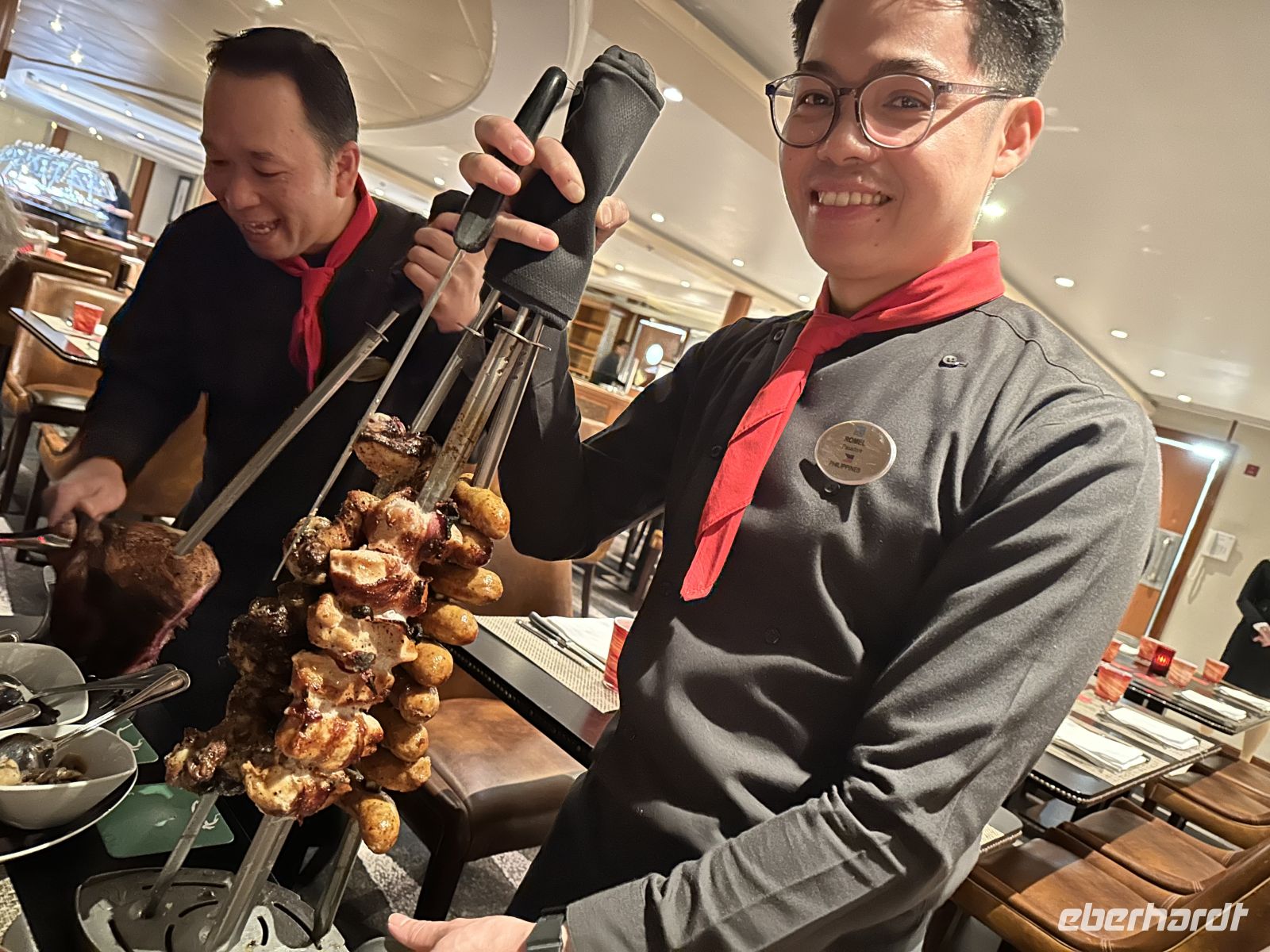 Es handelt sich um ein authentisches brasilianisches Steakhouse-Konzept, bei dem der Fleischgenuss im Mittelpunkt steht. Unser Abend beginnt an der reichlich bestückten Salatbar. Das Angebot ist so verführerisch, dass wir fast dazu neigen zu vergessen, dass es noch ein Hauptgericht gibt. Und das ist Fleisch ohne Ende. Freundliche "Passadores" (brasilianische Gaucho-Köche) kommen mit langen Spießen voller langsam gegrilltem, saftigem Fleisch direkt an unseren Tisch. Die Auswahl ist groß und umfasst verschiedene Fleischsorten, darunter: Filet Mignon (Rinderfilet), Short Ribs (Rinderrippen), Lammfleisch und Pökelbrust (Brisket). Wir werden dazu angehalten, rote und grüne Untersetzer zu benutzen, um zu signalisieren, ob wir noch mehr Fleisch wünschen oder eben nicht. Zusätzlich zum Fleisch werden warme Beilagen wie gebratener Reis, Bohnen und Saucen serviert. Zum Abschluss der Fleischgänge gibt es Ananas, die durch Grillen karamellisiert wurde und einen süßen Kontrast zum herzhaften Fleisch bietet. Dieses Restaurant verlässt garantiert niemand hungrig.
