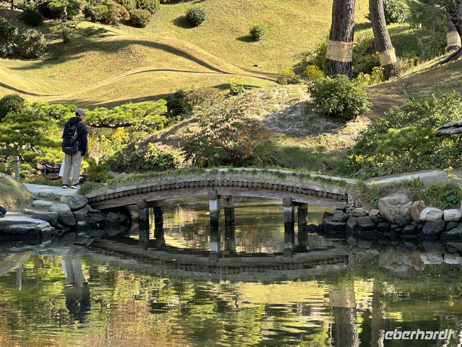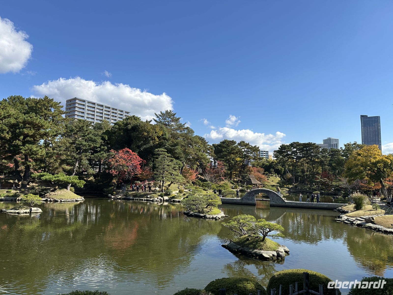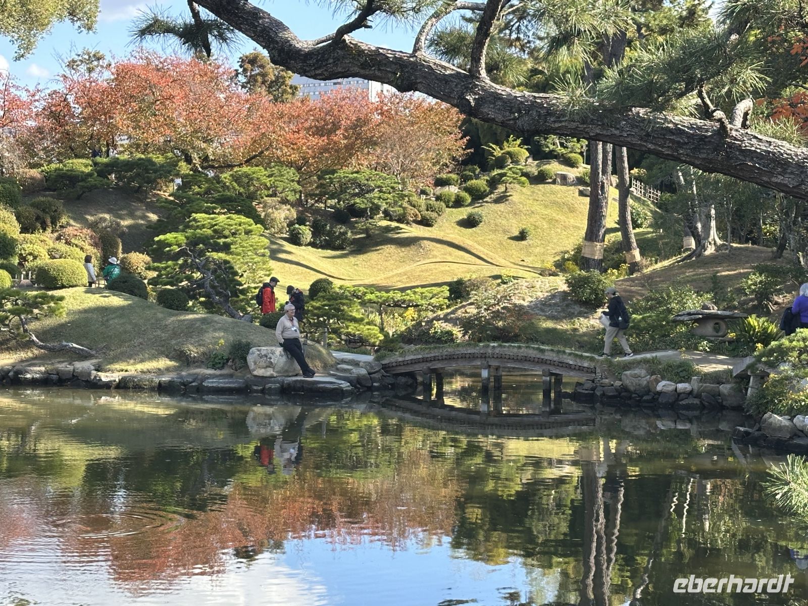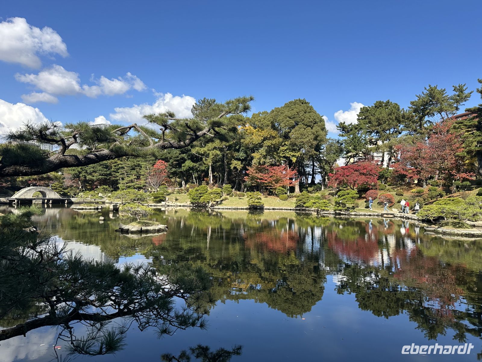 Beim anschließenden Besuch des Shukkei-en Gartens können wir uns von den Eindrücken des Vormittags etwas erholen. Der Name bedeutet übersetzt so viel wie "Garten der geschrumpften Landschaft", was sein Konzept perfekt beschreibt. Der Shukkei-en wurde bereits im Jahr 1620 von dem Teemeister Ueda Sōko im Auftrag des damaligen Feudalherrn Asano Nagaakira angelegt. Er ist ein klassischer japanischer Wandelgarten, was bedeutet, dass er so konzipiert ist, dass man ihn auf einem Rundweg um einen zentralen Teich herum erkundet. Der Garten stellt auf relativ kleinem Raum verschiedene natürliche Landschaften dar: Berge, Täler, Wälder und Seen sind durch geschickt angelegte Hügel, Pflanzen und den großen Teich Takuei im Miniaturformat nachgebildet. Das Herzstück ist der Takuei-Teich mit seinen zahlreichen kleinen Inseln, auf denen Kiefern wachsen. Die malerische, bogenförmige Steinbrücke überspannt den Teich und ist ein beliebtes Fotomotiv. Der Teich ist belebt von großen, farbenprächtigen Koi-Karpfen und zahlreichen Wasserschildkröten. Obwohl der Garten über 400 Jahre alt ist, ist er auch ein bedeutendes historisches Mahnmal: Am 6. August 1945 lag der Shukkei-en nur etwa 1,2 Kilometer vom Hypozentrum der Atombombe entfernt. Er wurde fast vollständig zerstört und die damalige Vegetation verbrannte. Einer der beeindruckendsten Zeugen der Geschichte ist ein uralter Ginkgo-Baum innerhalb des Gartens. Obwohl er schwer beschädigt und durch den Explosionswind geneigt wurde, überlebte er den Feuersturm und treibt bis heute Knospen aus. Er gilt, zusammen mit anderen Bäumen, als ein "A-Bomben-Baum" und ist ein starkes Symbol der Widerstandsfähigkeit.