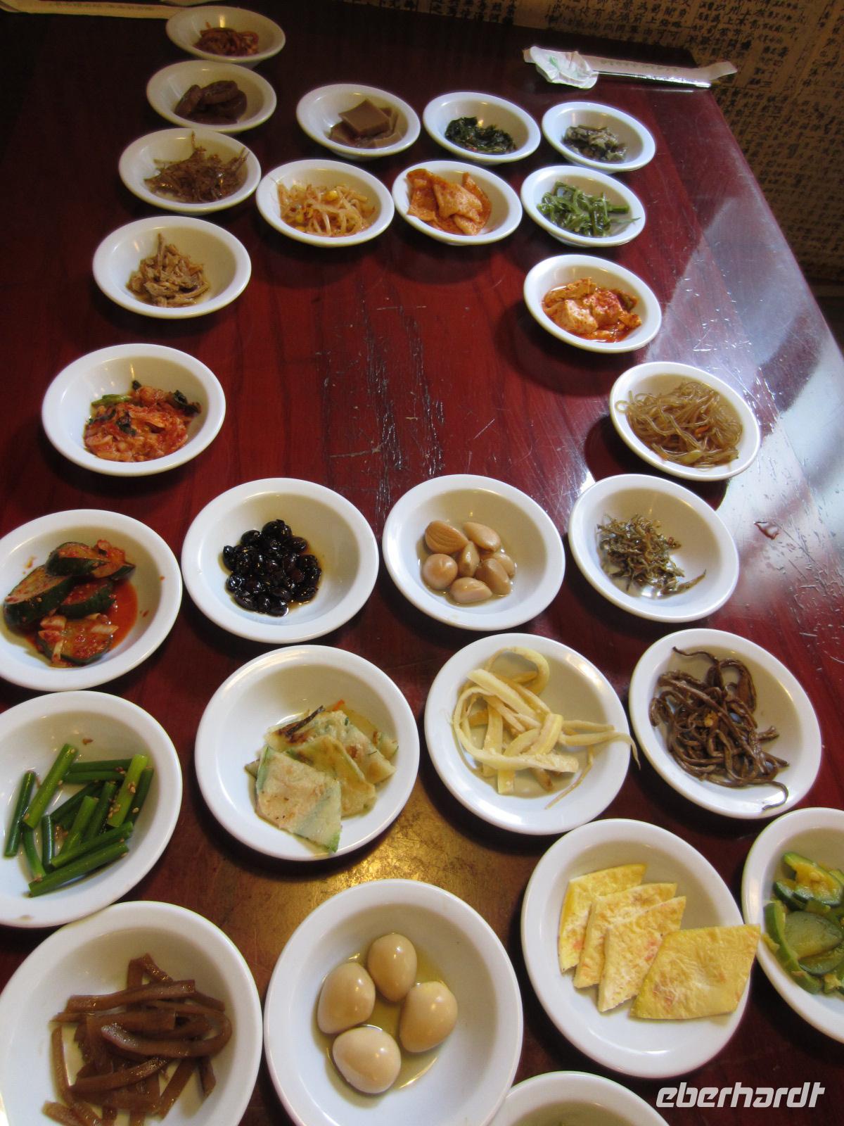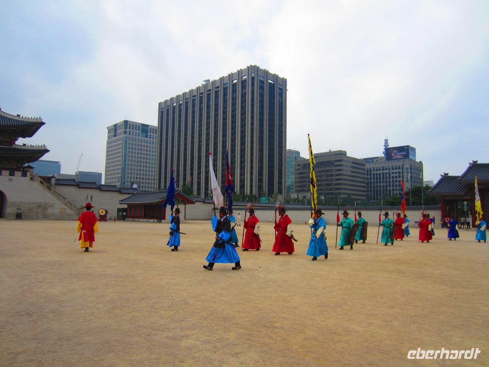 Nach einem reichhaltigen Frühstück stand heute für uns die Erkundung von Seoul auf dem Programm. Pünktlich 9.00 Uhr holten uns Maria und Fahrer Khang vom Hotel Koreana ab. Im weltberühmten Gyeongbokgung Palast konnten wir einen umfassenden Einblick in das Leben zur Zeit der Joseon-Dynastie erhalten. Bei der traditionellen Wachablöse, waren die Soldaten in Ihren bunten Landestrachten und mit interessant gestalteten Instrumenten zu erleben. Die Tempelanlage breitet sich auf einem riesigen Areal mitten im belebten Zentrum Seouls, umringt von zahlreichen Wolkenkratzern, aus. Hier wird deutlich wie nah Tradition und Moderne in Korea beieinander liegen. Wir warfen einen Blick in die einzelnen Häuser und ehemaligen Wohnzimmer und erfuhren spannende Details über die Regeln in Tempel, sowie die Bedeutung von Ying und Yang. Im Folkloremuseum waren die Geschichte Koreas, Traditionen und die Lebensweise von früher und heute anschaulich dargestellt. Nach so vielen Eindrücken wurde uns wieder einmal der Spruch „Andere Länder, andere Sitten“ sehr bewusst. Mit knurrendem Magen liesen wir uns auf den spannenden Vorschlag von Reiseleiterin Maria ein und begaben uns in ein typisches koreanischen Restaurant. In 25 kleinen Schüsseln fanden sich, neben Reis und Seetangsuppe, zahlreiche unbekannte und seltsame Häppchen. Wir waren mutig und probierten munter drauf los. Seerose, Eichel, Sardinen, Wachteleier und Glasnudeln landeten zwischen unseren Stäbchen. Gut gesättigt und wieder um eine interessante Erfahrung reicher, fuhren wir zur nächsten Station dem Hanok-Village, einem alten Dorf. Auch hier konnten wir wieder sehen, wie die Koreaner gelebt haben. Vor allem die kleinen Schlafräume, die auch als Ess- und Wohnzimmer genutzt wurden, ließen uns staunen. Am Nachmittag besichtigten wir noch das längste Holzhaus der Welt, in welchem sich hoch verehrte Ahnenschreine von Kaisern befinden und einen buddhistischen Tempel mit 3 riesigen, goldenen Buddhastatuen. Am Abend genossen wir wieder ein reichhaltiges Menü im Hotelrestaurant.