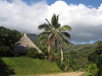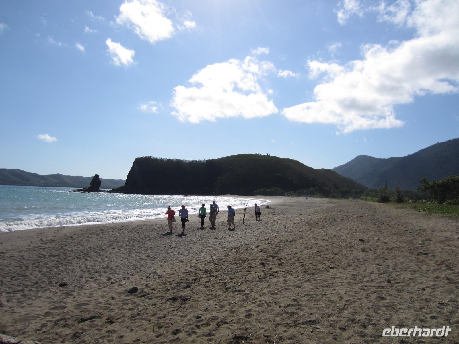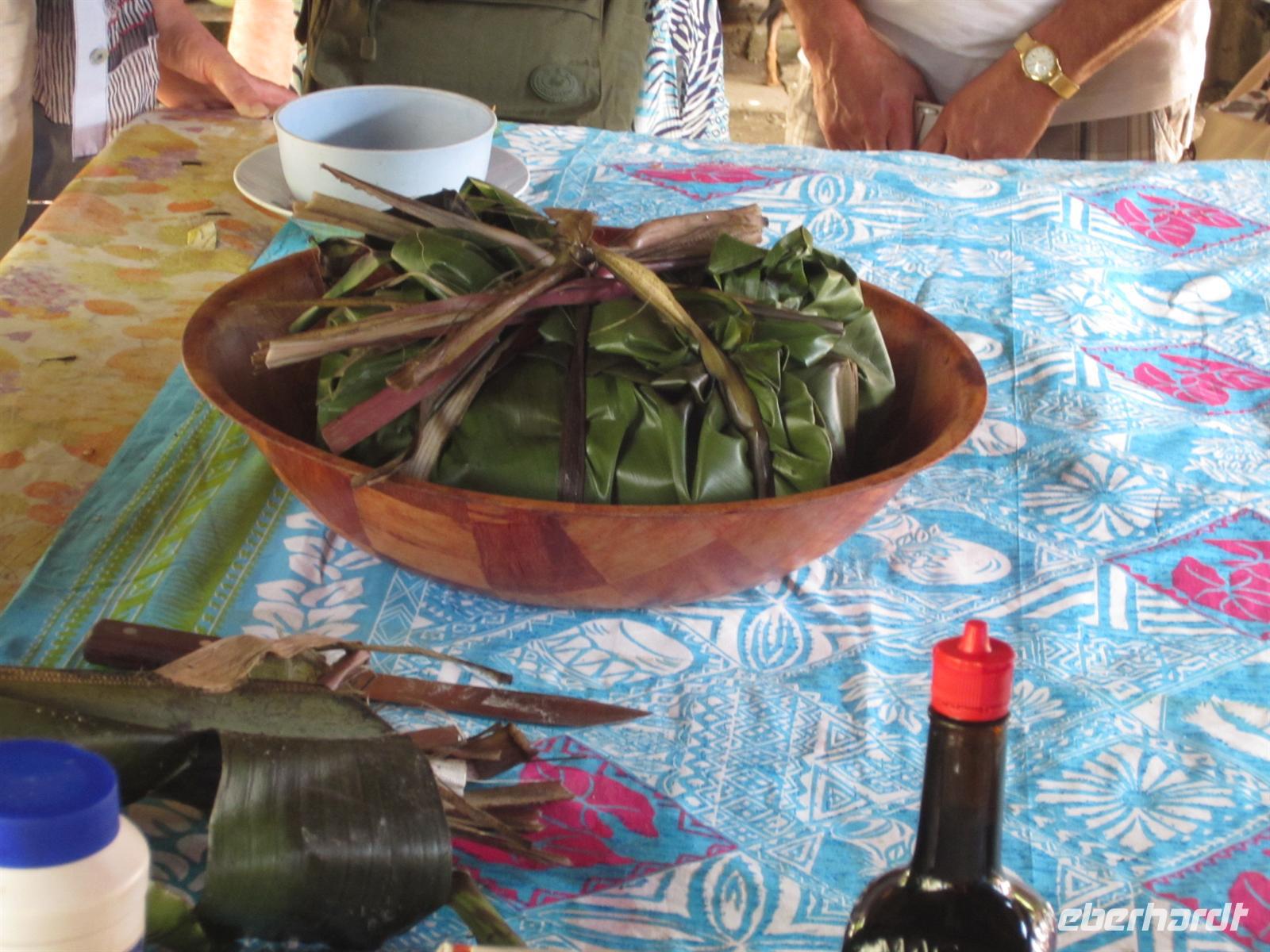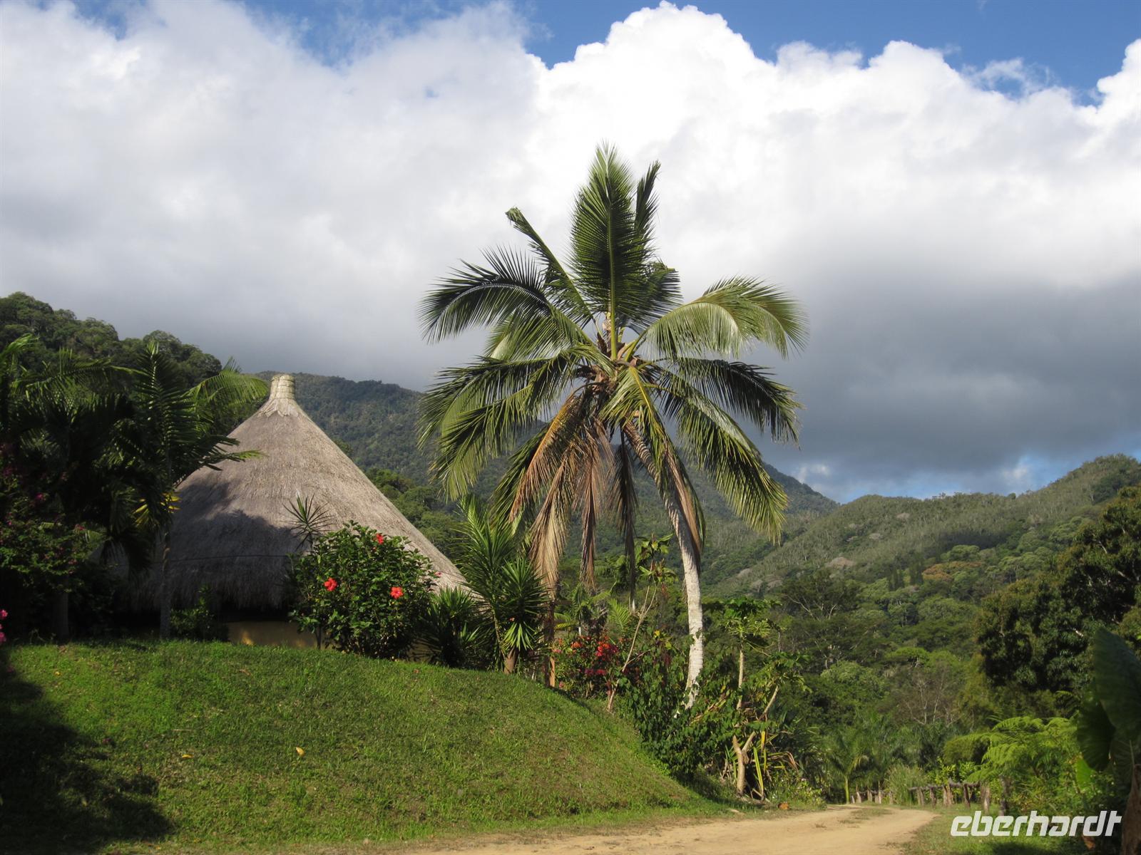 Entlang der Küstenstraße gelangten wir heute noch ein Stück weiter in den wilden Norden Neukaledoniens. Die üppige Vegetation und der Blick auf das Meer und die schroffen Felsformationen machte die kurze Fahrt zu einem wahren Augenschmaus. In Hienghene erreichten wir ein traditionelles Dorf eines Werap-Stammes. Reiseleiterin Rike trug dem Häuptling Marcial unser Anliegen vor und versicherte unsere friedlichen Absichten und unsere Achtung vor der Melanesischen Kultur. Anschließend wurde noch ein kleines Geschenk überreicht und wir wurden herzlich Willkommen geheißen im Dorf. Zunächst zeigte uns der Häuptling persönlich wie das traditionelle Gericht, die Bougna, zubereitet wird.Die Dorfbewohner leben hier in einfach Hütten aus Stroh, Bambus und Bananenblätter. Die Zubereitung von Nahrungsmitteln erfolgt über einer Feuerstelle und zum Bad muss jeder außerhalb der Hütte gehen. Doch neben dieser einfachen Lebensweise sieht man auch, dass technischer Fortschritt und moderne Entwicklungen ebenfalls Einfluss genommen haben. So sieht man Kühlschrank, Handy, Auto und Lebensmittelverpackungen aus dem Supermarkt. Der Sohn des Häuptlings machte mit uns noch einen Spaziergang durch den Wald, zeigte uns endemische Pflanzen und Früchte, den heimischen Gemüsegarten und das Fischerboot. Anschließend konnten wir noch einer Frau beim Flechten eines Korbes aus einem Bananenblatt zusehen. Nach dem Erdofenessen im Versammlungsraum, erklärte uns Marcial noch wie das traditionelle Geld hergestellt und verwendet wird. Den Nachmittag verbrachten am schönen Sandstrand unseres Hotels mit entspannen.