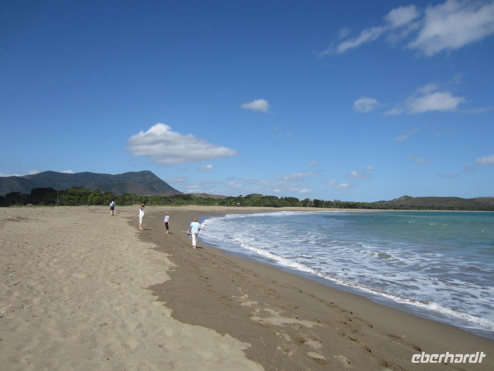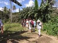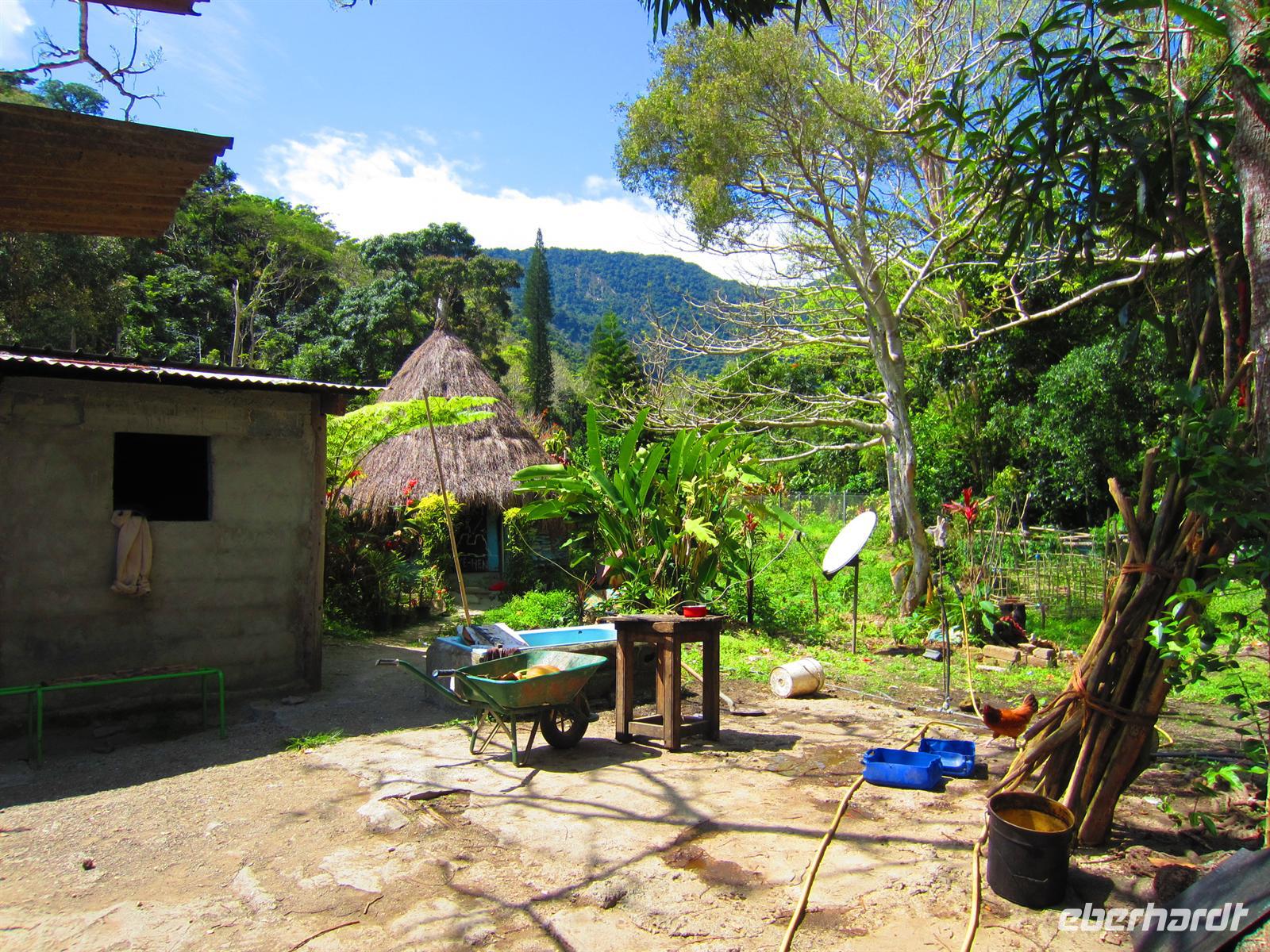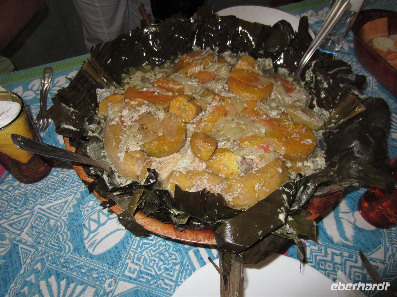 Entlang der Küstenstraße gelangten wir heute noch ein Stück weiter in den wilden Norden Neukaledoniens. Die üppige Vegetation und der Blick auf das Meer und die schroffen Felsformationen machte die kurze Fahrt zu einem wahren Augenschmaus. In Hienghene erreichten wir ein traditionelles Dorf eines Werap-Stammes. Reiseleiterin Rike trug dem Häuptling Marcial unser Anliegen vor und versicherte unsere friedlichen Absichten und unsere Achtung vor der Melanesischen Kultur. Anschließend wurde noch ein kleines Geschenk überreicht und wir wurden herzlich Willkommen geheißen im Dorf. Zunächst zeigte uns der Häuptling persönlich wie das traditionelle Gericht, die Bougna, zubereitet wird.Die Dorfbewohner leben hier in einfach Hütten aus Stroh, Bambus und Bananenblätter. Die Zubereitung von Nahrungsmitteln erfolgt über einer Feuerstelle und zum Bad muss jeder außerhalb der Hütte gehen. Doch neben dieser einfachen Lebensweise sieht man auch, dass technischer Fortschritt und moderne Entwicklungen ebenfalls Einfluss genommen haben. So sieht man Kühlschrank, Handy, Auto und Lebensmittelverpackungen aus dem Supermarkt. Der Sohn des Häuptlings machte mit uns noch einen Spaziergang durch den Wald, zeigte uns endemische Pflanzen und Früchte, den heimischen Gemüsegarten und das Fischerboot. Anschließend konnten wir noch einer Frau beim Flechten eines Korbes aus einem Bananenblatt zusehen. Nach dem Erdofenessen im Versammlungsraum, erklärte uns Marcial noch wie das traditionelle Geld hergestellt und verwendet wird. Den Nachmittag verbrachten am schönen Sandstrand unseres Hotels mit entspannen.