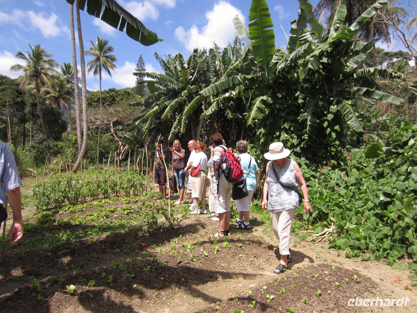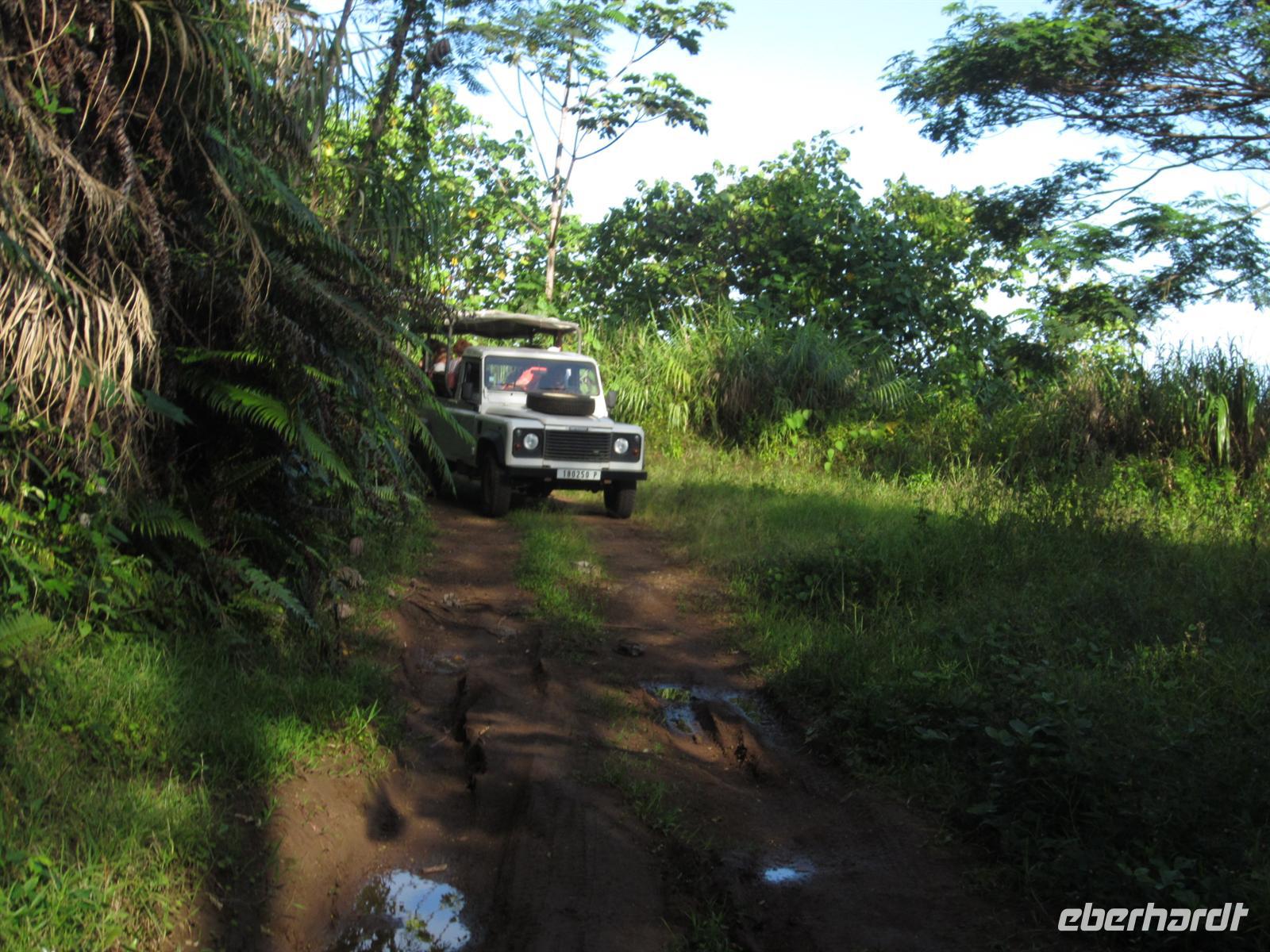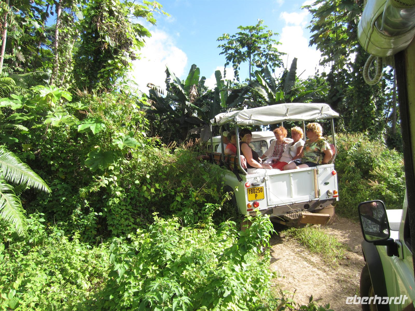 Nach dem Frühstück stand uns ein kleines Abendteuer bevor. Mit einem mit Allradantrieb ausgestatteten Geländewagen begaben wir uns im kleinen Ort Voh auf einen Aussichtspunkt. Bei der ruckeligen Fahrt hatten wir viel zu lachen und bereits schöne Ausblicke zu genießen, doch der Höhepunkt ergab sich auf dem Gipfel des Berges. Wir schauten über die gebirgige Landschaft, das himmelblaue Meer, die Mangrovenwälder, eine große Shrimpszuchtanlage und auf das Herz von Voh, eine aus Mangroven geformte Naturschönheit. Bei der Fahrt quer über die Insel änderte sich das Landschaftsbild dramatisch. Aus trockener Steppe blühte nur tropischer Wald mit hohen Bäumen, Farnen und exotischen Pflanzen auf. In der gebirgigen Landschaft wirkte das grüne Blätterdach unendlich. In Poindimie bezogen wir am Abend unsere geräumigen Bungalows im Tieti Tera Beach Resort. Auf der Terasse konnten wir alle noch mal kurz verschnaufen, bevor es auch schon wieder zum Abendessen ging.