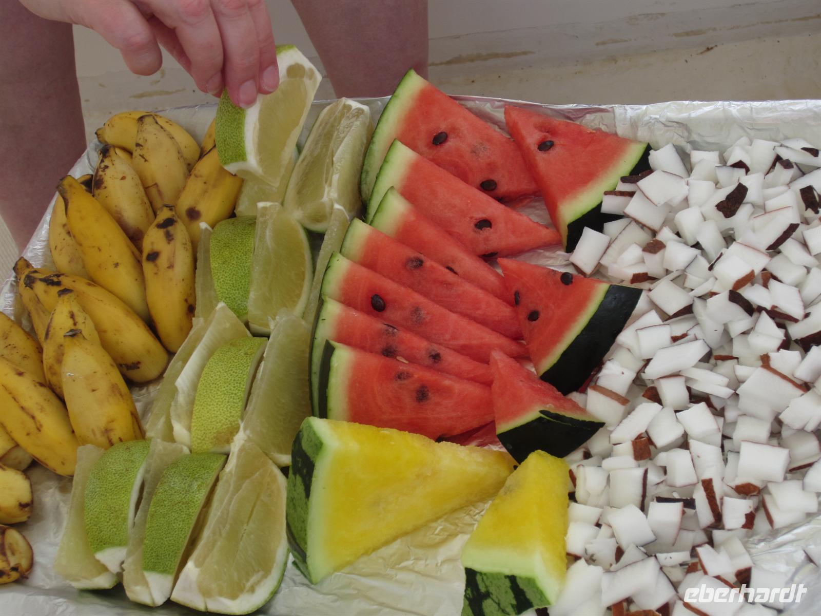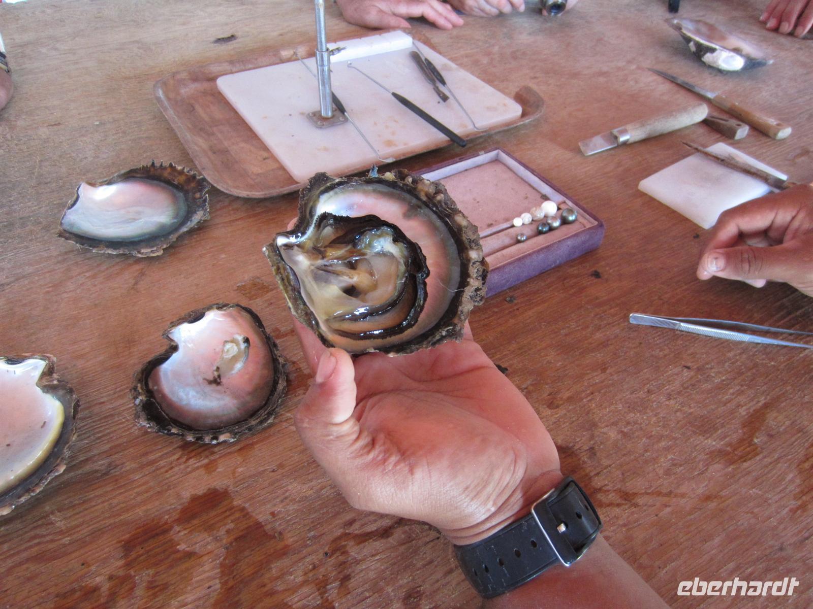 Zum Frühstück gab es heute mal kein Buffet, sondern wir wurden mit frischen Säften und wohlschmeckendem, selbstgemachtem Essen am Tisch bedient. Gut gestärkt brachen wir zu einer weiteren Bootstour zur Vanilleinsel Tahaa auf. Bei einem Motu machten wir einen Stop, um in einem Korallenriff schnorcheln zu gehen. Bunte Fische, wie zum Beispiel der gemeine Picassofisch, schwammen quirlig zappelnd durch Ihre Unterwasserwelt. Anschließend besuchten wir eine Perlenfarm, wo wir das Geheimnis der schwarzen Perle lüfteten und von unserem Bootsführer mit zarten Ukulelenklängen unterhalten wurden. Gegen Mittag fuhren wir in die , wo wir mit unserem Boot anlegten und per Jeep weiterfuhren. Auf einer Vanilleplantage wurde uns erklärt, wie der Anbau und der Ernteprozess funktionieren. Bei Edwin, dem Besitzer der Plantage, waren wir heute zum Mittagessen eingeladen und die Familie bewirtete uns herzlich mit typischen Speisen. Gut gestärkt stiegen wir wieder in unsere Jeeps und begaben uns auf eine abenteuerliche Fahrt in die Berge, wo wir am Ende mit einem traumhaften Ausblick belohnt wurden. Unser Reiseleiter zeigte uns verschiedene Pflanzenarten und das traditionelle Öffnen und Raspeln der Kokosnuss. Anschließend ging es ruckelnd durch den Urwald wieder hinunter zur Bucht und mit dem Boot zurück nach Raiatea. Nach diesem erlebnisreichen Tag, hatten wir uns unser Abendmenü redlich verdient.