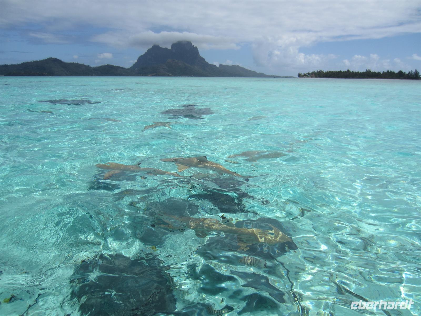 Heute wollten wir Bora Bora und die herrliche Lagune vom Boot aus entdecken. Unsere beiden lustigen Bootsführer Fabienne und Thomas erwarteten uns bereits mit heiteren Sprüchen und zarten Ukulelenklängen. Und nach kurzer Fahrt kam es auch schon zur ersten Mutprobe des Tages. In der Nähe des Riffs trafen wir auf zahlreiche Stachelrochen und Schwarzflossenriffhaie, die von den beiden Männern noch mit Fischfleisch extra zu uns gelockt wurden. Wir bissen die Zähne zusammen und so wagten sich einige Mutige mit den Meeresbewohnern ins Wasser. Anschließend begaben wir uns zum Schnorcheln in einen Korallengarten, wo wir wieder viele bunte Fische, sowie auch einen Barrakuda und Moränen sehen konnten. Nach dem wir aufgrund eines Motorschadens, zwischenzeitlich entspannt auf dem Meer trieben, wechselten wir das Boot und begaben uns auf eines der vielen Motus. Hier genossen wir ein Picknick bestehend aus Reis, Fisch und Hühnchenfleisch, Gemüse und Obst.Kaum verdaut ging es auch schon mit der nächsten Mutprobe weiter. In einem in der Lagune angelegten Becken, welches man Lagoonarium nennt, schwammen Schildkröten, Haie, Rochen und andere Fischarten. Hier konnte man einen Rochen im Arm halten und durch ein 10 Meter tiefes Becken voll mit Haien schwimmen. Das war dann erstmal genug Nervenkitzel und so ließen wir den Ausflug mit einer Fahrt rund um die Insel ausklingen. Am Abend gab es im Hotel ein leckeres Buffet, sowie eine kleine Tanzshow zu genießen.