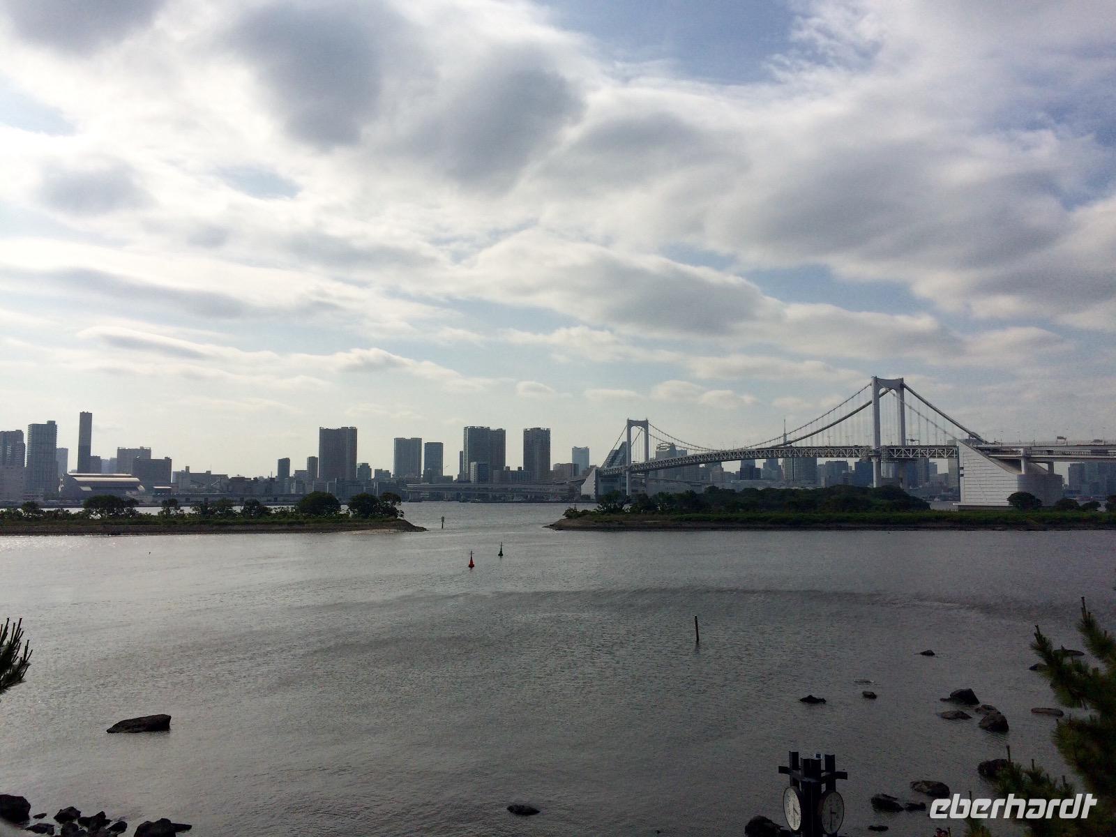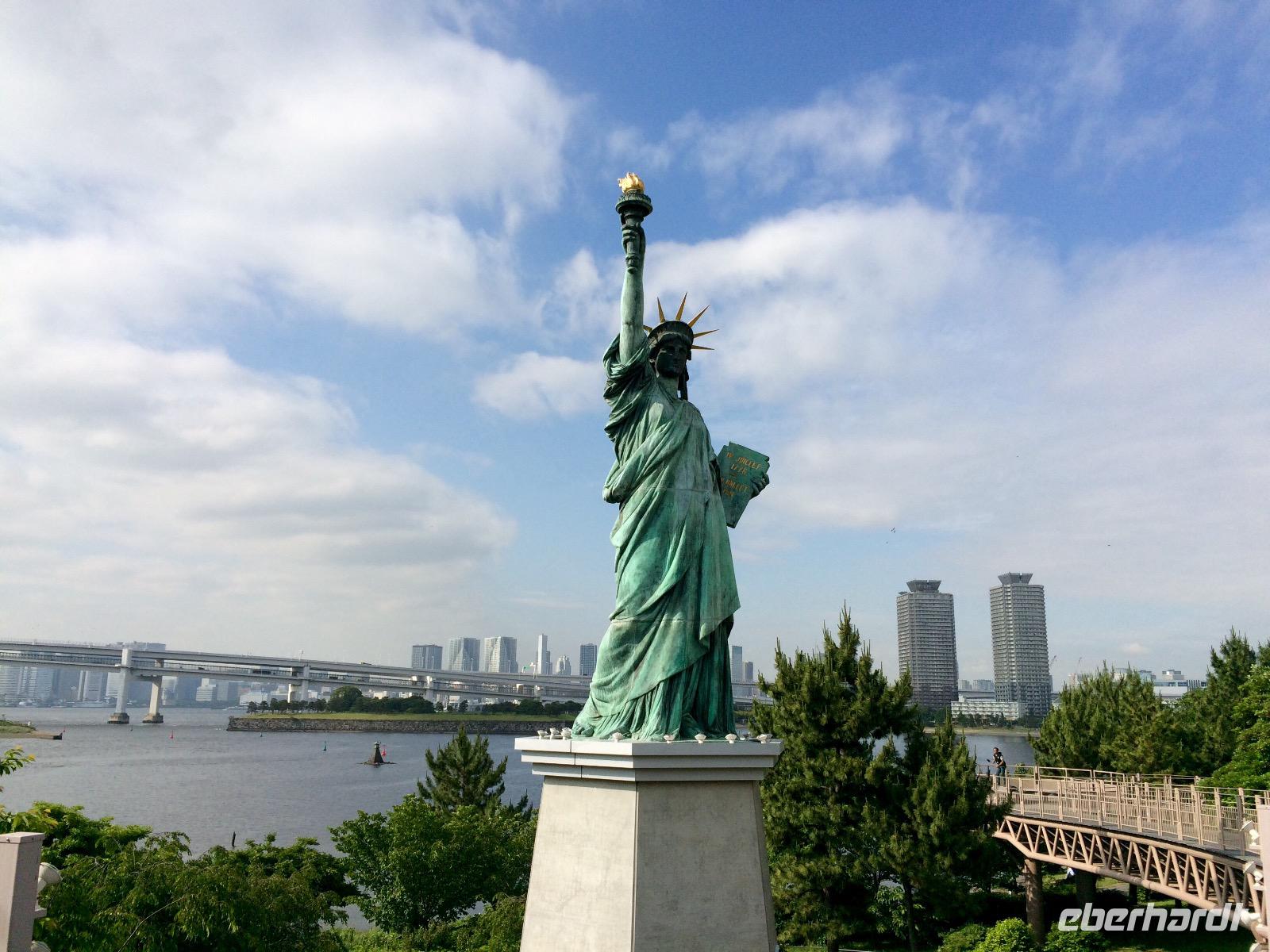 Nach einer kleinen Erfrischungspause erleben wir die japanische Gemütlichkeit bei einem Ausflug mit der Metro auf die Vergnügungsinsel Odaiba kennen. Absolut pünktliche Metro, moderne futuristische Architektur, breite Straßen, überall Fußgängerüber- und -unterführungen sowie fröhliche SchülerInnen in Uniform sind unsere erste Begegnungen. Wir genießen einen wunderschönen Blick auf die Skyline Tokios. Auch die Freiheitsstatue in Miniatur lässt grüßen.