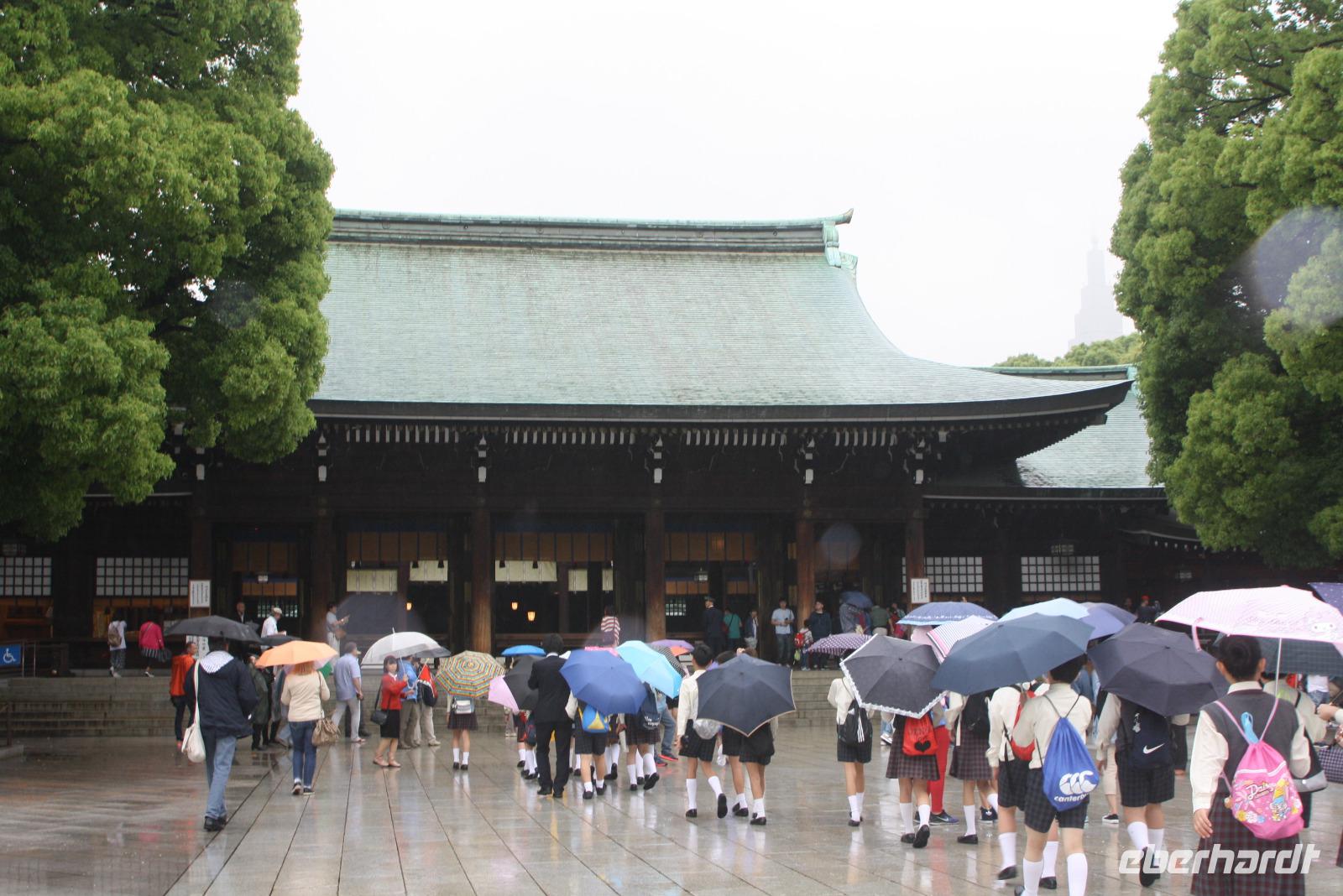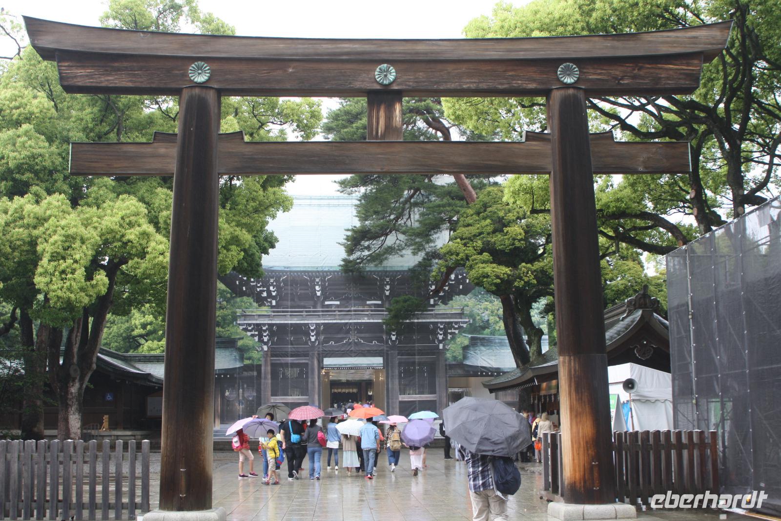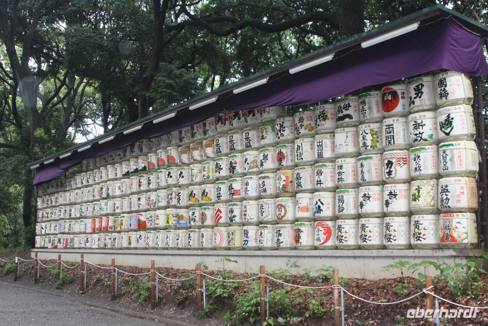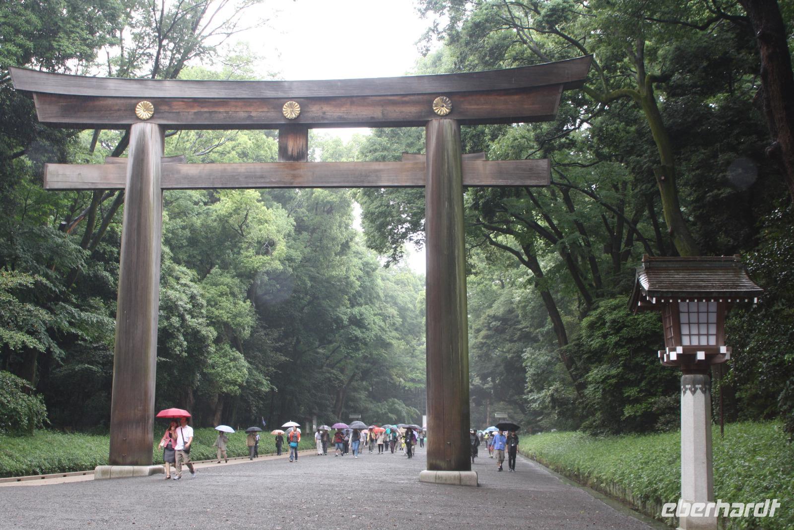 Mit dem Bus drehen wir die ersten Runden durch die Präfektur Tokio. Die Stadt aus Beton steht hauptsächlich auf künstlich aufgeschüttetes Land, das früher ein gigantisches Moorgebiet war. Tokio heißt die östliche Kaiserstadt, da der Kaiser die Hauptstadt von Kyoto nach Tokio verlegte. Bei der Fahrt durch die breiten Boulevards merkt man der Stadt nicht an, dass sie schon vier Mal fast komplett zerstört wurde. Zwei Mal als sie noch Edo hieß, einmal durch das Erdbeben von 1923, wo 60% Tokios einstürzte und durch den Bombenangriff der USA 1944, wo sogar 90% dem Erdboden gleich gemacht wurden. Die ehemaligen Holzgebäude wurden durch Stahlbeton ersetzt, doch lehnen sich an deren alten Konstruktionsweise, um erdbebenresistent zu bleiben. Heute bestaunen wir die 36 Millionen Metropole mit offenen Mündern, die immer größer werden, als wir entlang des Wirrwarrs der zahlreichen aufwendig aufeinander errichteten Schnellstraßen und Bahnlinien fahren. Vorbei am Edelviertel Shinjuku halten wir am Meiji-Schrein. Wir spazieren durch die grüne Lunge Tokios, in dem die Gedenkstätte des Meiji-Kaisers versteckt ist. Am Eingang befinden sich riesige Reisweinfässern mit edlen Tropfen des Sakes gefüllt. Auf der gegenüberliegenden Seite stehen Rotweinfässern mit köstlichem französischem Wein zu Ehren des ehemaligen Meiji-Kaisers, der gern Rotwein trank. Vor dem Beschreiten des riesigen Holztores hören wir von Mythen und Legenden über die Entstehung des japanischen Volkes, die von den Sonnengöttern abstammen. Dabei erfahren wir auch die Stellung des Mannes in der japanischen Geschichte und Gegenwart. Alle Kaiser sind als Gottheit anzusehen und den japanischen Kaiser gibt es inzwischen schon in der 128. Generation.
