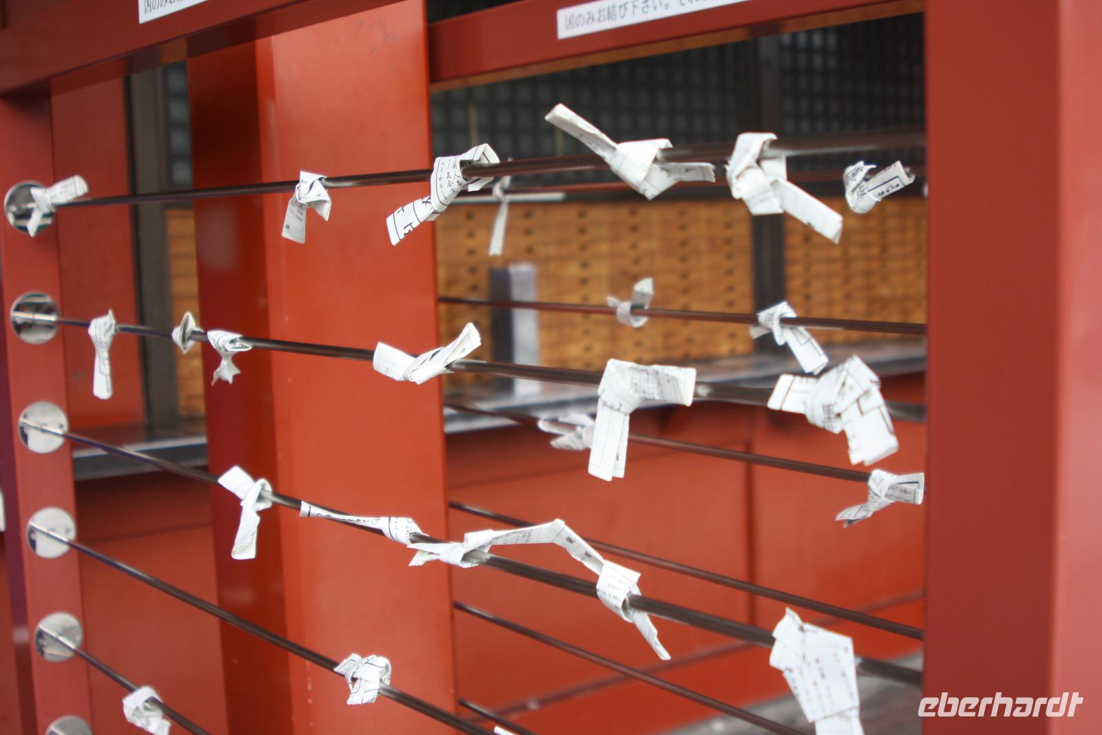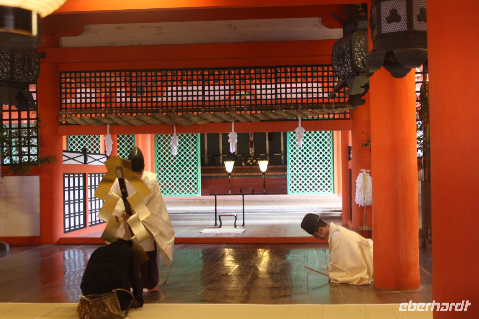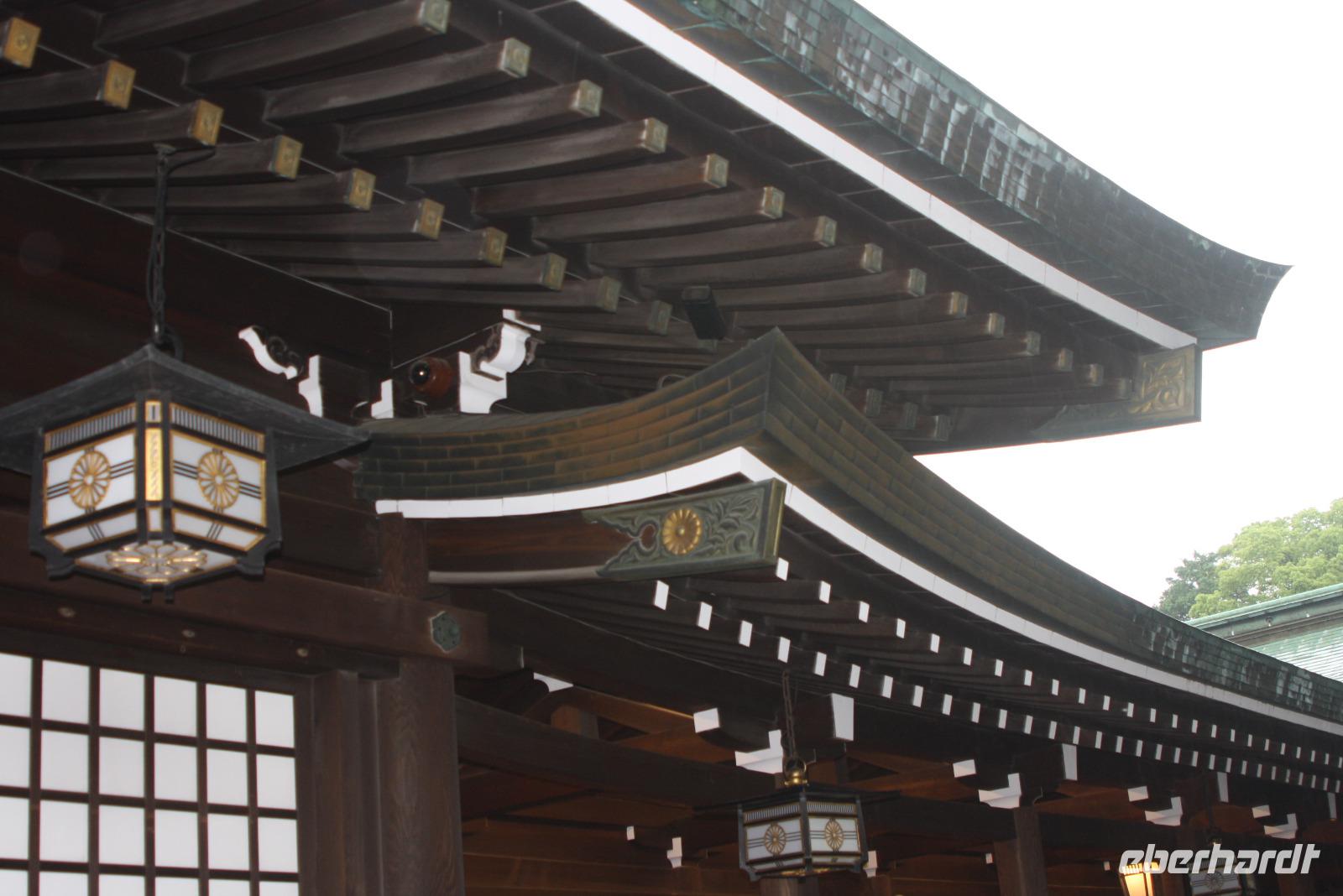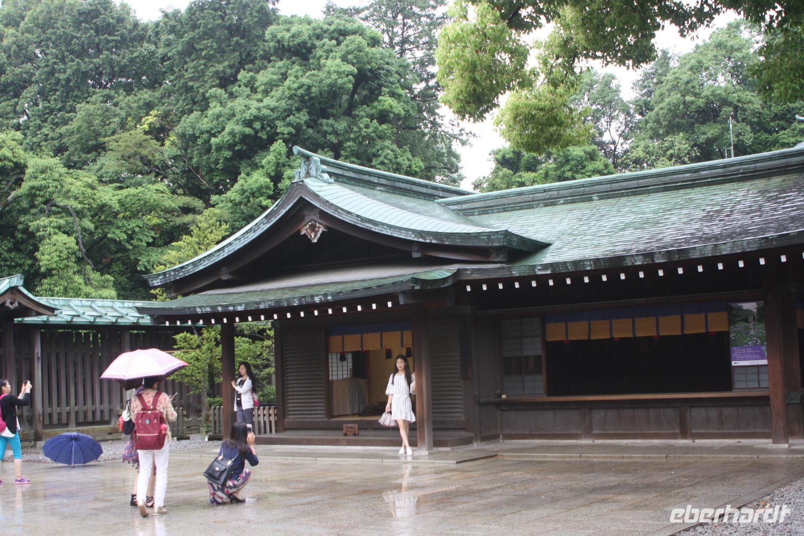 Zwei gigantische Buddhibäume von 900 Jahren haben auch die Brände am Schrein überstanden und gelten heute als heilige Bäume. Unter den Dächern dürfen wir Zeugen eines japanischen Brautpaares in Seidenkimonos werden. In Asien heißt es, wenn es nach der Trauung regnet, wird es eine sehr gute Ehe, denn Regen steht für Leben und Fruchtbarkeit. So scheint es der Himmel gut mit dem Paar zu meinen, denn genau als wir Unterschlupf im Schrein finden, regnet es in starken Strömen. Das wird wohl eine sehr fruchtbare Ehe werden...
