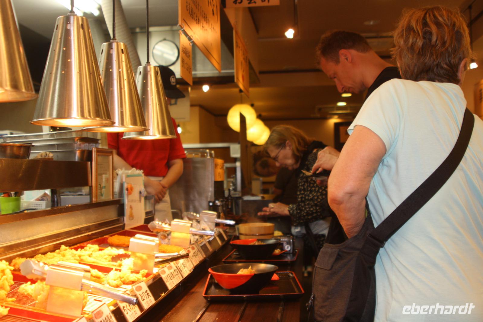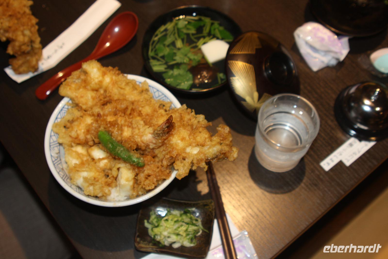 Nach so einem erlebnisreichen Tag und dem Shoppingtrip auf der Nakamise-Straße bringt Anh unsere hungrigen Gäste zu einem mehrfach ausgezeichneten Restaurant, das sich auf Tempura-Gerichte spezialisiert. Es gibt frittierte Riesengarnelen und Süßwasseraal im Spezialmehlmantel, dazu Gourmetreis mit Tempura-Teriyaki-Soße... Yummie! Kerstin und Oliver vernaschen heute ebenfalls Unagi (Aal), jedoch gegrill und nicht Tempura. Auch lecker!