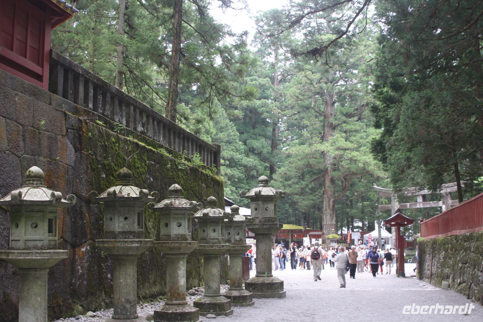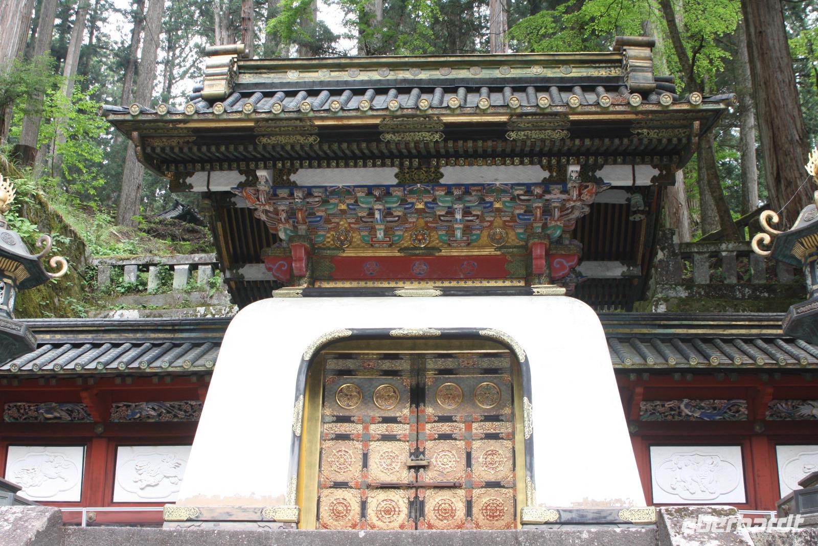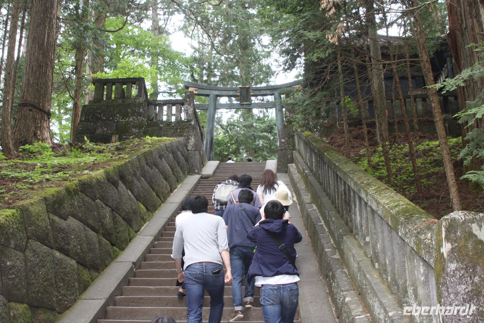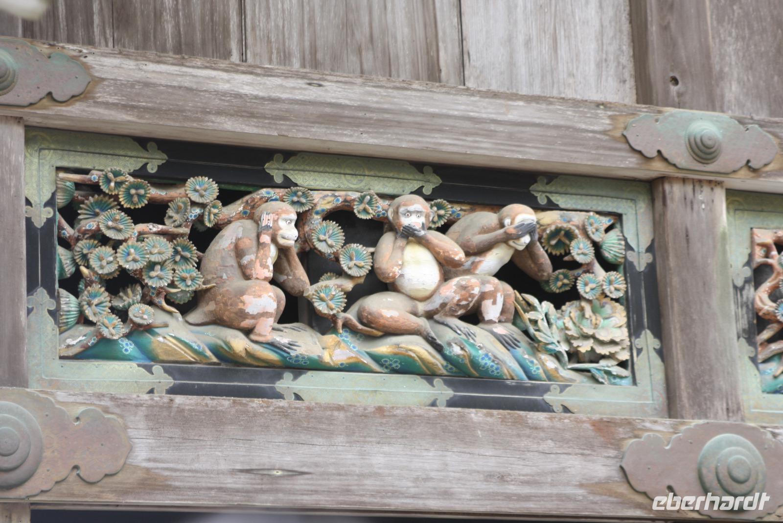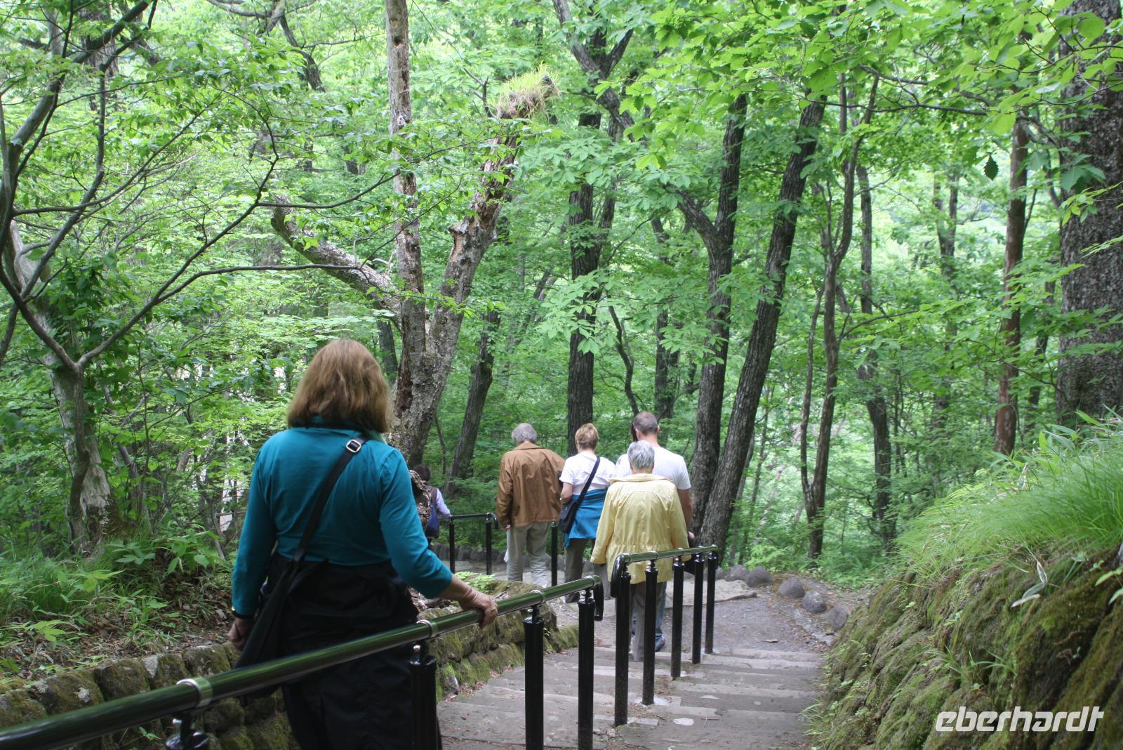 Entlang zahlreicher Serpentinen erreichen wir den Kirifuri-Wasserfall, einer von sechs Wasserfällen im Nikko-Nationalpark. Anschließend besichtigen wir im verschlafenen Nikko (es sind ja nur 100.000 Einwohner) das bedeutendste Heiligtum inmitten eines riesigen Zypressenwaldes, den Toshoga-Schrein, mit seinen 36 Bauten sowie dem Wahrzeichen der drei Affen, welche die Gebote repräsentieren: "Schaue nichts Böses, höre nichts Böses, sprich nichts Böses." Beeindruckt sind wir von der Genialität der Bauwerke: der Baustil der Ziehharmonika dient als natürliche Klimaanlage, die schönen Verzierungen aus Gold reflektieren Licht und verleihen den Räumen somit mehr Helligkeit. Wenn die Konditionen reichen, steigt man viele Stufen hoch zum Mausoleum wo der erster Shohun Shokogawa begraben wurde. Für die Japaner selbst ist dieser Schrein so etwas wie Neuschwanstein bzw. Sansoucci für die Deutschen.