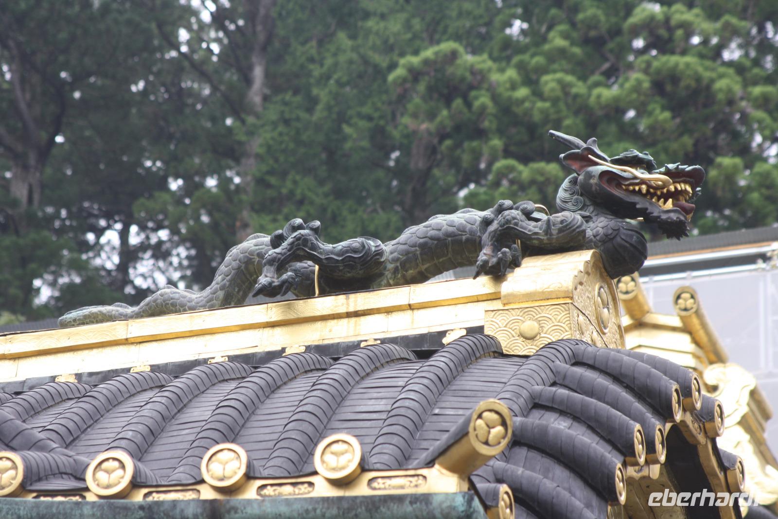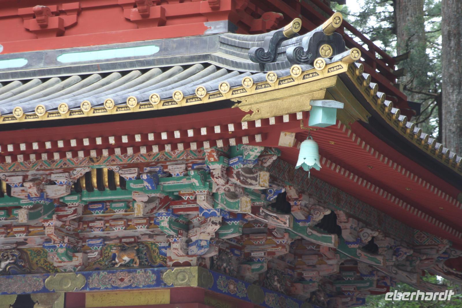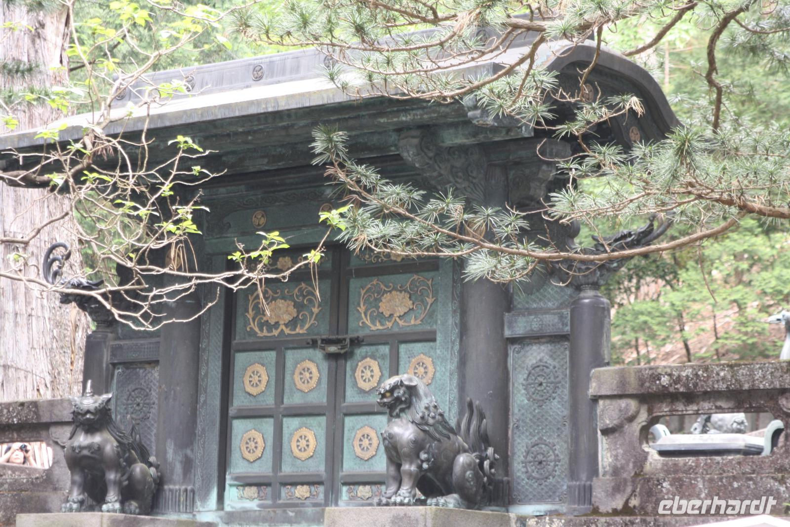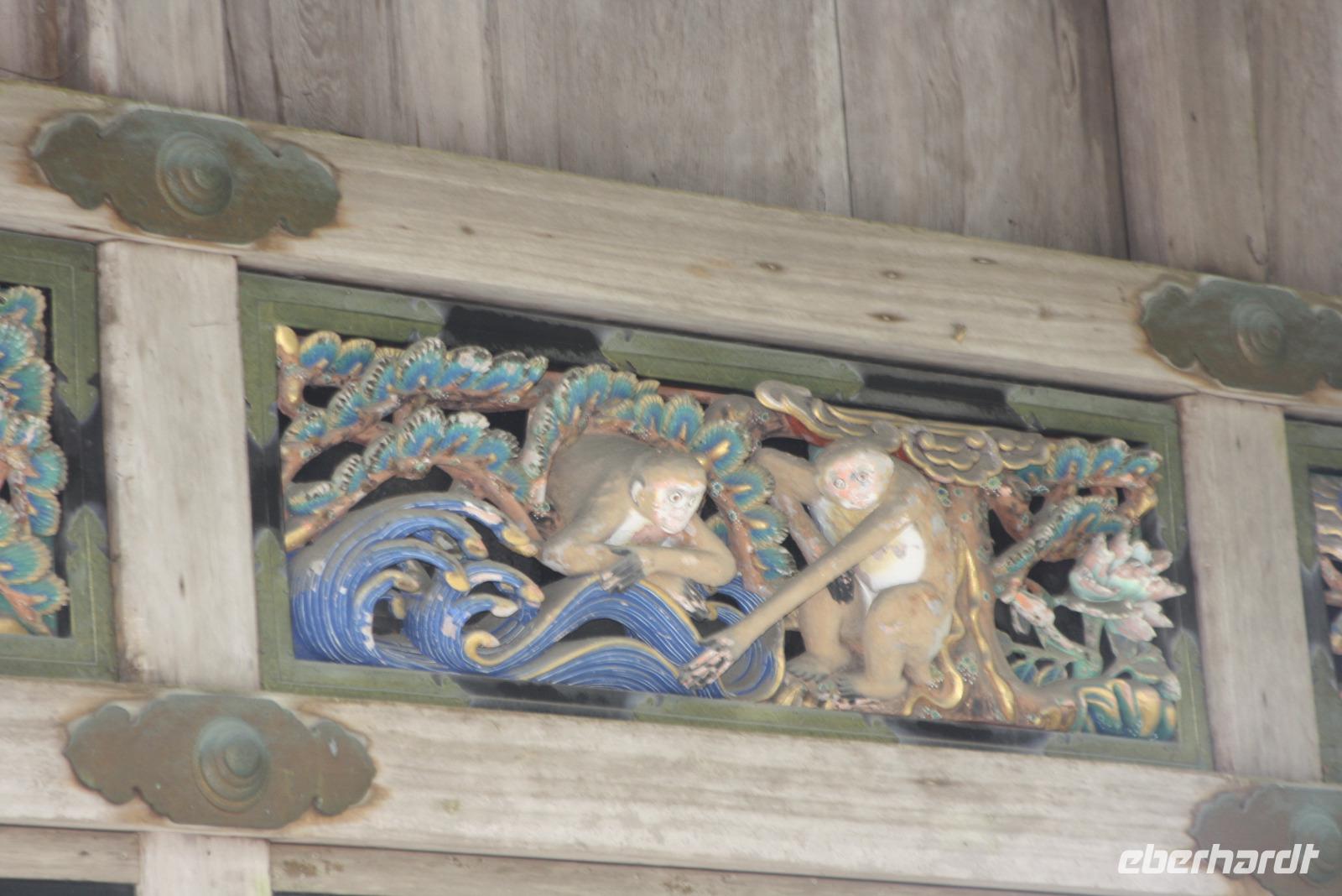 Entlang zahlreicher Serpentinen erreichen wir den Kirifuri-Wasserfall, einer von sechs Wasserfällen im Nikko-Nationalpark. Anschließend besichtigen wir im verschlafenen Nikko (es sind ja nur 100.000 Einwohner) das bedeutendste Heiligtum inmitten eines riesigen Zypressenwaldes, den Toshoga-Schrein, mit seinen 36 Bauten sowie dem Wahrzeichen der drei Affen, welche die Gebote repräsentieren: "Schaue nichts Böses, höre nichts Böses, sprich nichts Böses." Beeindruckt sind wir von der Genialität der Bauwerke: der Baustil der Ziehharmonika dient als natürliche Klimaanlage, die schönen Verzierungen aus Gold reflektieren Licht und verleihen den Räumen somit mehr Helligkeit. Wenn die Konditionen reichen, steigt man viele Stufen hoch zum Mausoleum wo der erster Shohun Shokogawa begraben wurde. Für die Japaner selbst ist dieser Schrein so etwas wie Neuschwanstein bzw. Sansoucci für die Deutschen.
