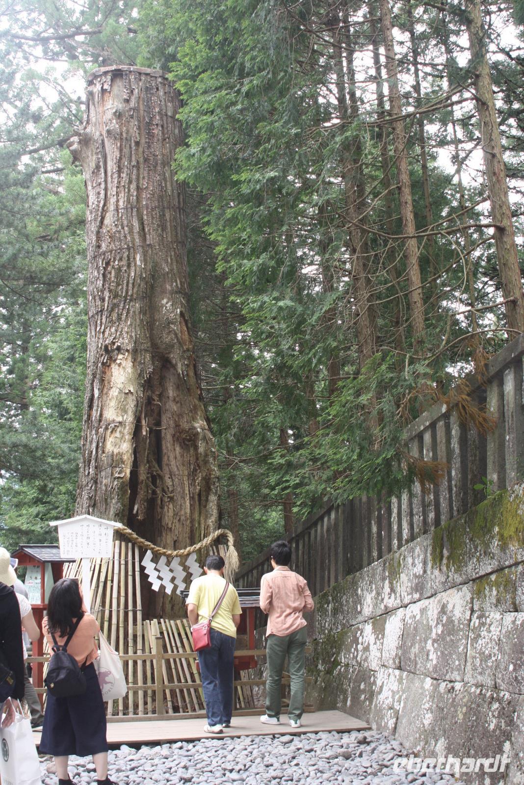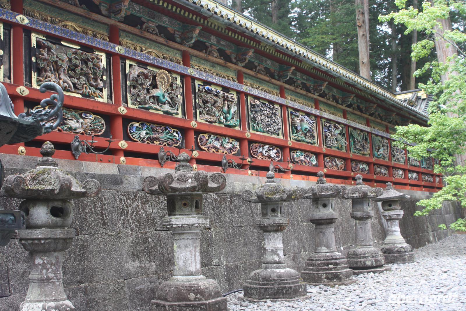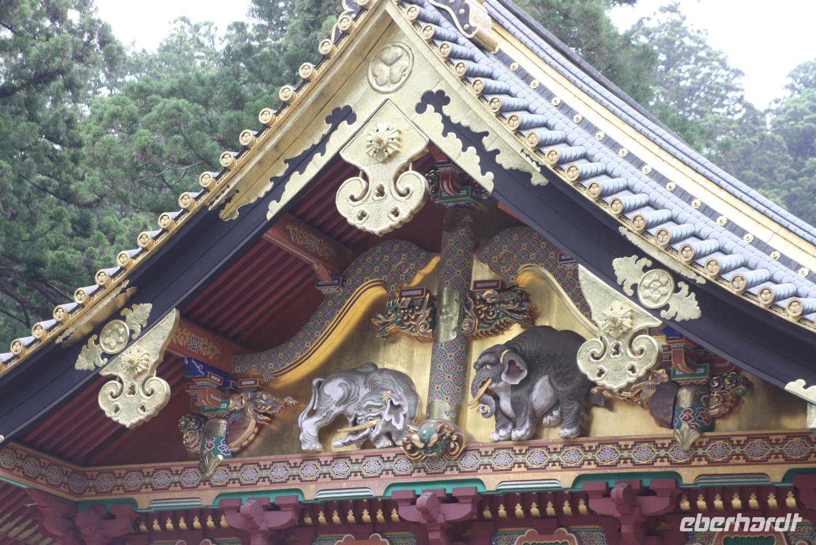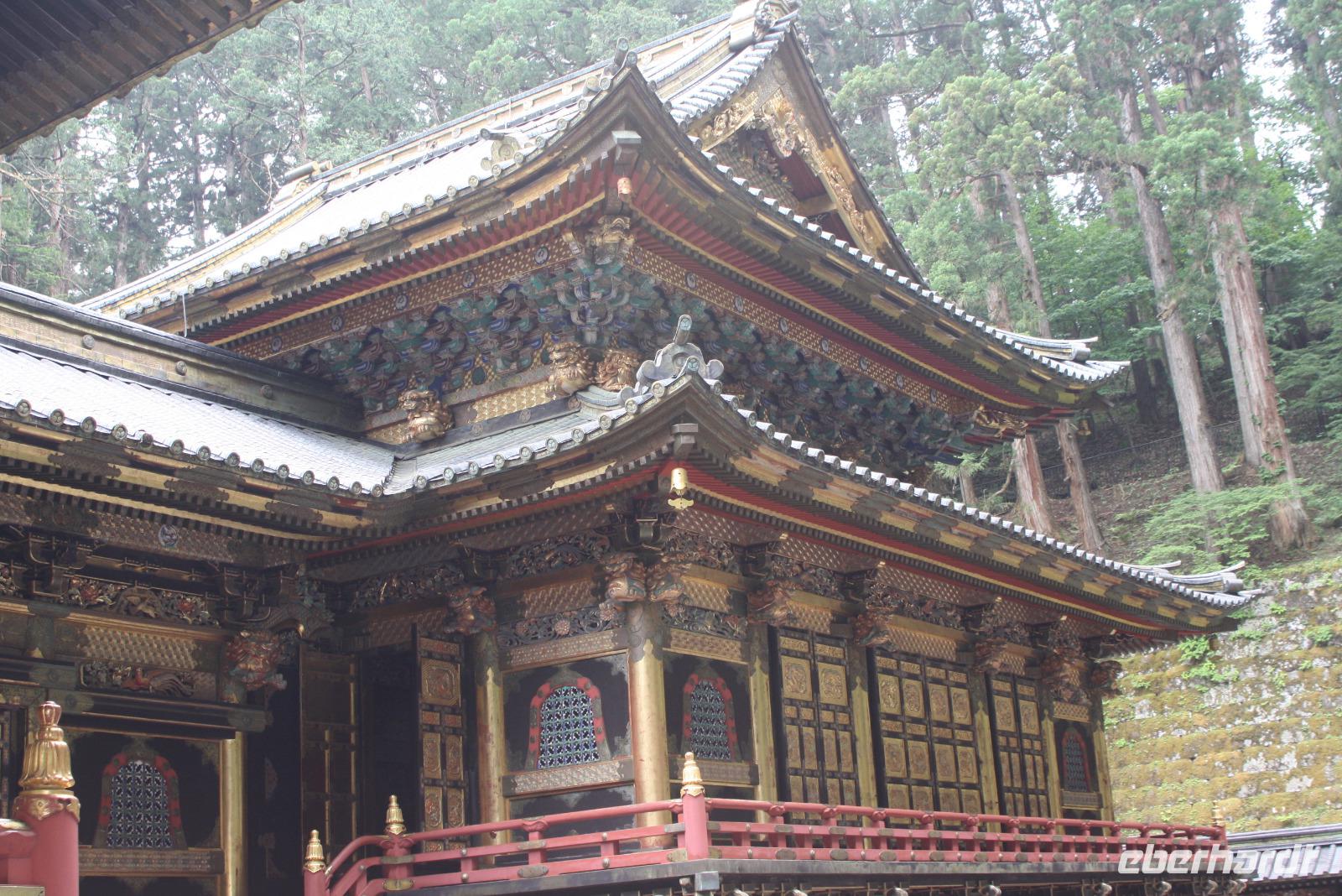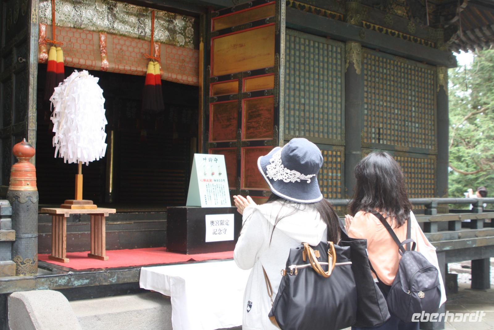 Entlang zahlreicher Serpentinen erreichen wir den Kirifuri-Wasserfall, einer von sechs Wasserfällen im Nikko-Nationalpark. Anschließend besichtigen wir im verschlafenen Nikko (es sind ja nur 100.000 Einwohner) das bedeutendste Heiligtum inmitten eines riesigen Zypressenwaldes, den Toshoga-Schrein, mit seinen 36 Bauten sowie dem Wahrzeichen der drei Affen, welche die Gebote repräsentieren: "Schaue nichts Böses, höre nichts Böses, sprich nichts Böses." Beeindruckt sind wir von der Genialität der Bauwerke: der Baustil der Ziehharmonika dient als natürliche Klimaanlage, die schönen Verzierungen aus Gold reflektieren Licht und verleihen den Räumen somit mehr Helligkeit. Wenn die Konditionen reichen, steigt man viele Stufen hoch zum Mausoleum wo der erster Shohun Shokogawa begraben wurde. Für die Japaner selbst ist dieser Schrein so etwas wie Neuschwanstein bzw. Sansoucci für die Deutschen.
